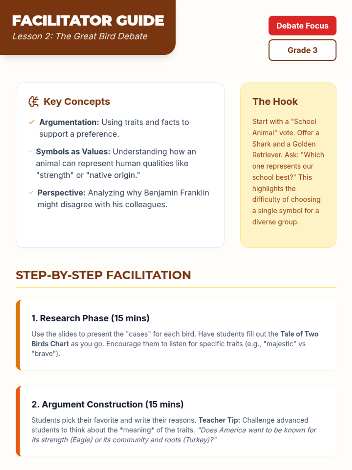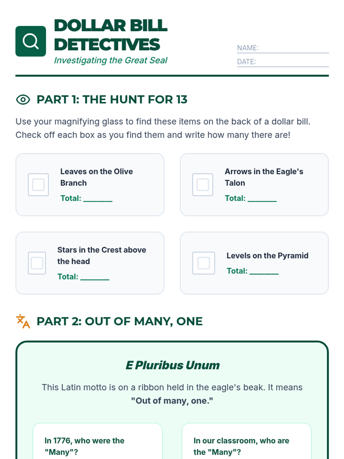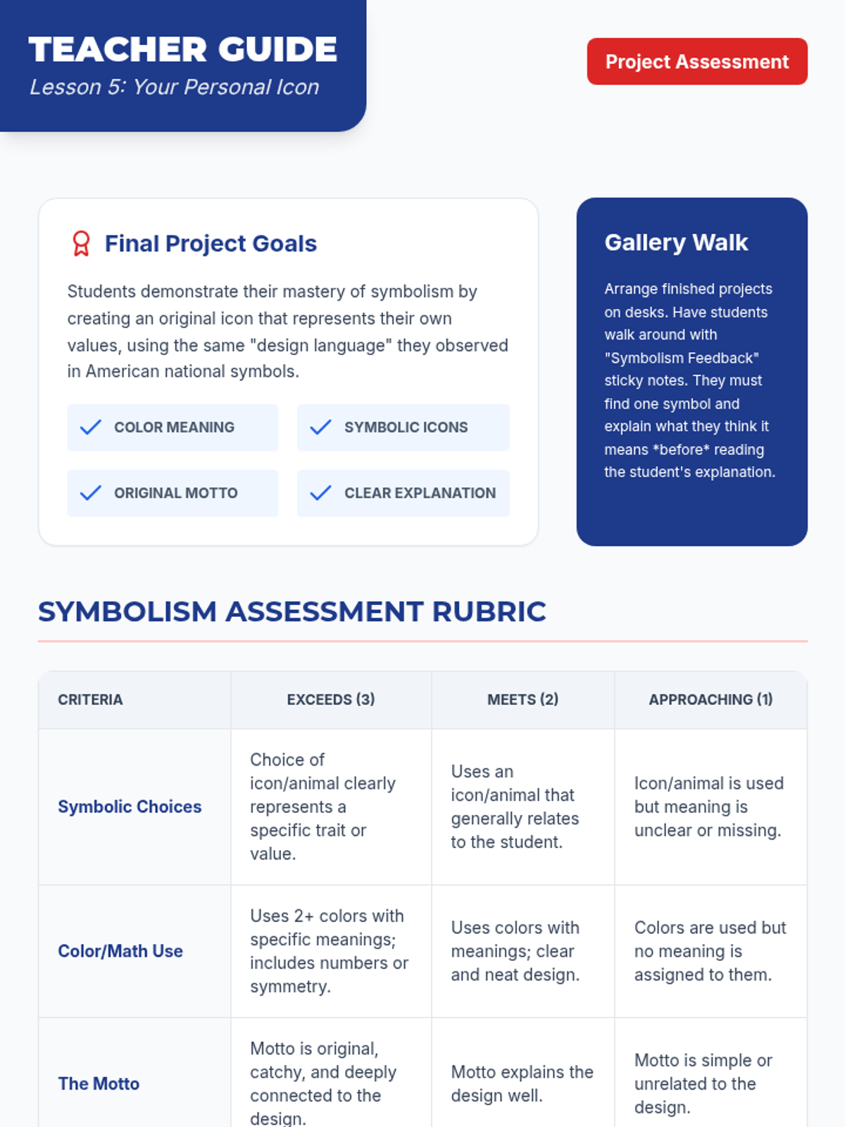 Students analyze the abstract world of symbols to understand how objects and animals represent American values like freedom, strength, and unity. Through inquiry and design, learners connect historical decisions to modern American identity.