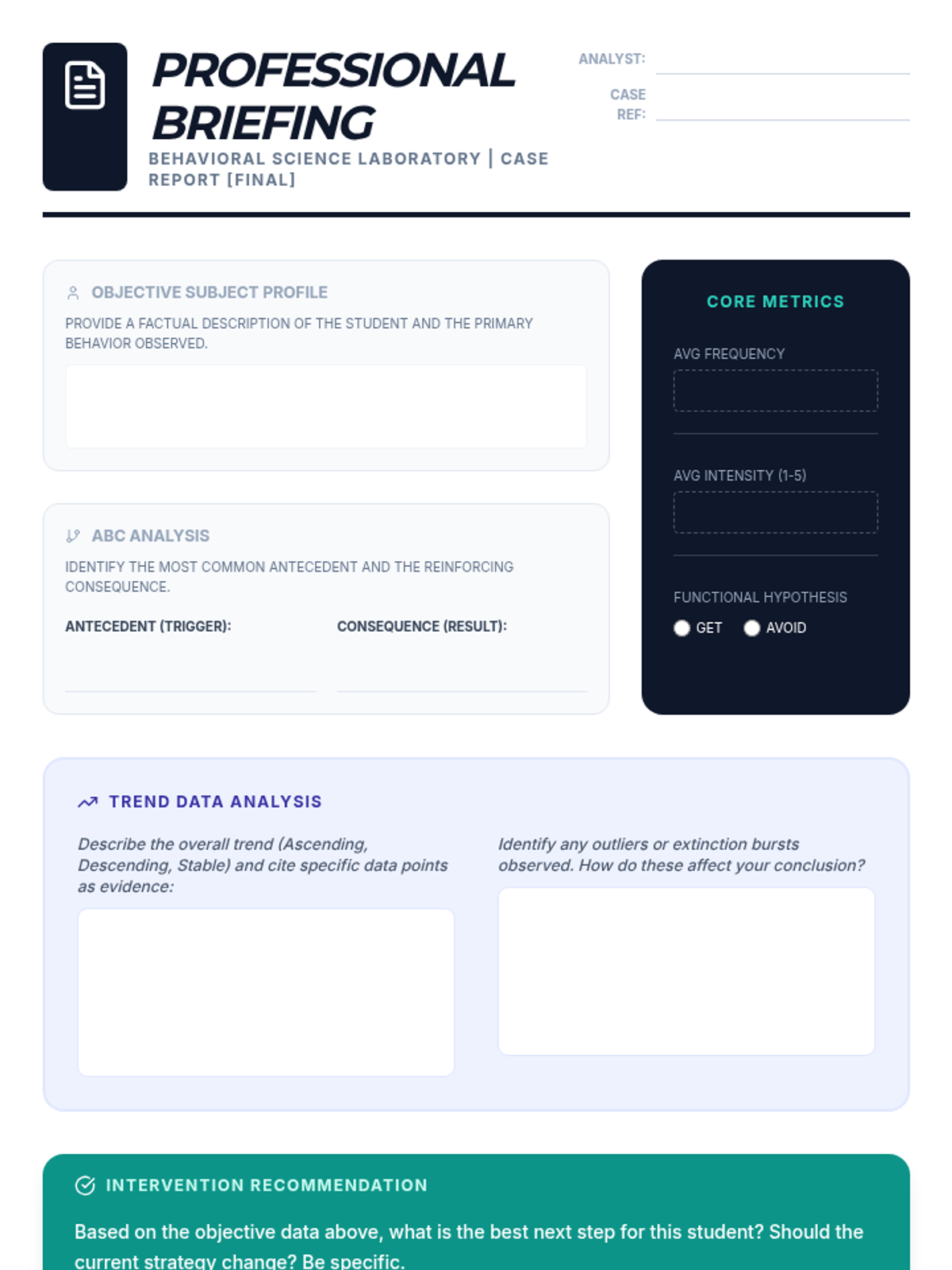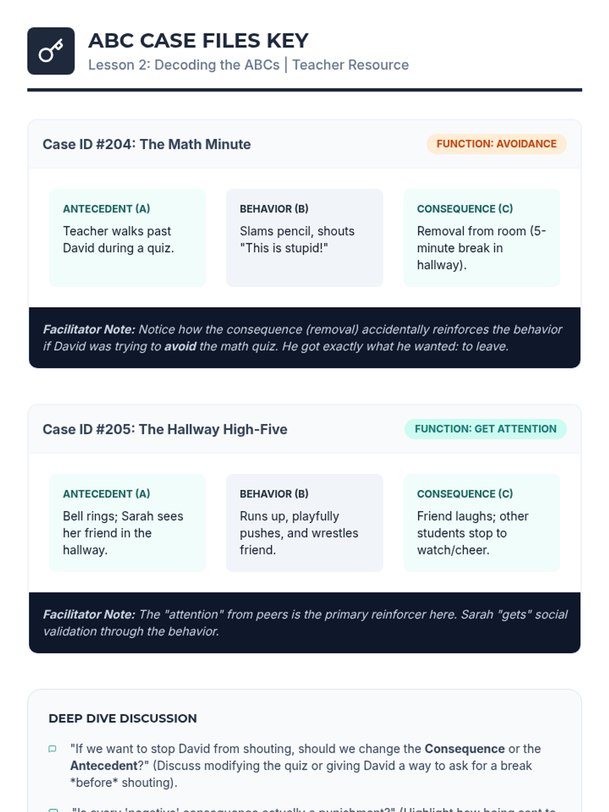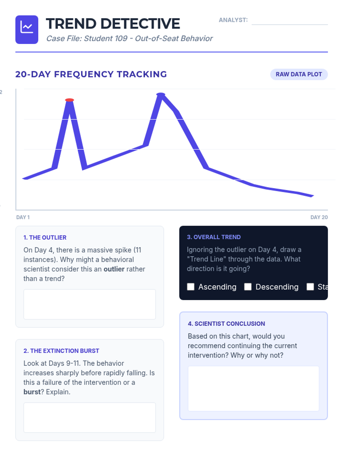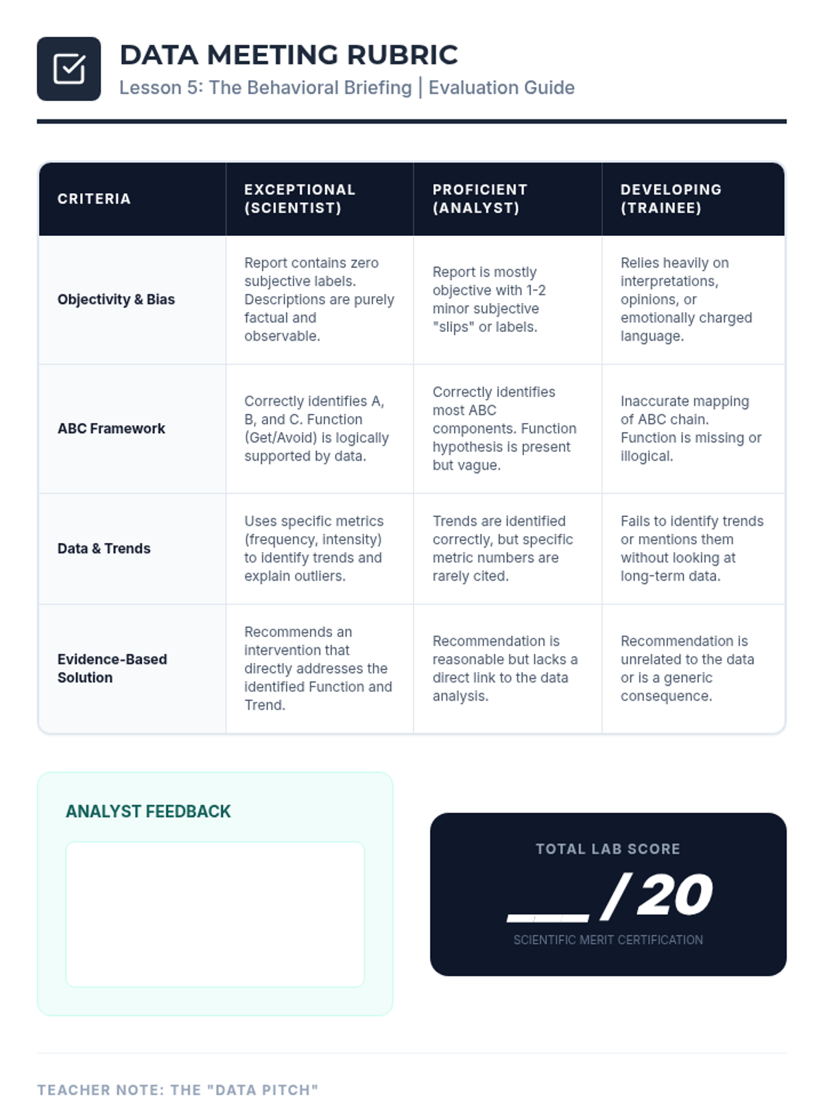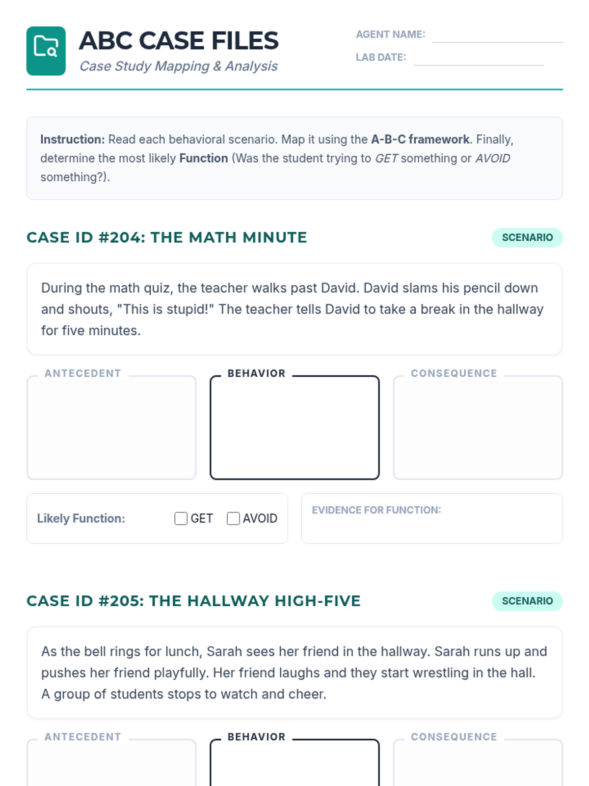 Students act as behavioral scientists to learn objective observation, the ABC model, and data analysis to uncover root causes of human behavior without bias.