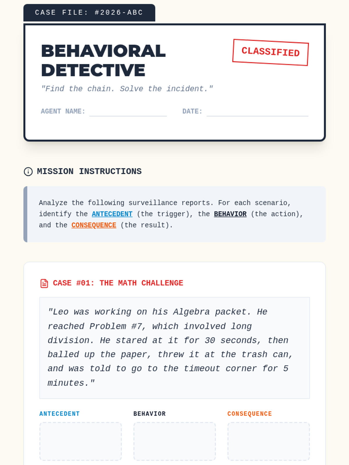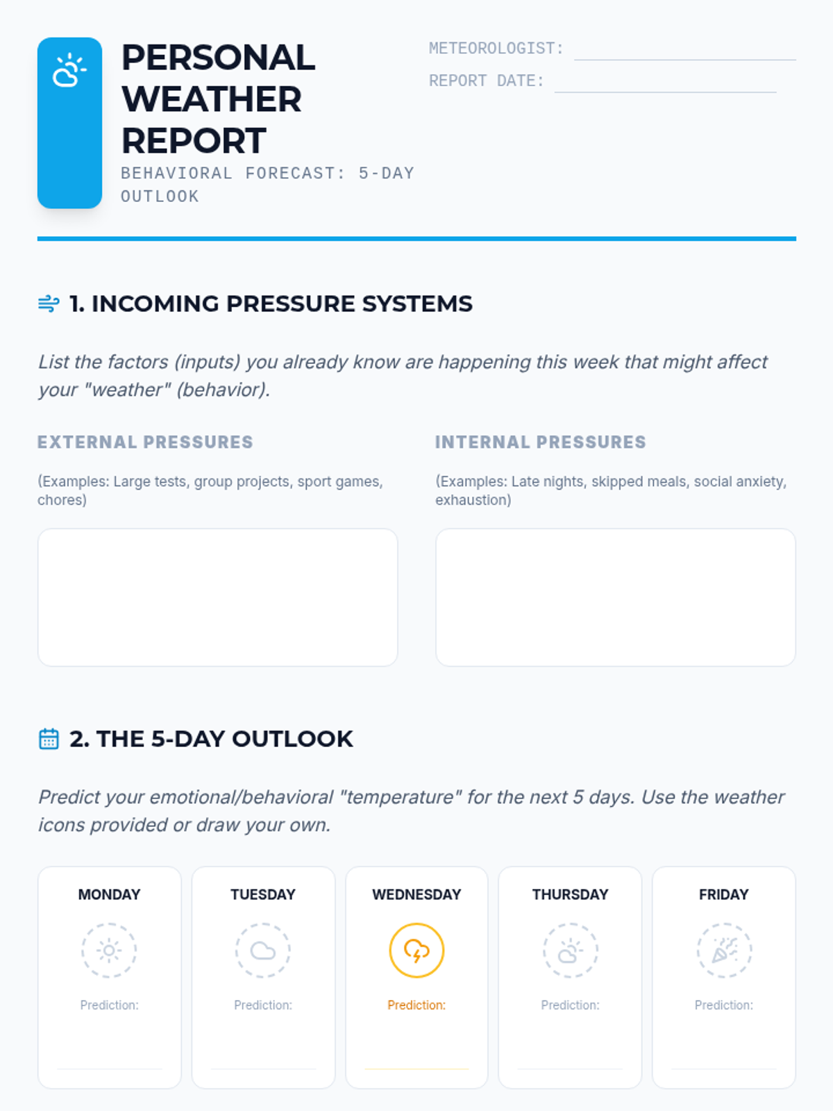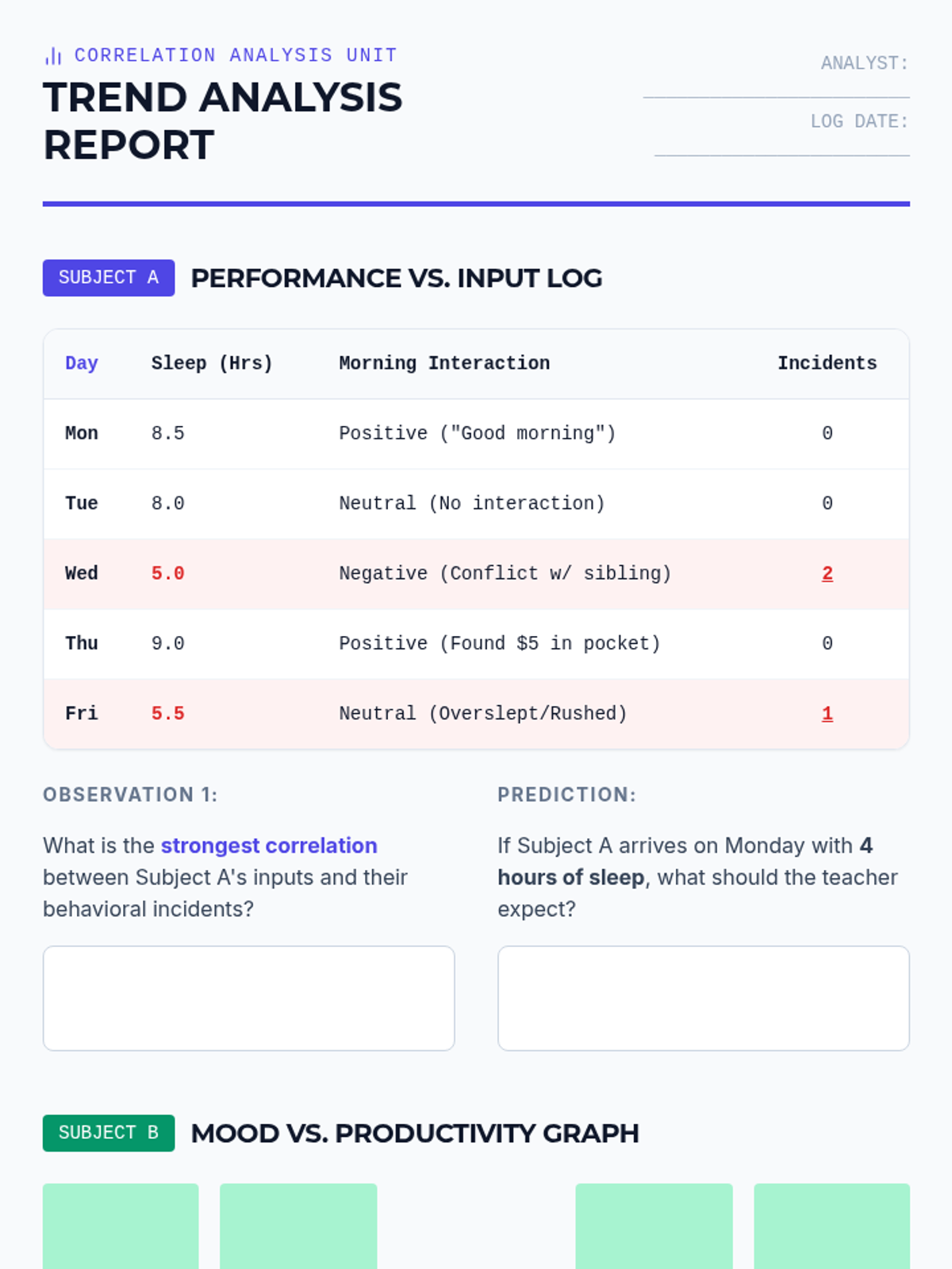 This sequence guides 8th-grade students through the process of viewing their behavior as data. Students learn to distinguish between subjective feelings and objective actions, identify triggers and antecedents, analyze trends over time, and develop proactive 'circuit breaker' plans to manage their behavior effectively for academic success.