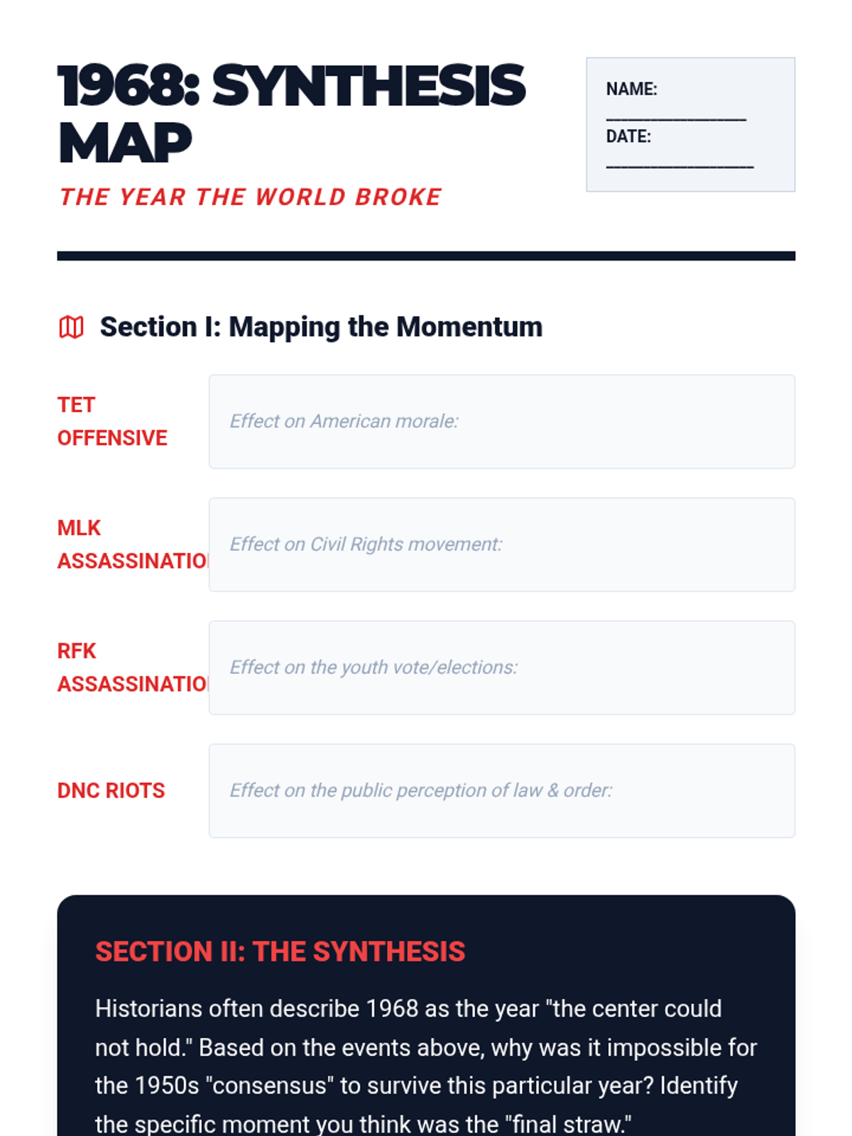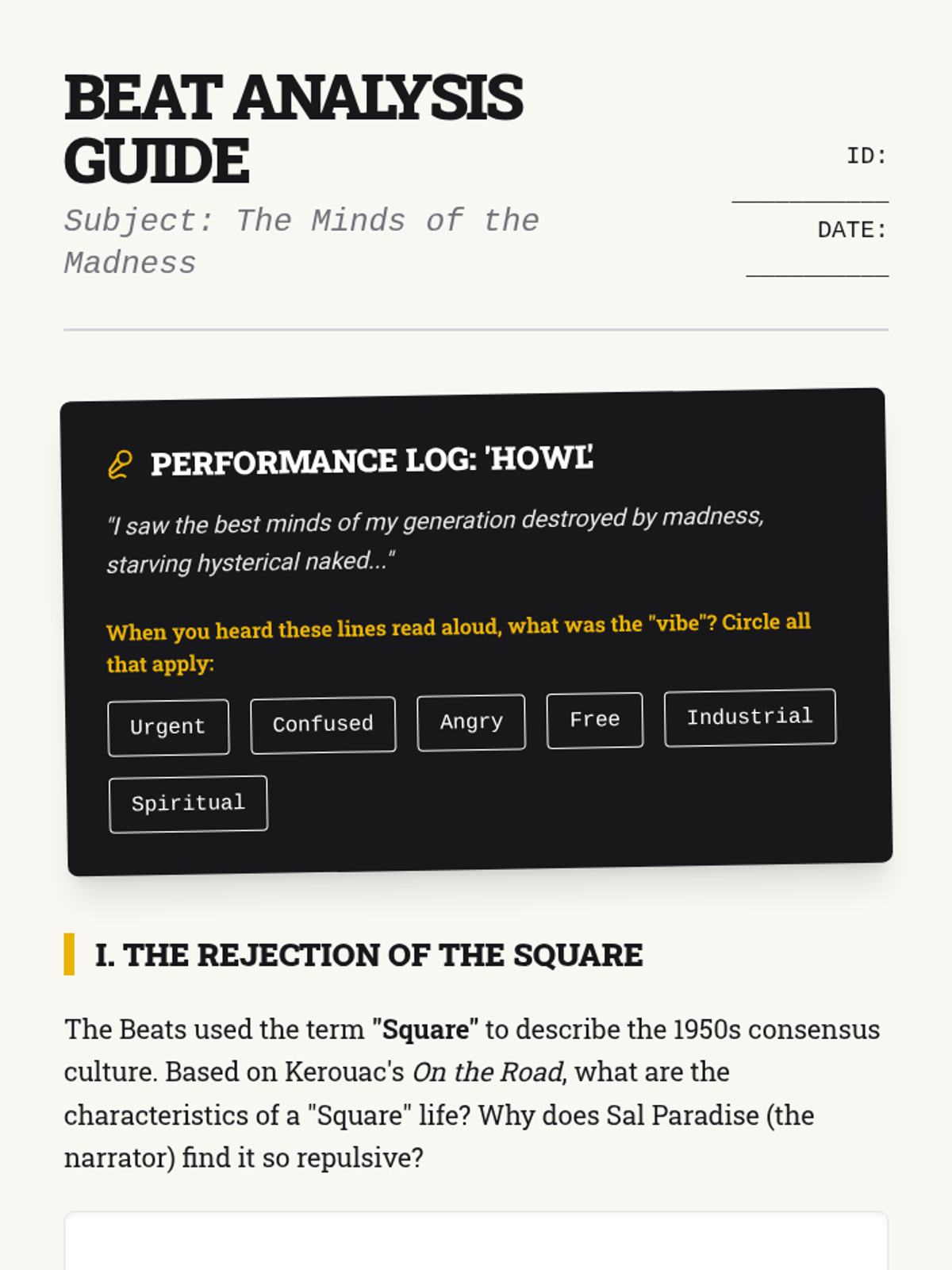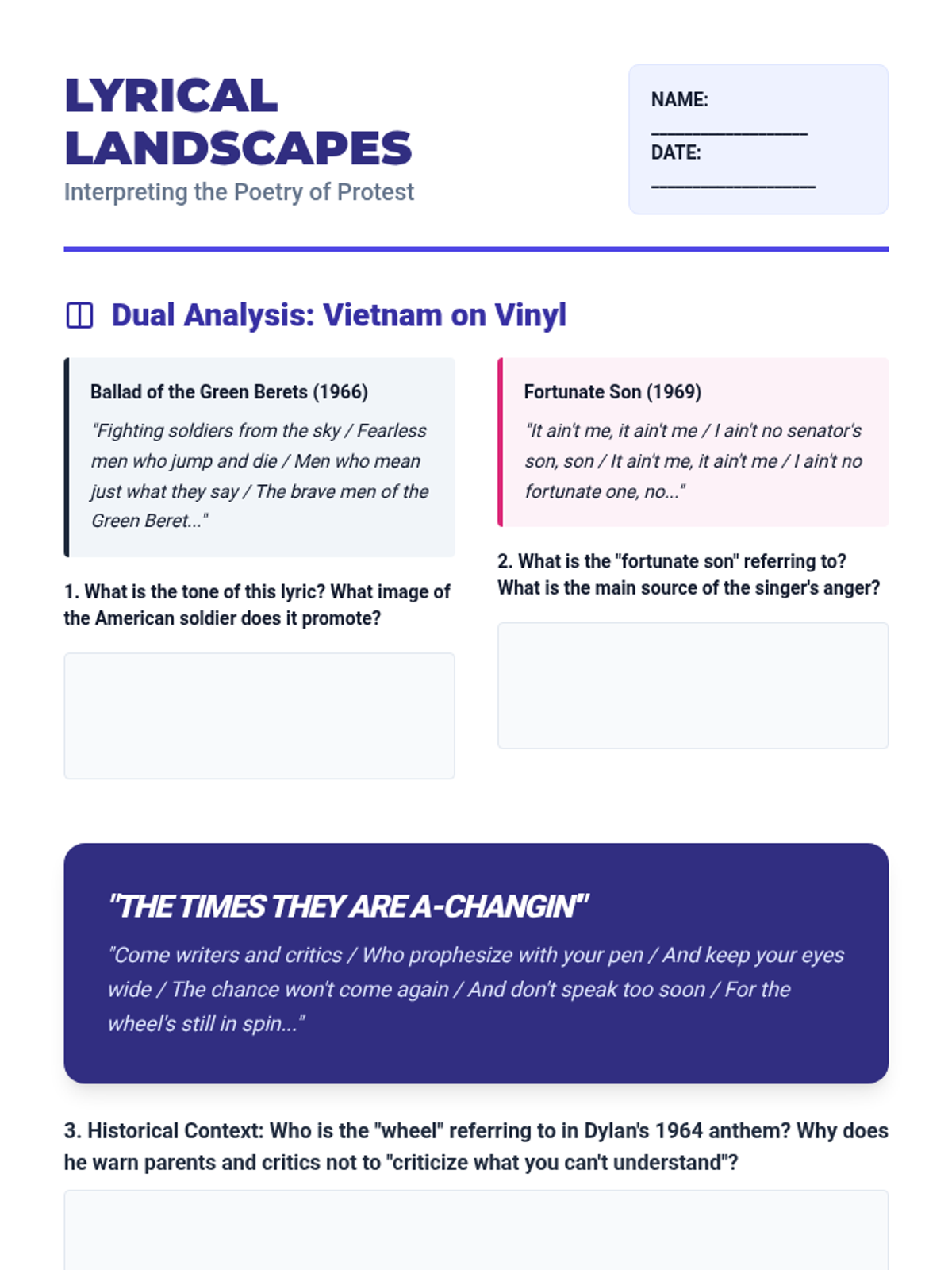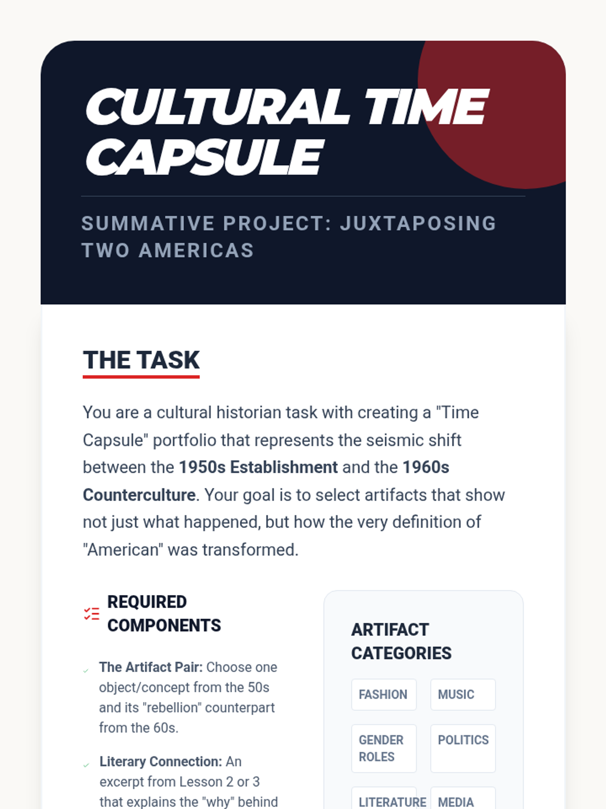 This sequence explores the seismic shift in American culture from the conformity of the 1950s to the radical counterculture of the 1960s. Students analyze literature, music, and primary sources to understand how art and activism challenged traditional gender roles, materialism, and political authority.