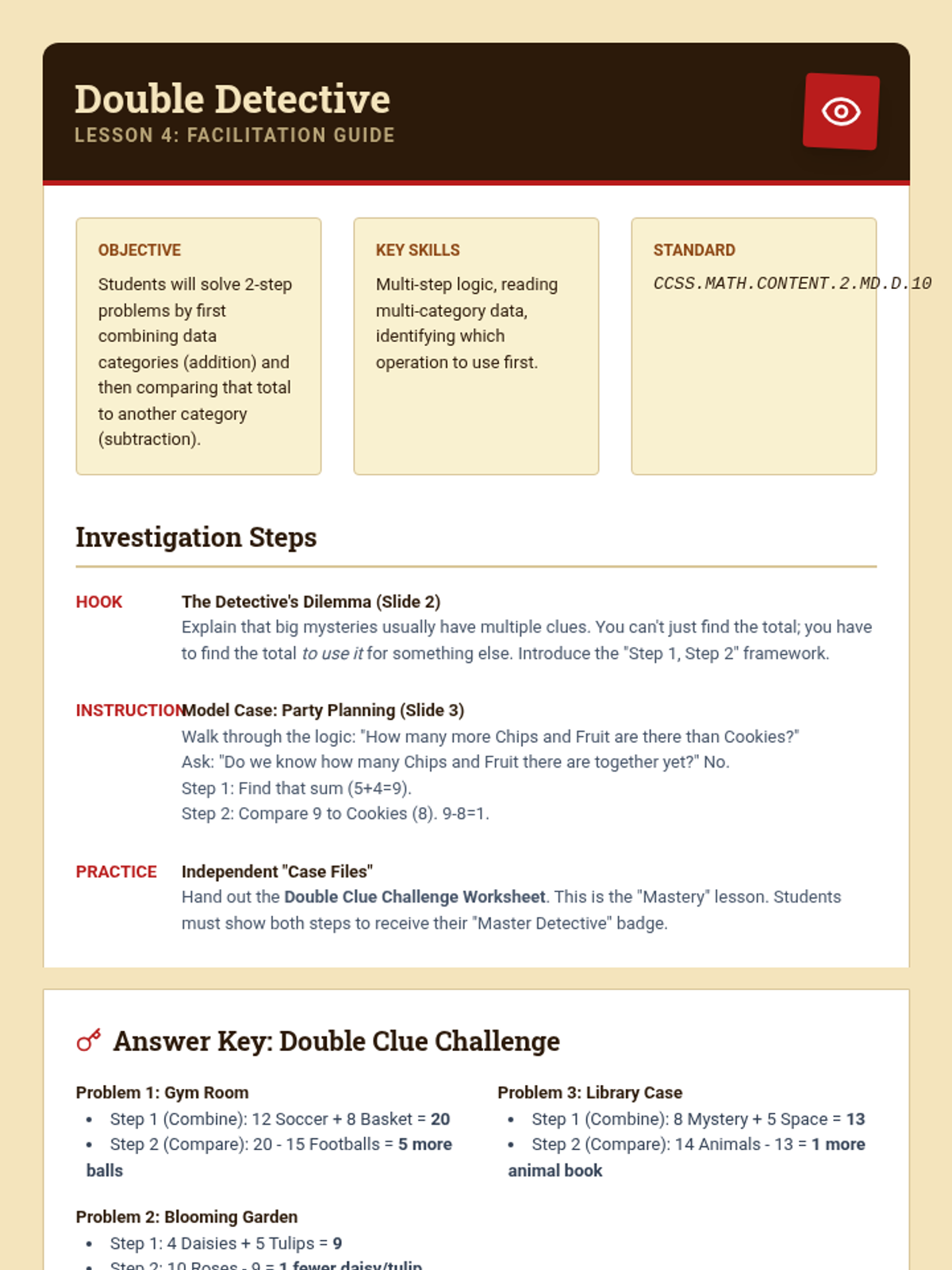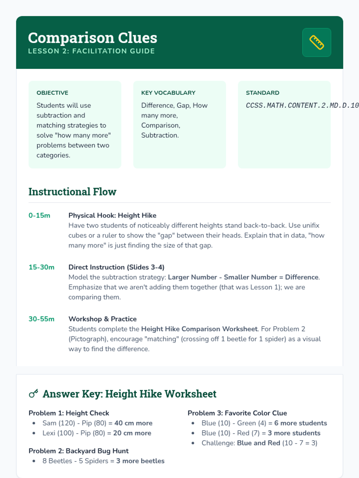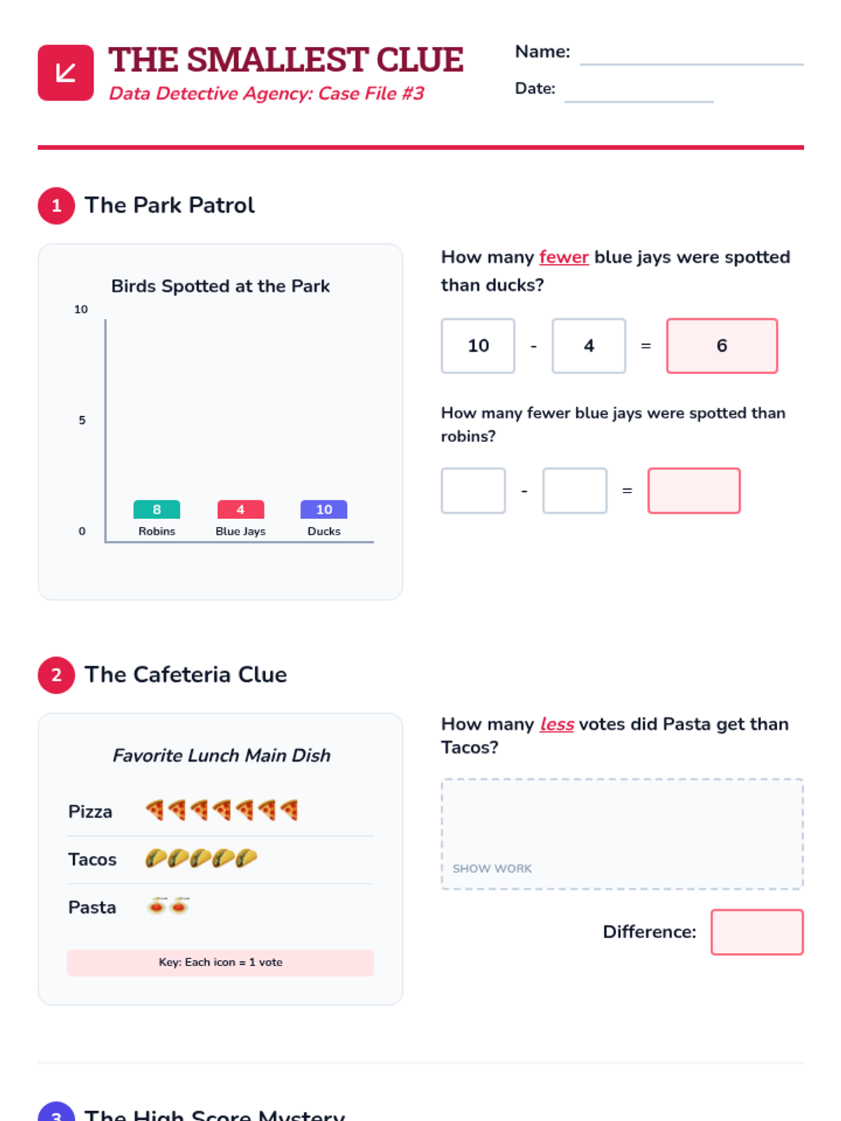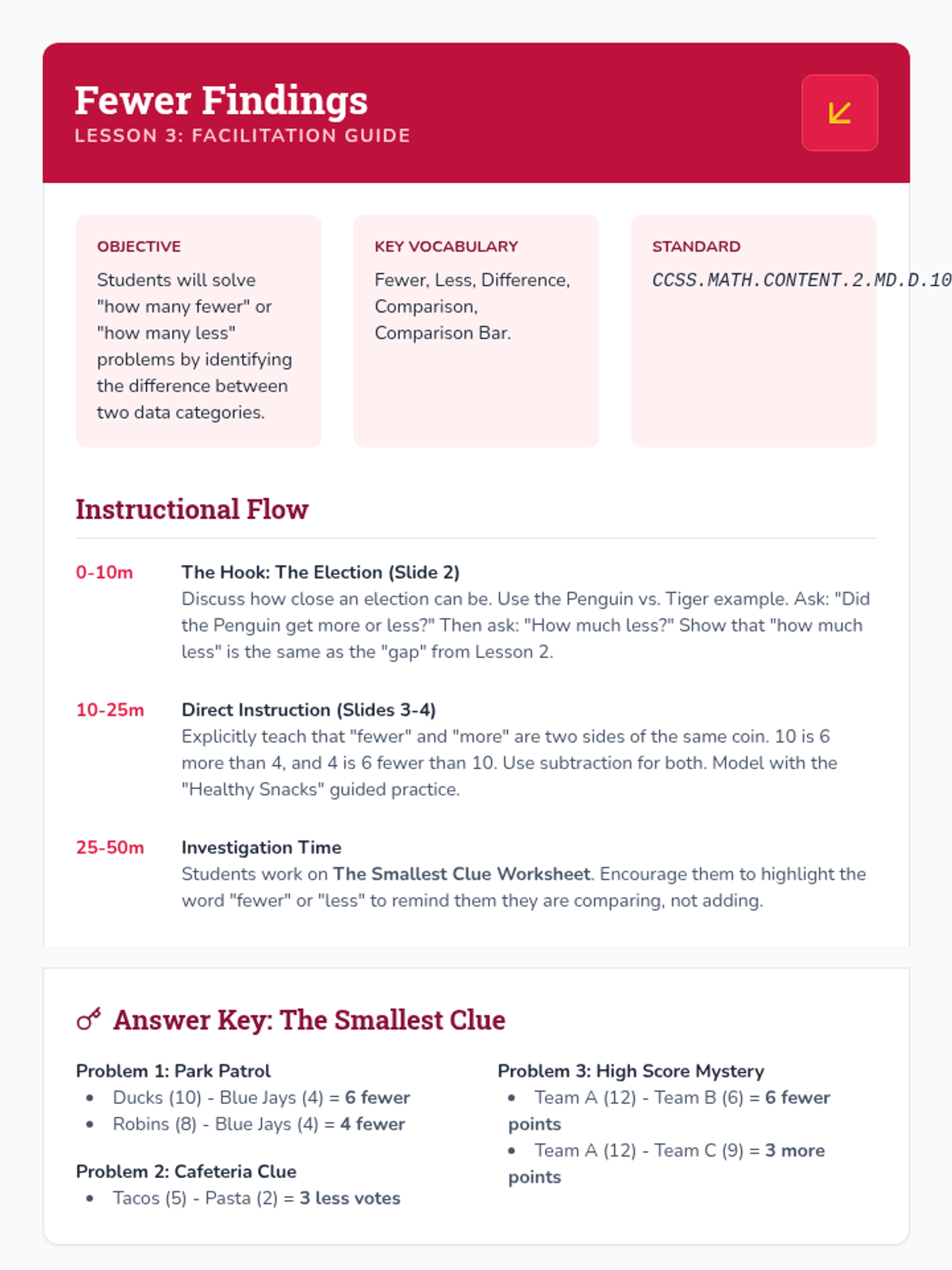 Students move from reading data to interpreting it to solve addition and subtraction problems. They analyze bar graphs and pictographs to answer 'how many in all', 'how many more', and 'how many fewer' questions, culminating in multi-step problem solving.