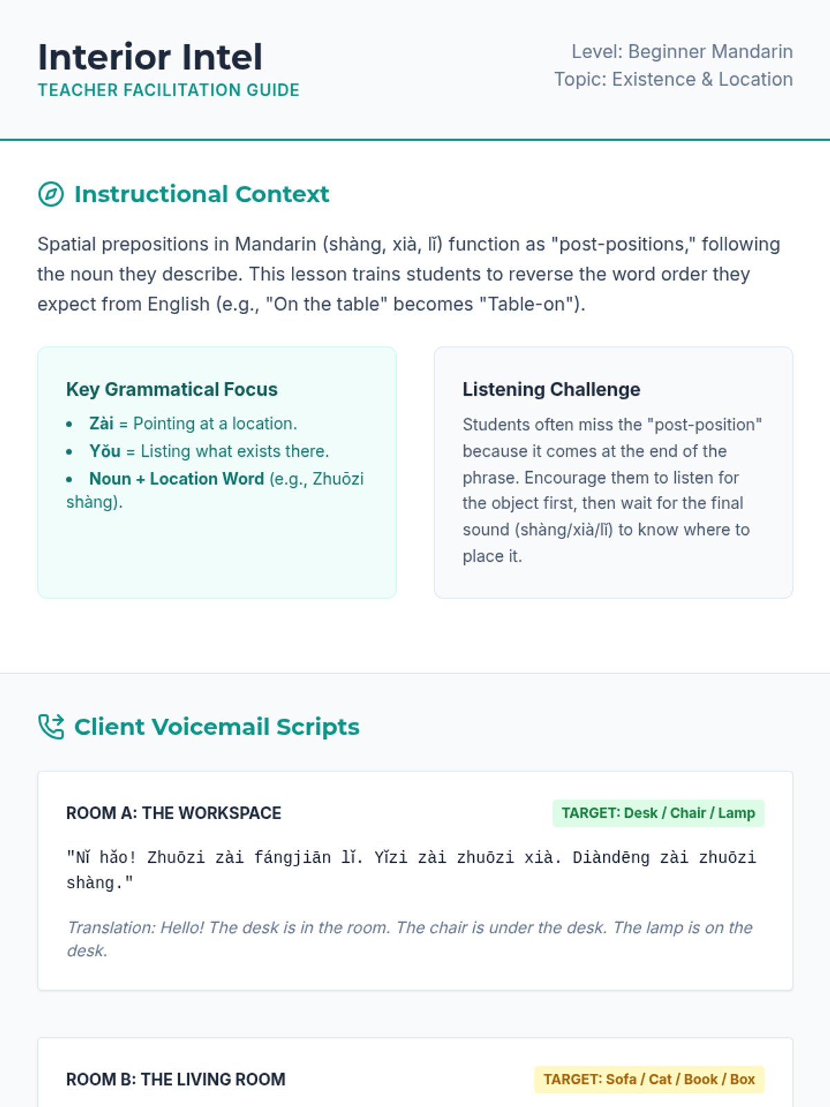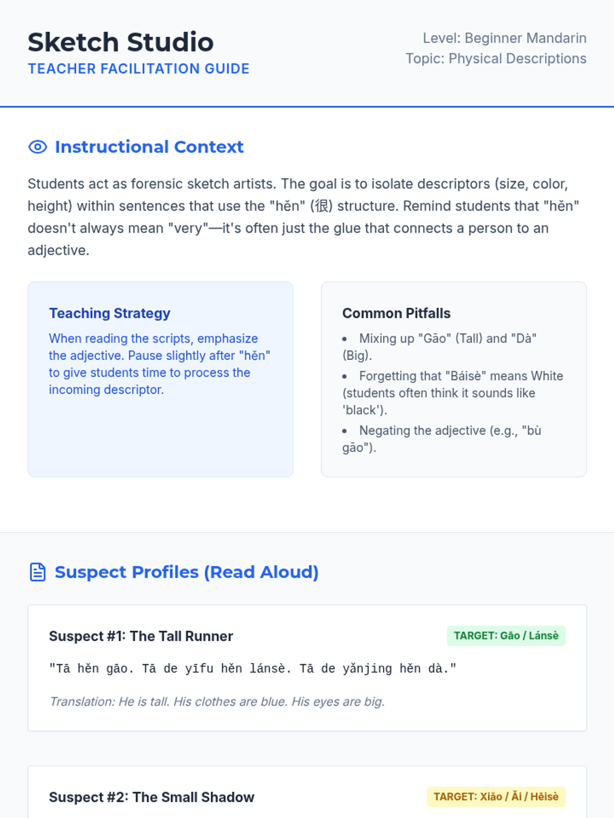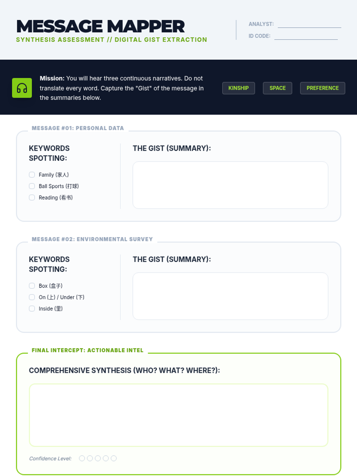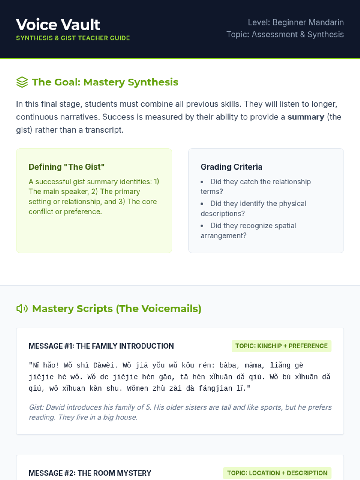 A beginner Mandarin Chinese listening sequence for 12th-grade students focused on decoding kinship terms, physical descriptions, spatial locations, and personal preferences through context clues and keyword spotting.