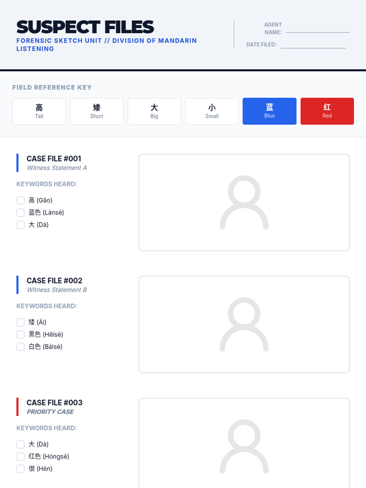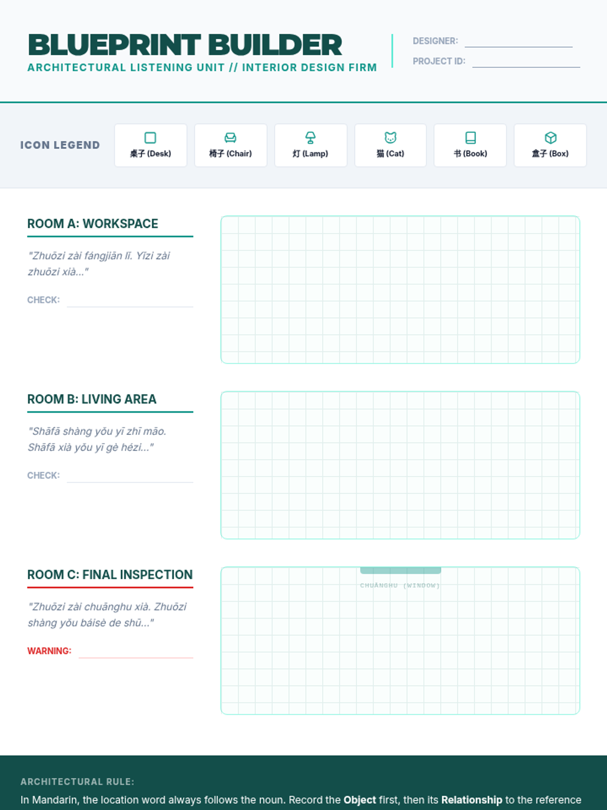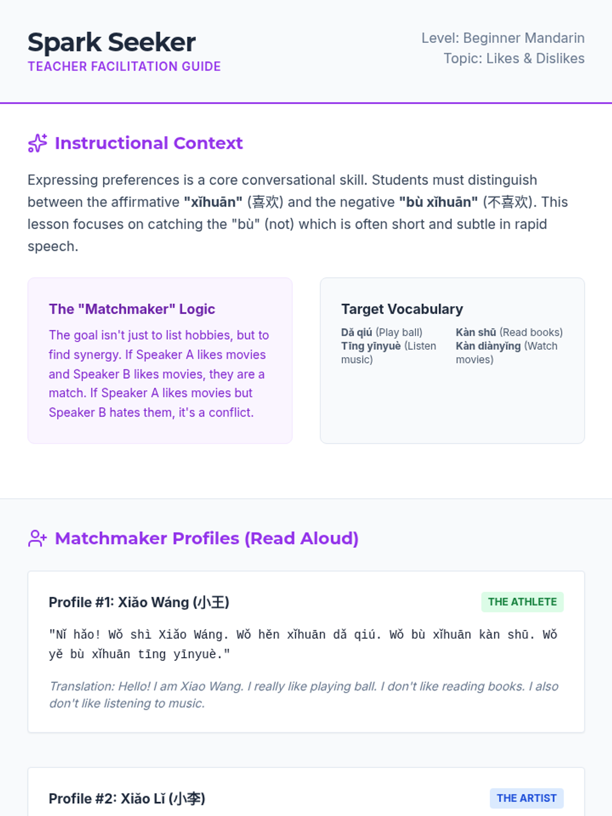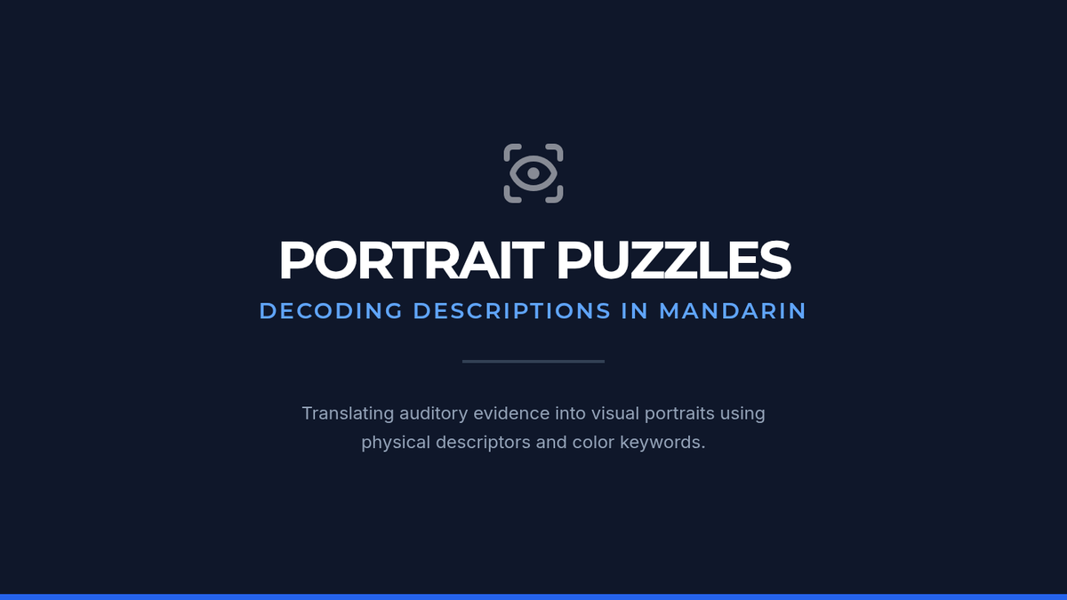 A beginner Mandarin Chinese listening sequence for 12th-grade students focused on decoding kinship terms, physical descriptions, spatial locations, and personal preferences through context clues and keyword spotting.