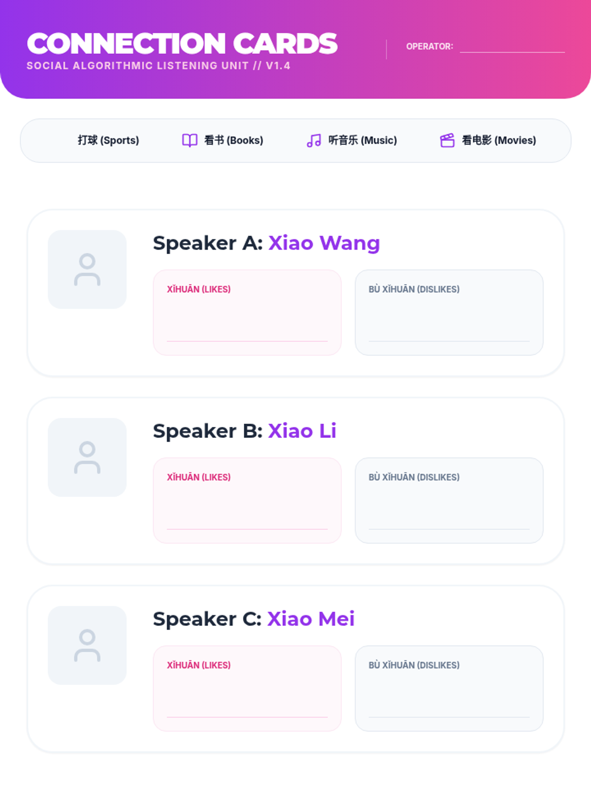A beginner French listening sequence where students act as social observers, analyzing registers, personal details, family structures, and preferences through auditory scripts.