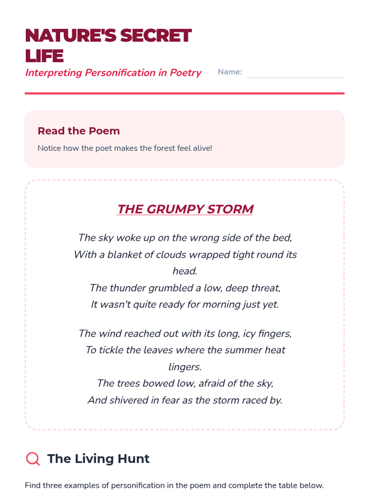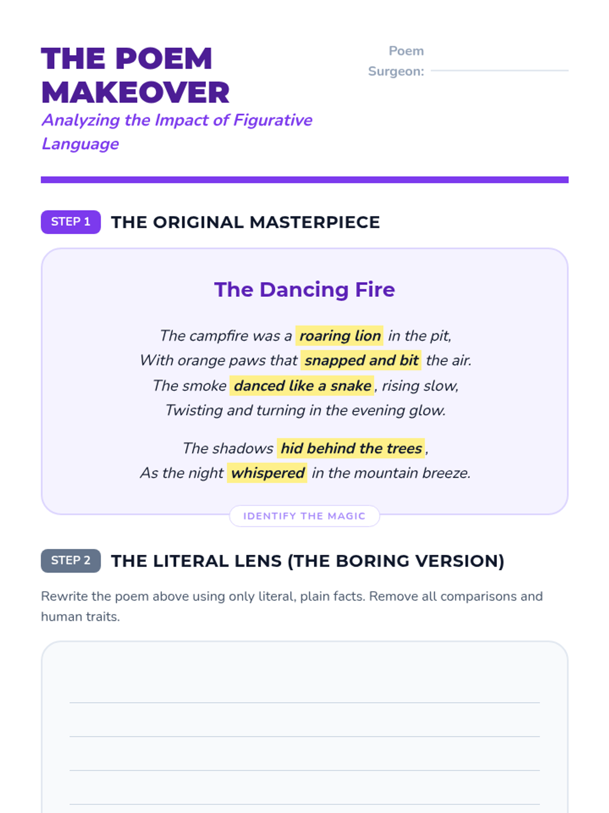 A 4th-grade ELA sequence focused on identifying and interpreting figurative language and sensory imagery in poetry. Students progress from basic visualization to analyzing complex metaphors, personification, and hyperbole to understand how these devices enhance meaning and mood.