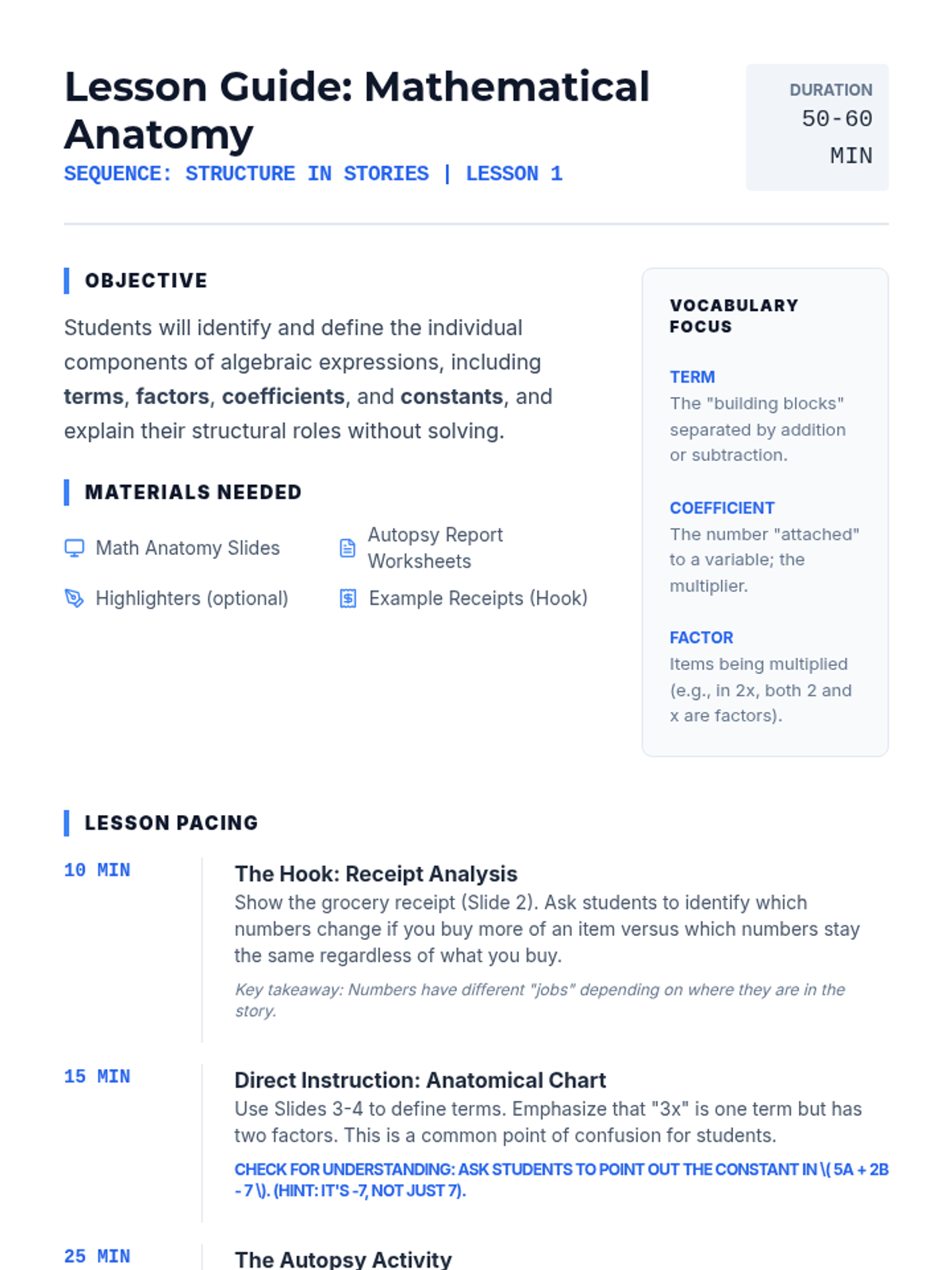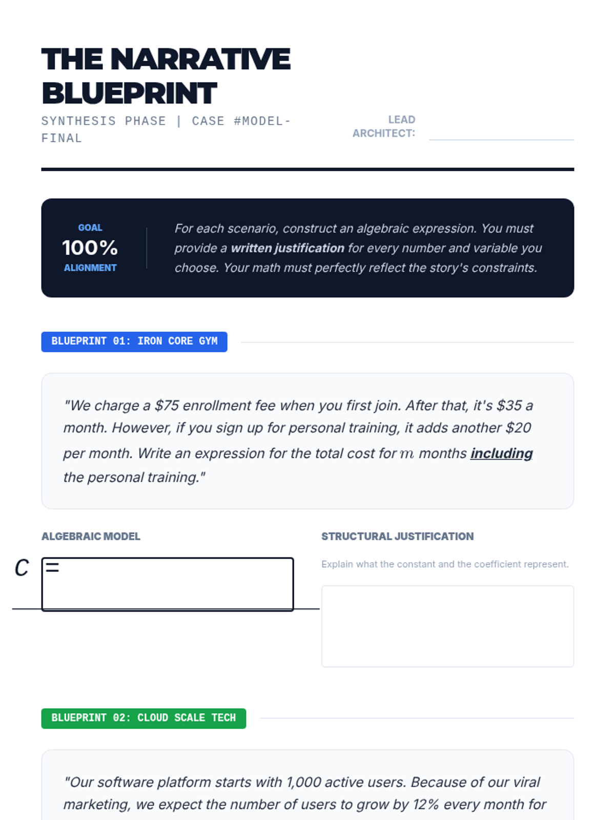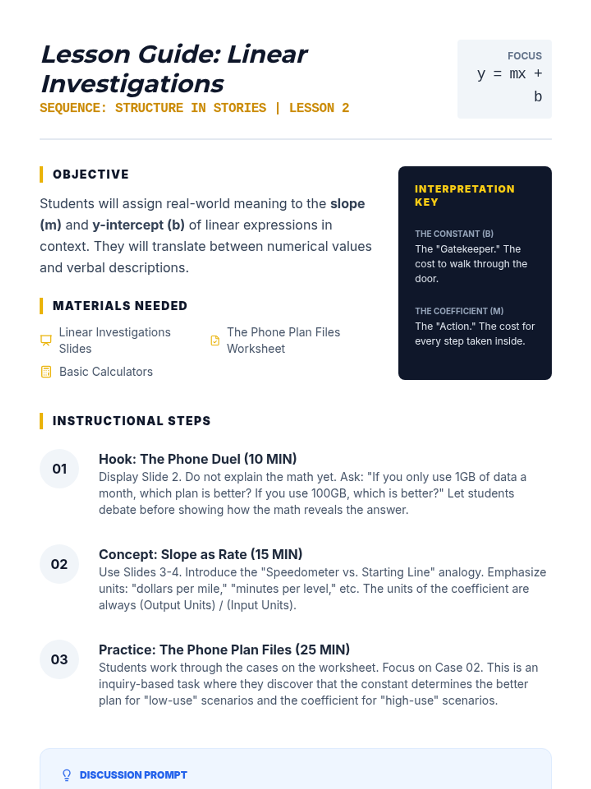 A 9th-grade algebra sequence focusing on the 'grammar' of mathematics. Students learn to dissect linear, exponential, and multi-part expressions to interpret the real-world meaning of coefficients, constants, and variables in various contexts including business and science.