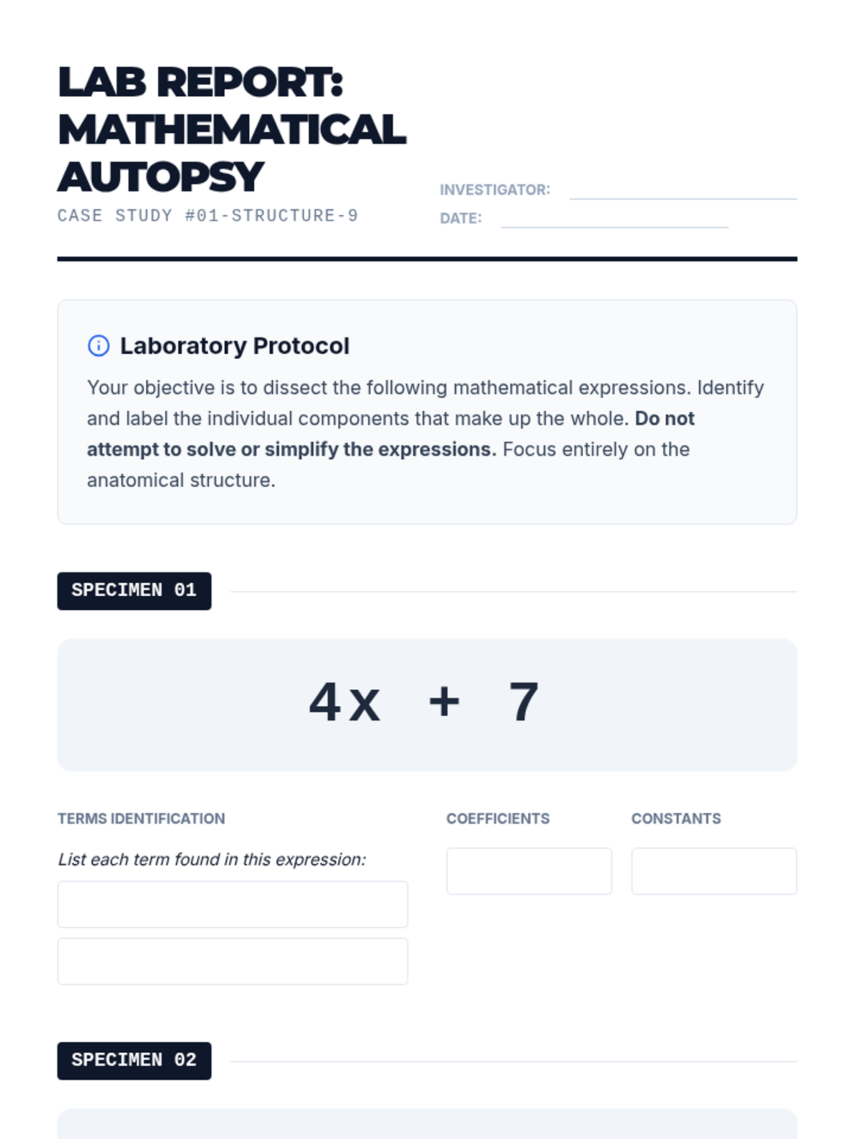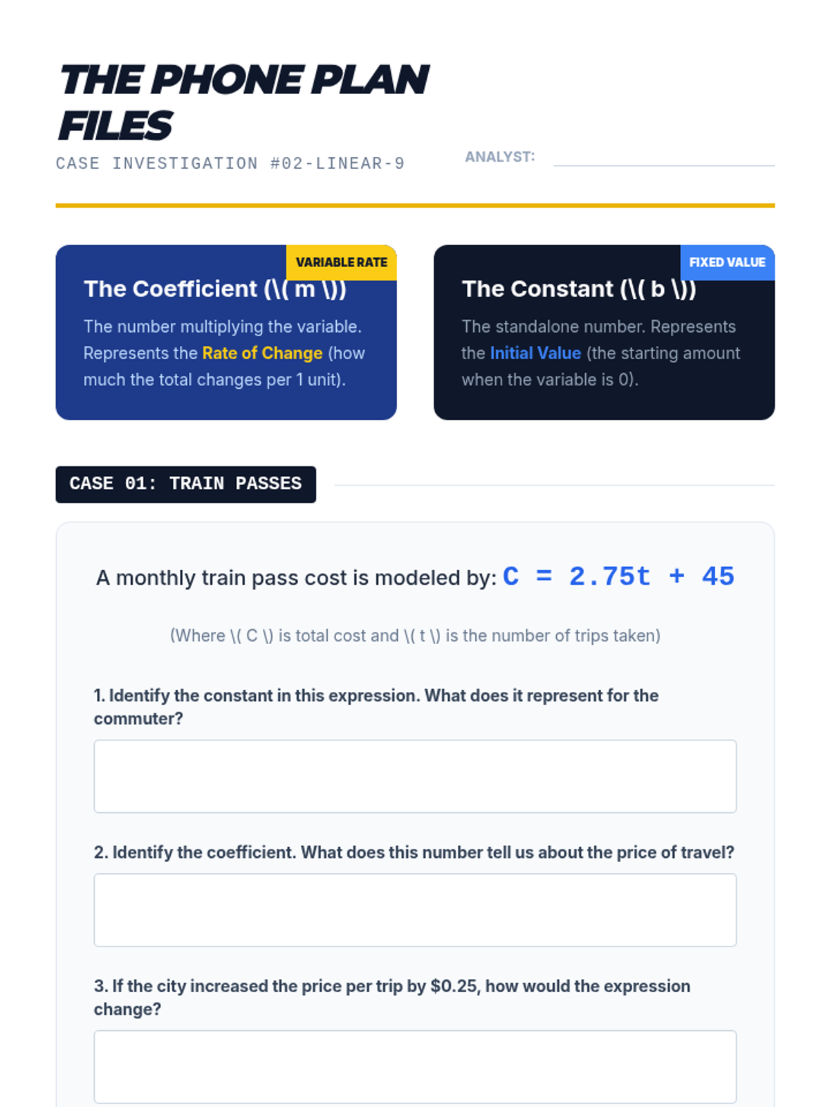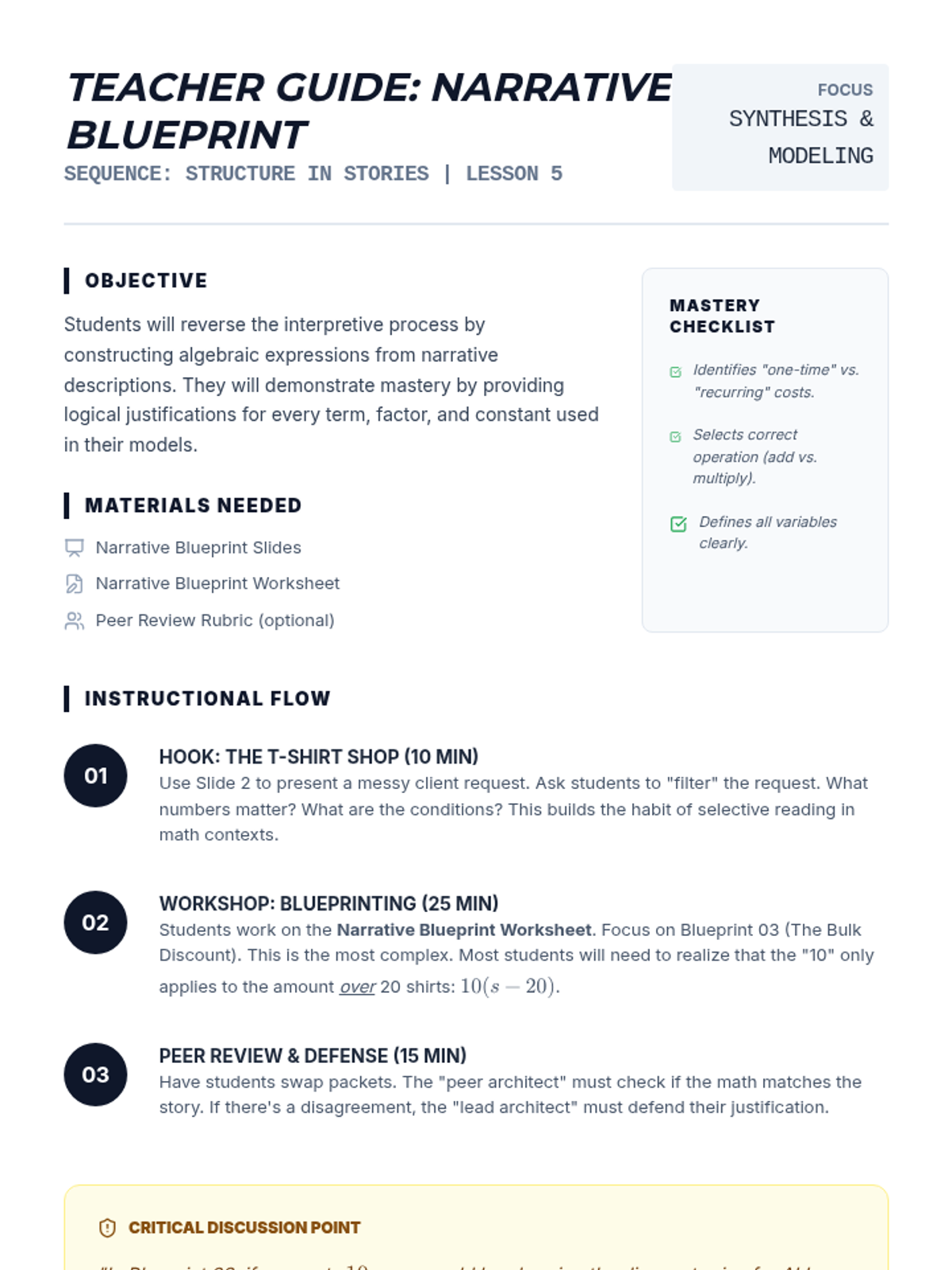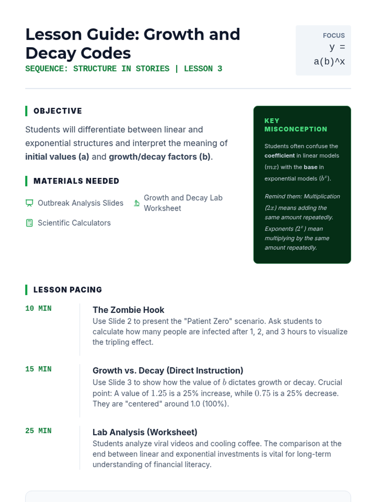 A 9th-grade algebra sequence focusing on the 'grammar' of mathematics. Students learn to dissect linear, exponential, and multi-part expressions to interpret the real-world meaning of coefficients, constants, and variables in various contexts including business and science.