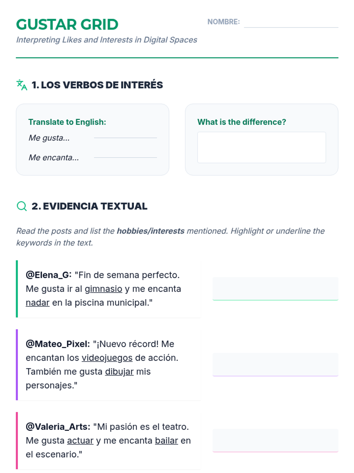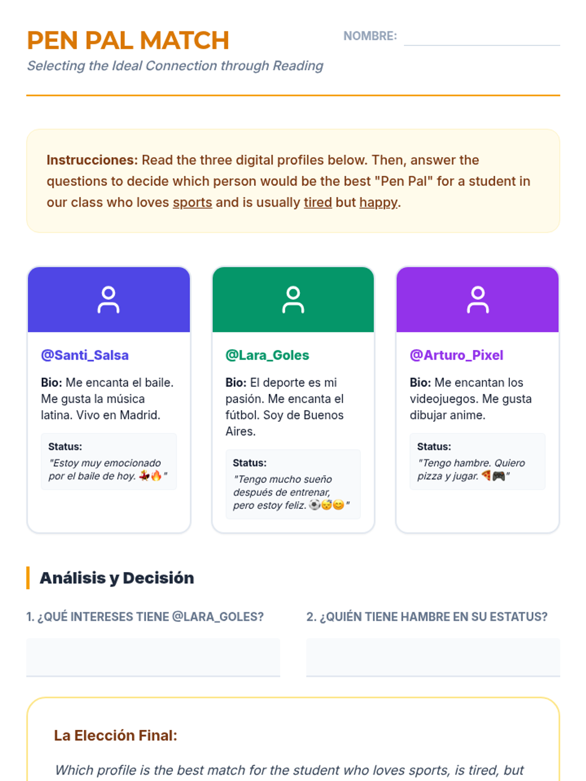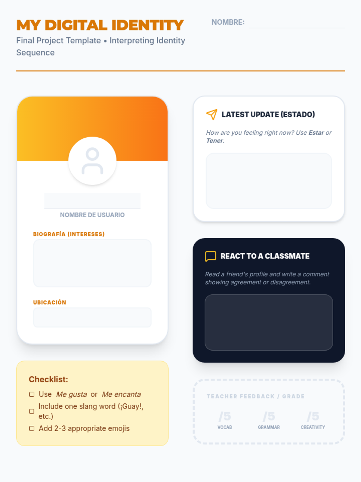 A 7th-grade Spanish reading sequence focused on interpreting digital identity through social media profiles, bios, and comments. Students develop literacy skills by analyzing informal registers, hobbies, and emotional states in a modern, digital context.