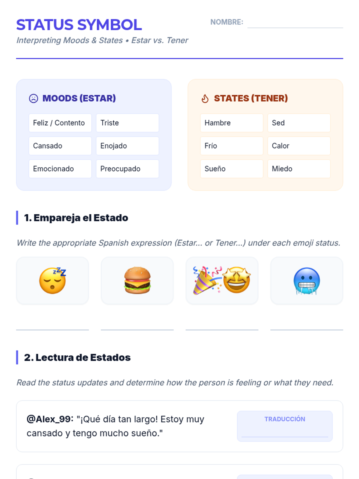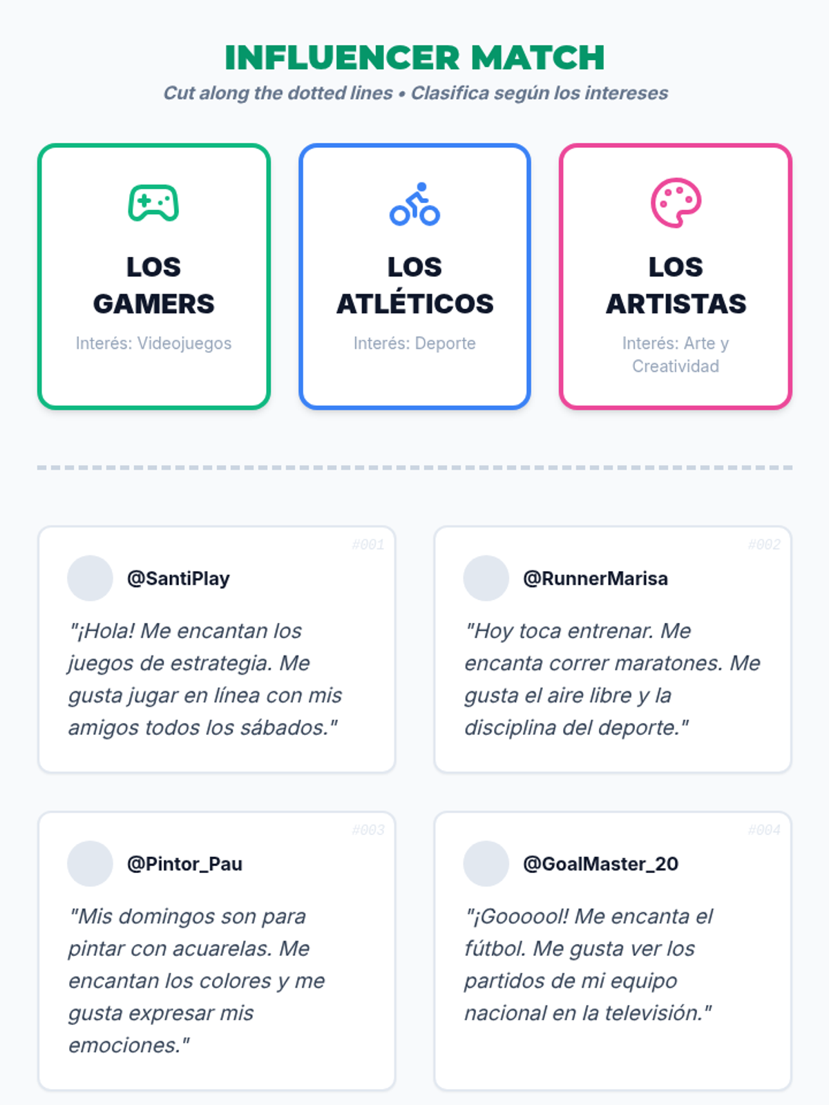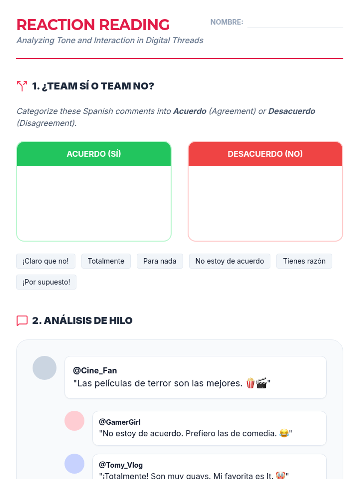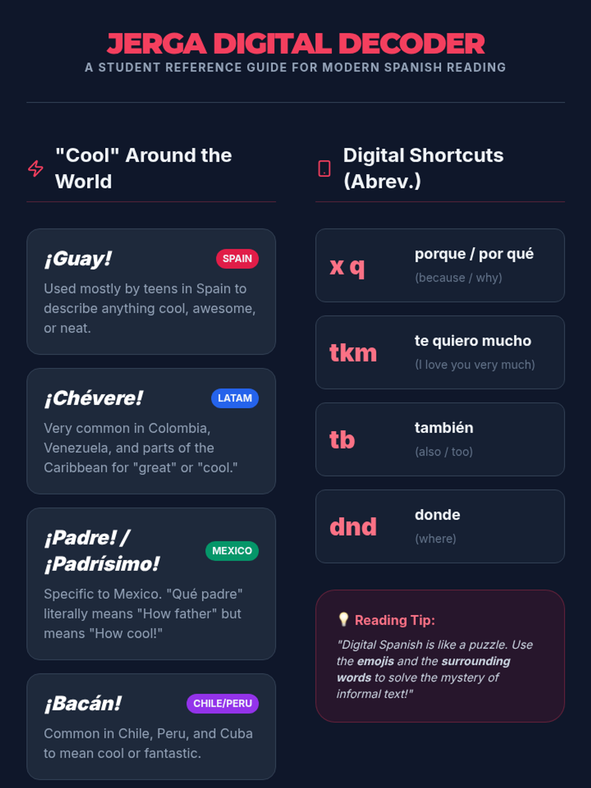 A 7th-grade Spanish reading sequence focused on interpreting digital identity through social media profiles, bios, and comments. Students develop literacy skills by analyzing informal registers, hobbies, and emotional states in a modern, digital context.