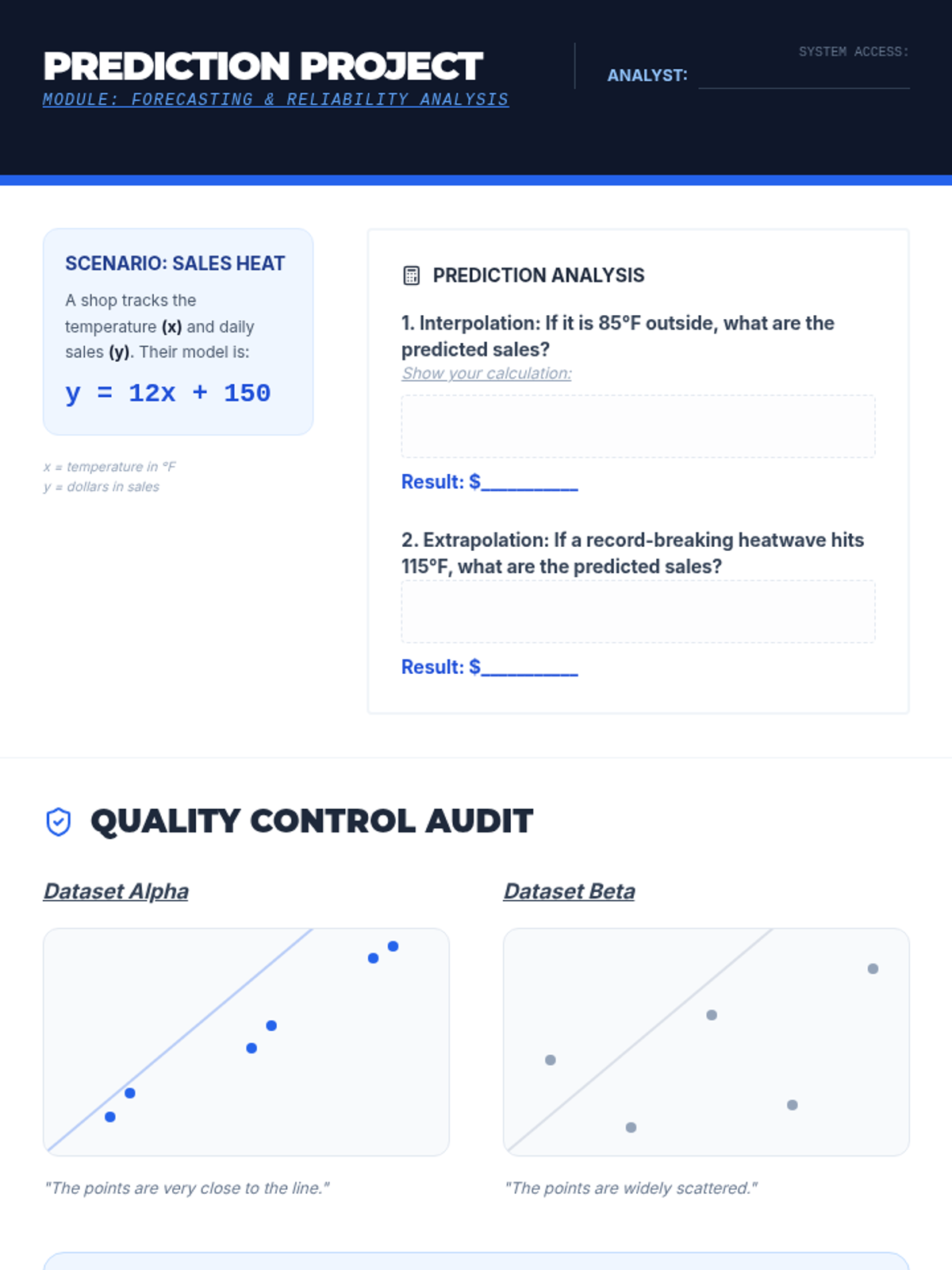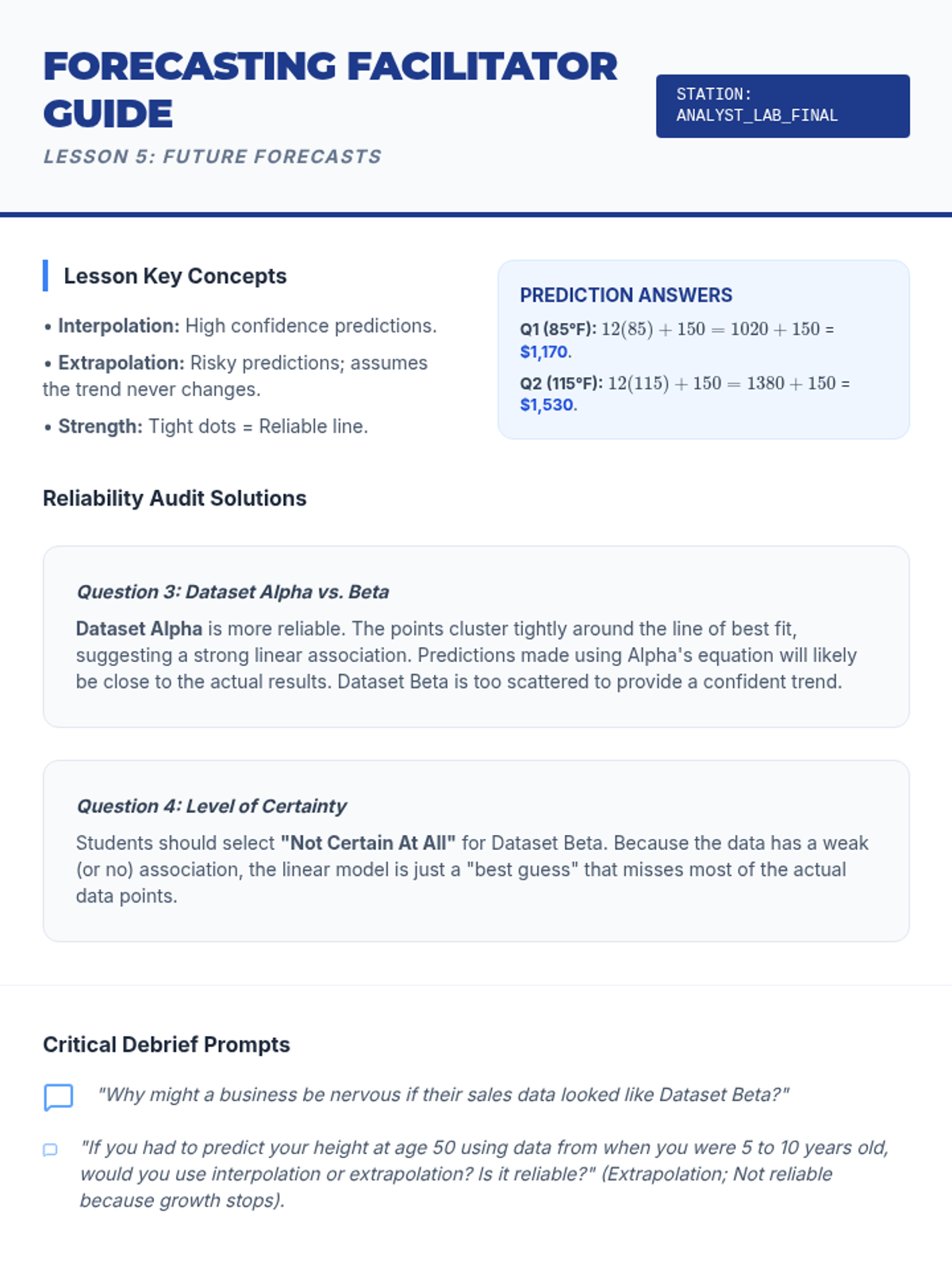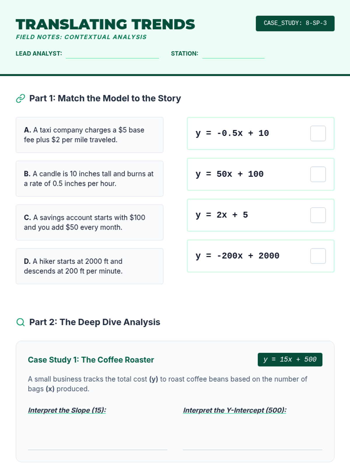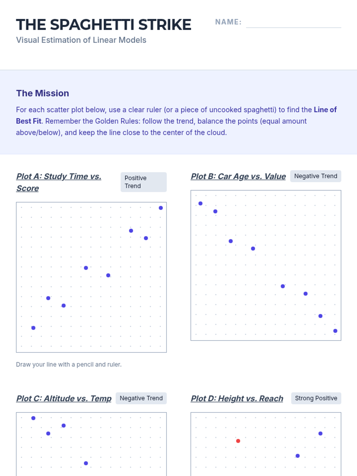A comprehensive unit for 8th-grade students on bivariate data, scatter plots, and linear modeling. Students move from visualizing associations to constructing lines of best fit, deriving equations, and interpreting slope and y-intercept in real-world contexts to make data-driven predictions.