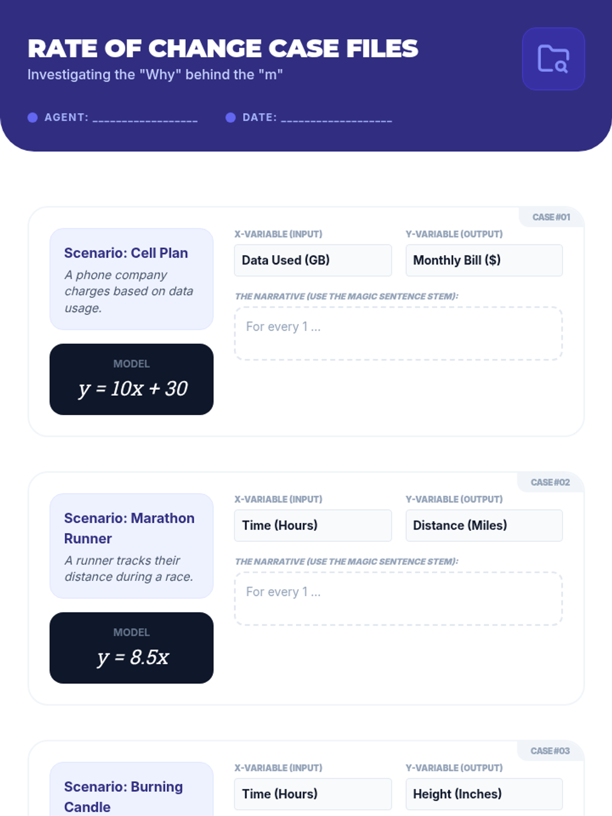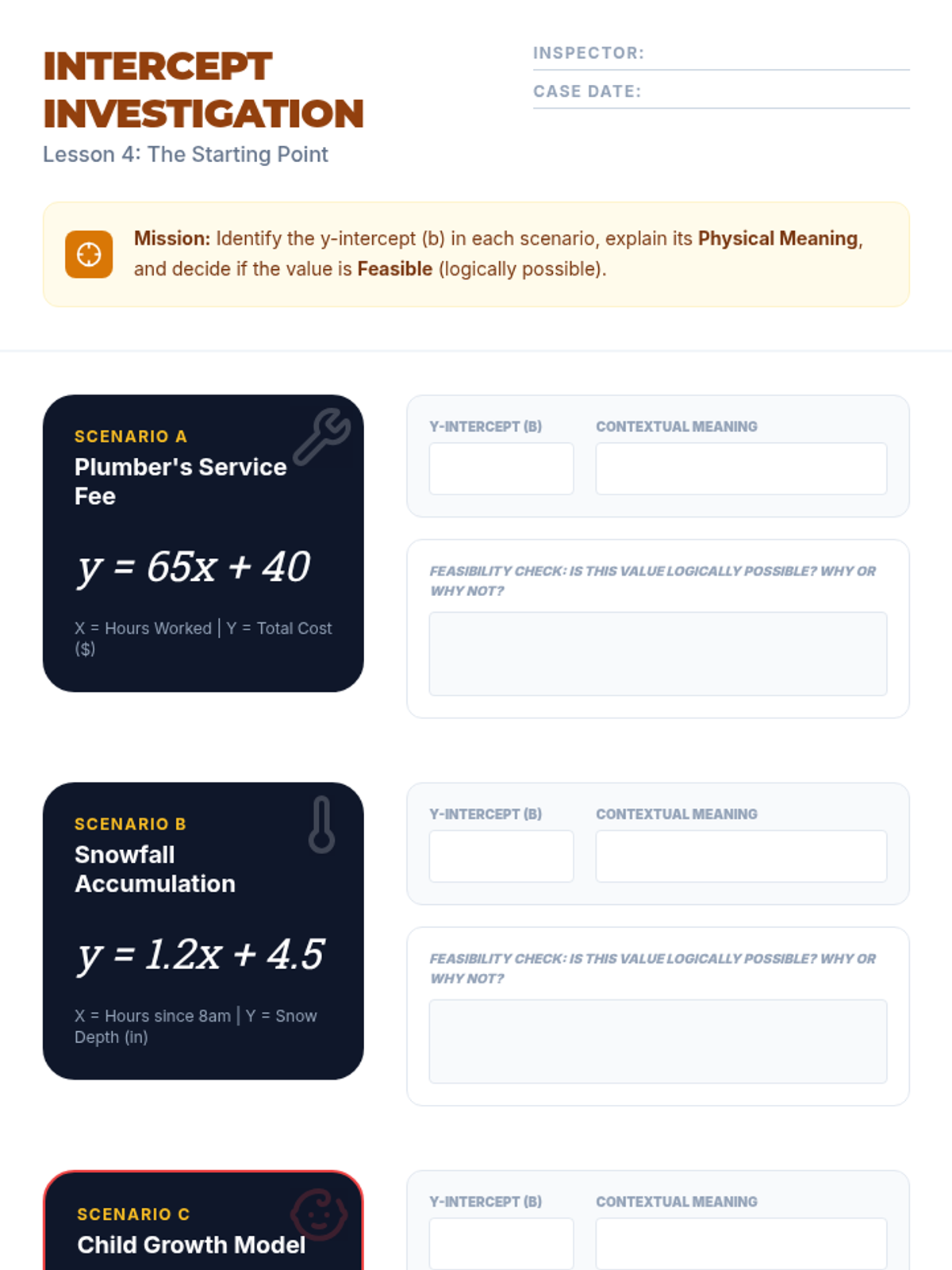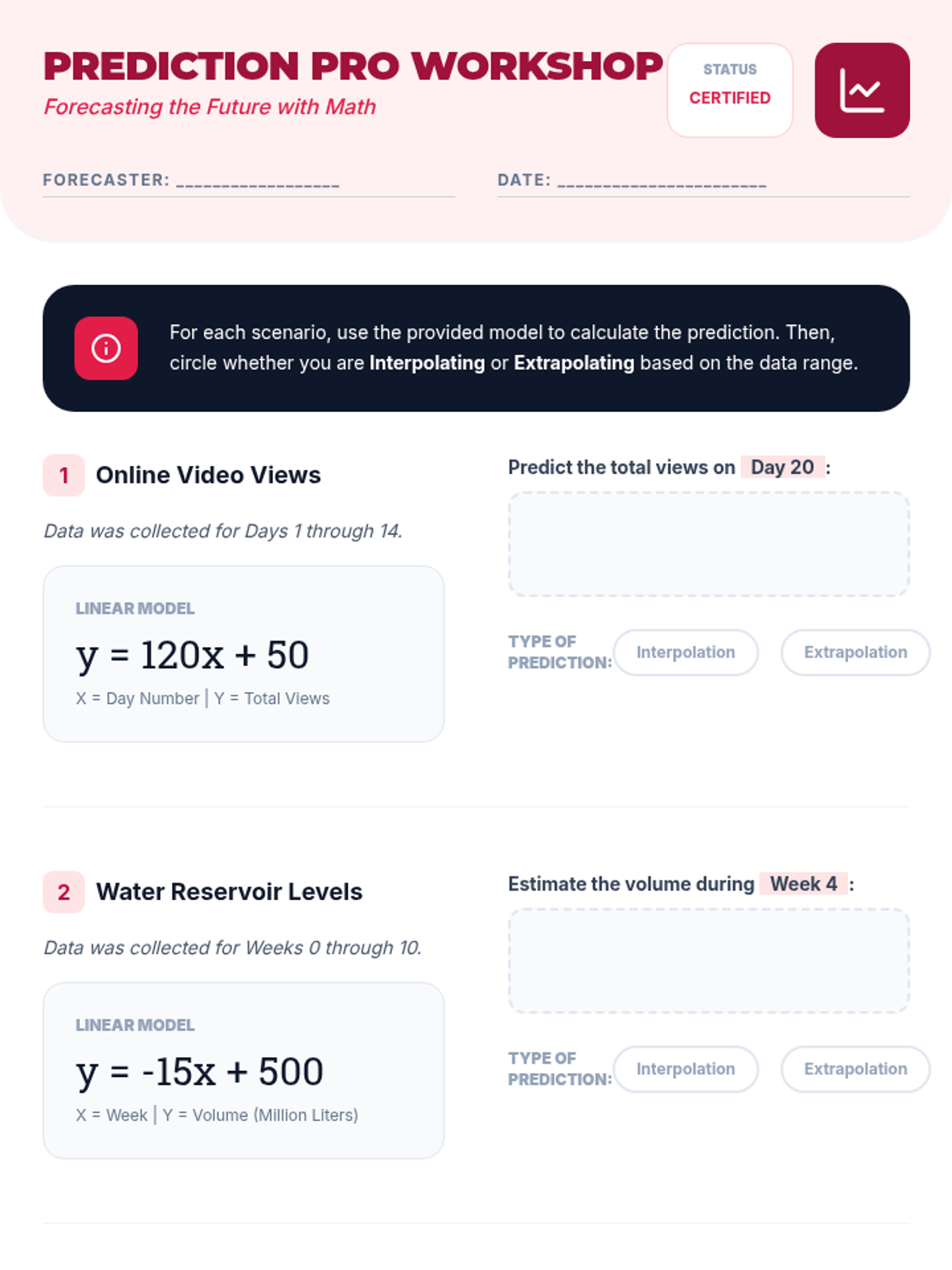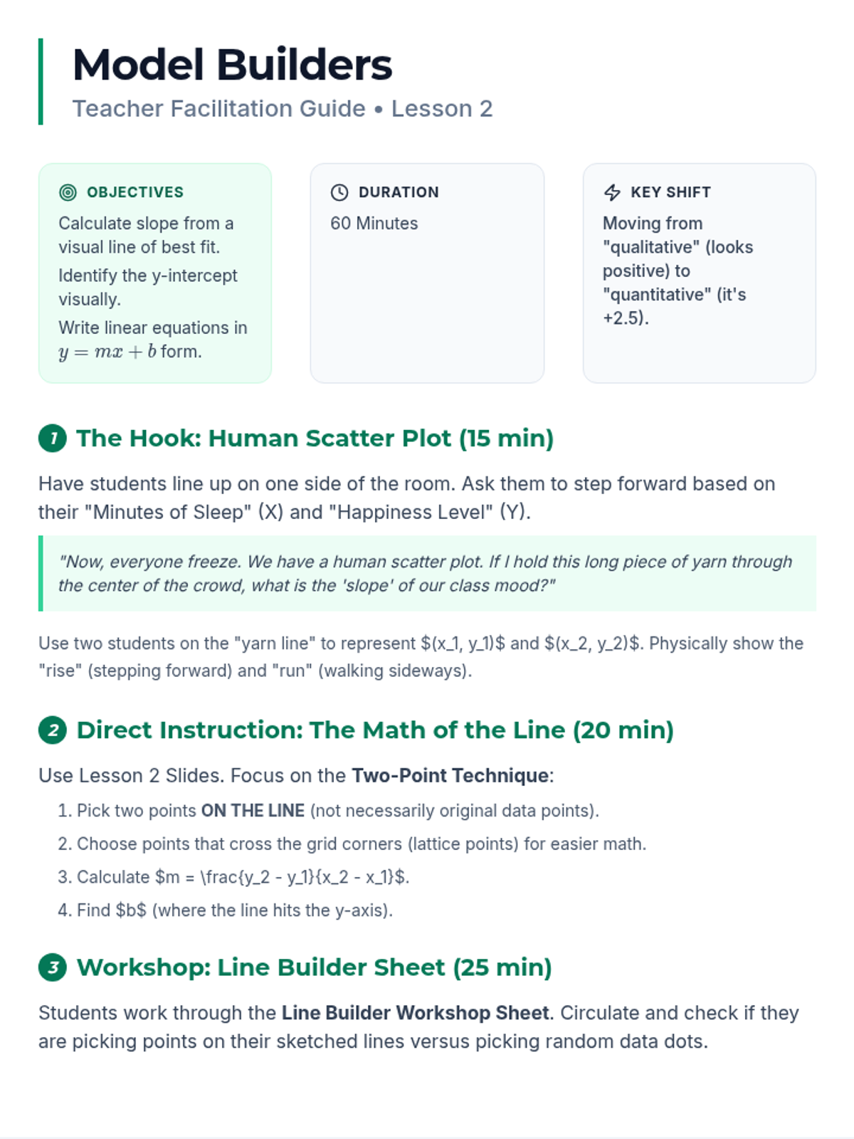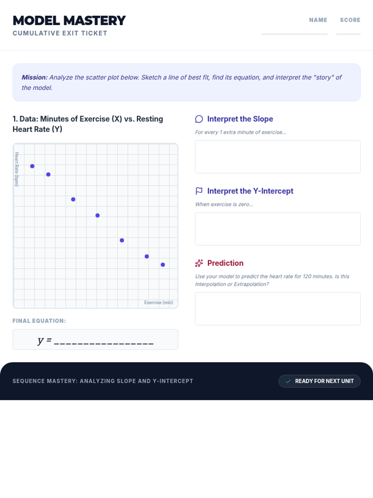 This sequence guides 9th-grade students through the process of interpreting linear models, moving from qualitative observations of scatter plots to quantitative interpretations of slope and y-intercept in real-world contexts. Students will learn to construct trend lines, write equations, and use those models to make informed predictions.