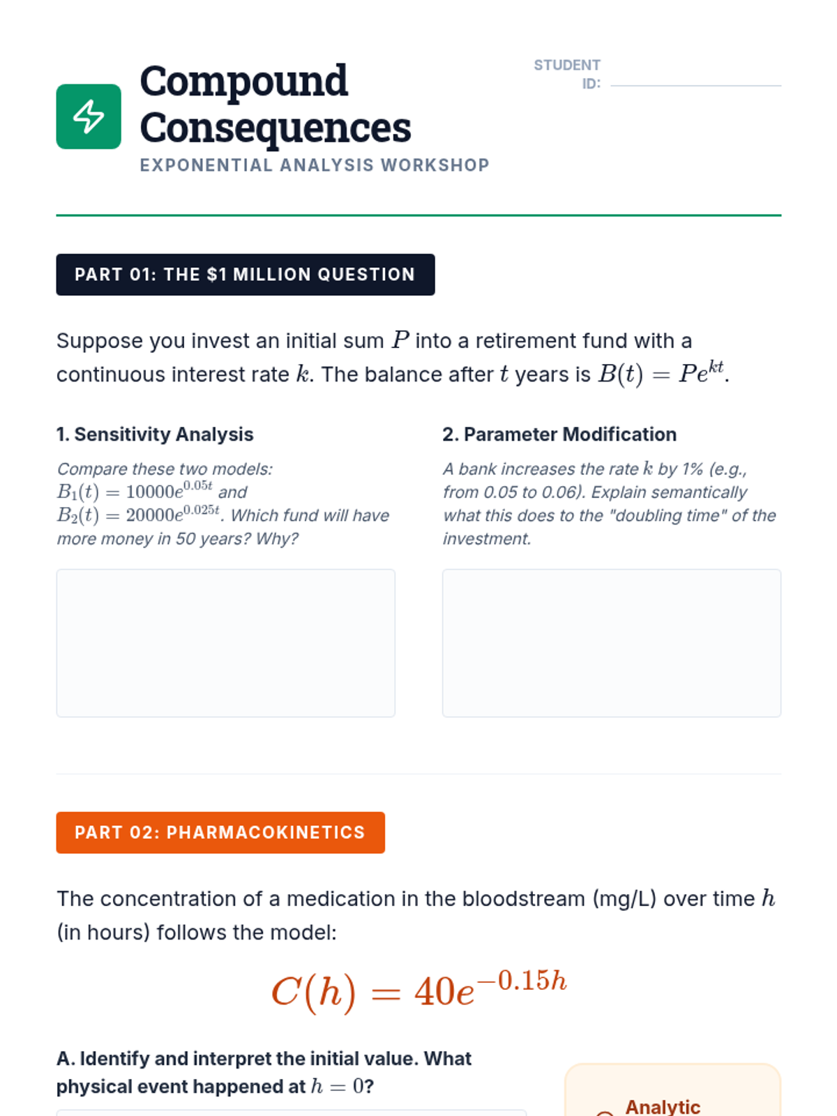 This sequence explores numerical analysis through the lens of sequences, focusing on iterative methods to approximate solutions to complex equations. Students investigate fixed-point iteration, Newton's method, convergence rates, and the transition into chaotic behavior.