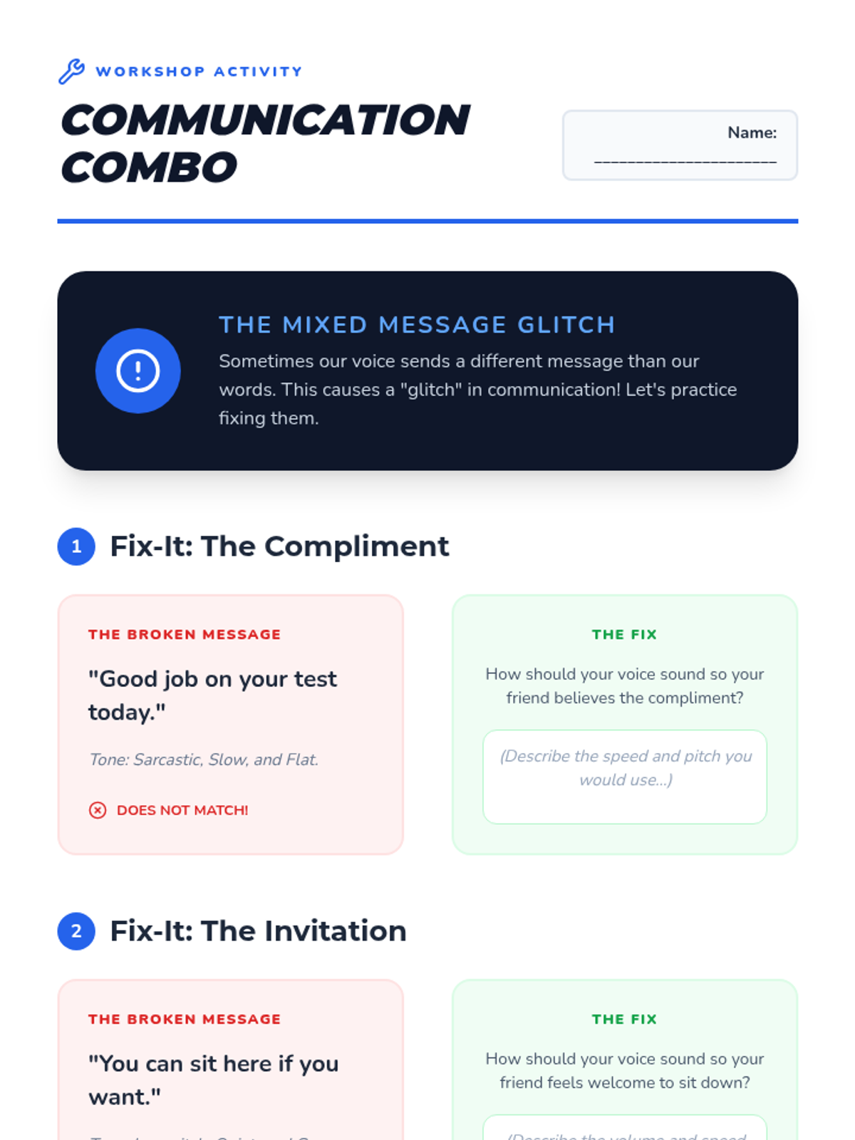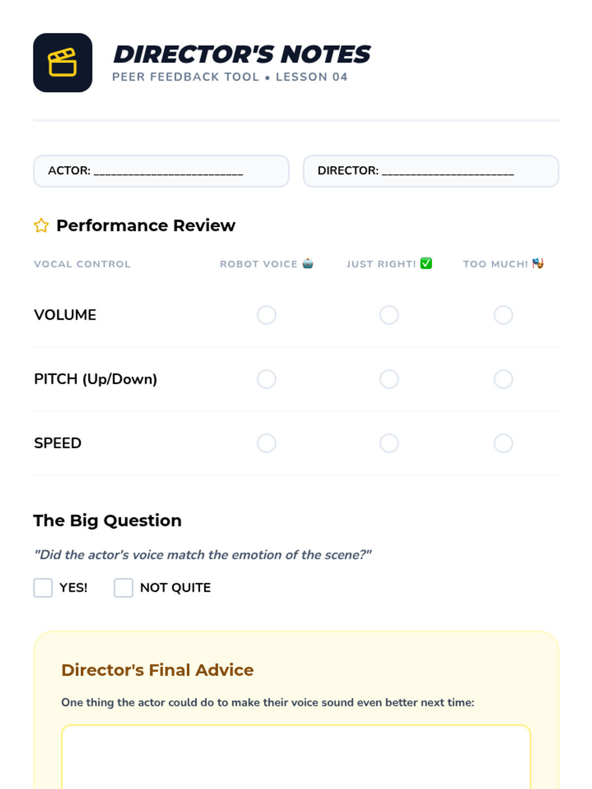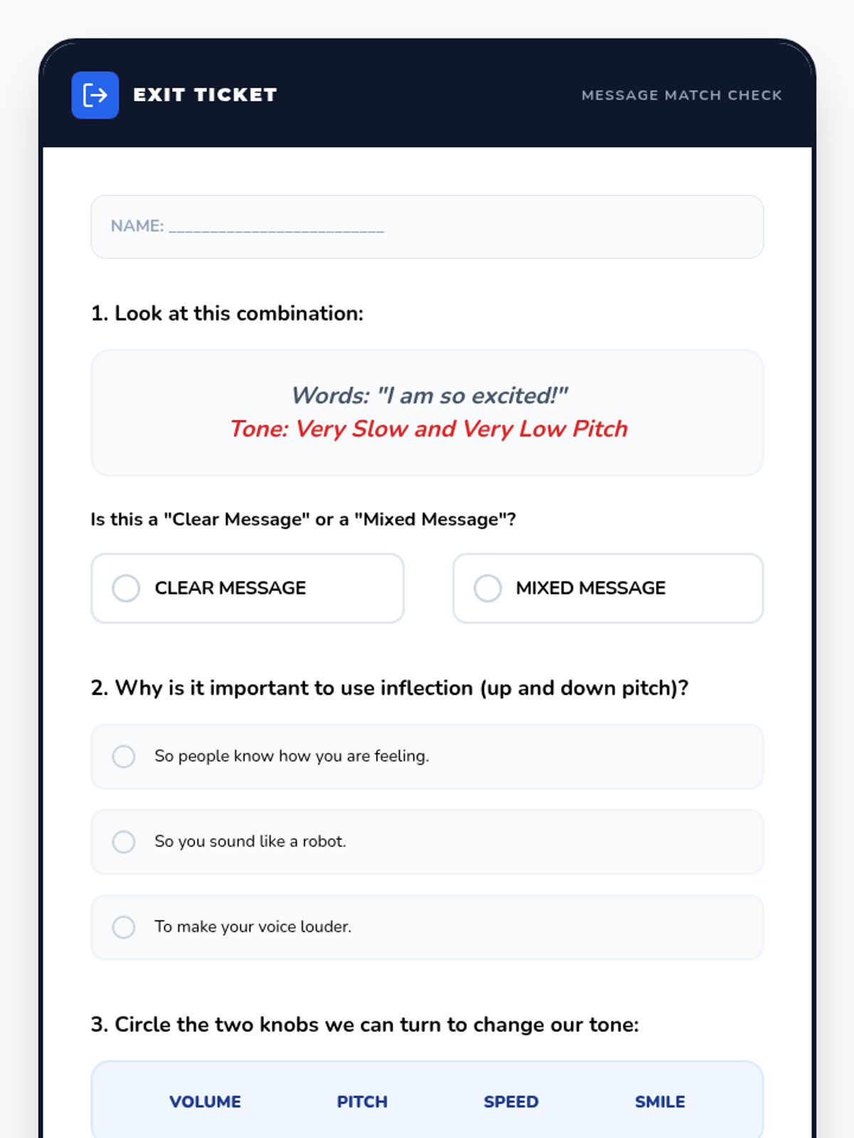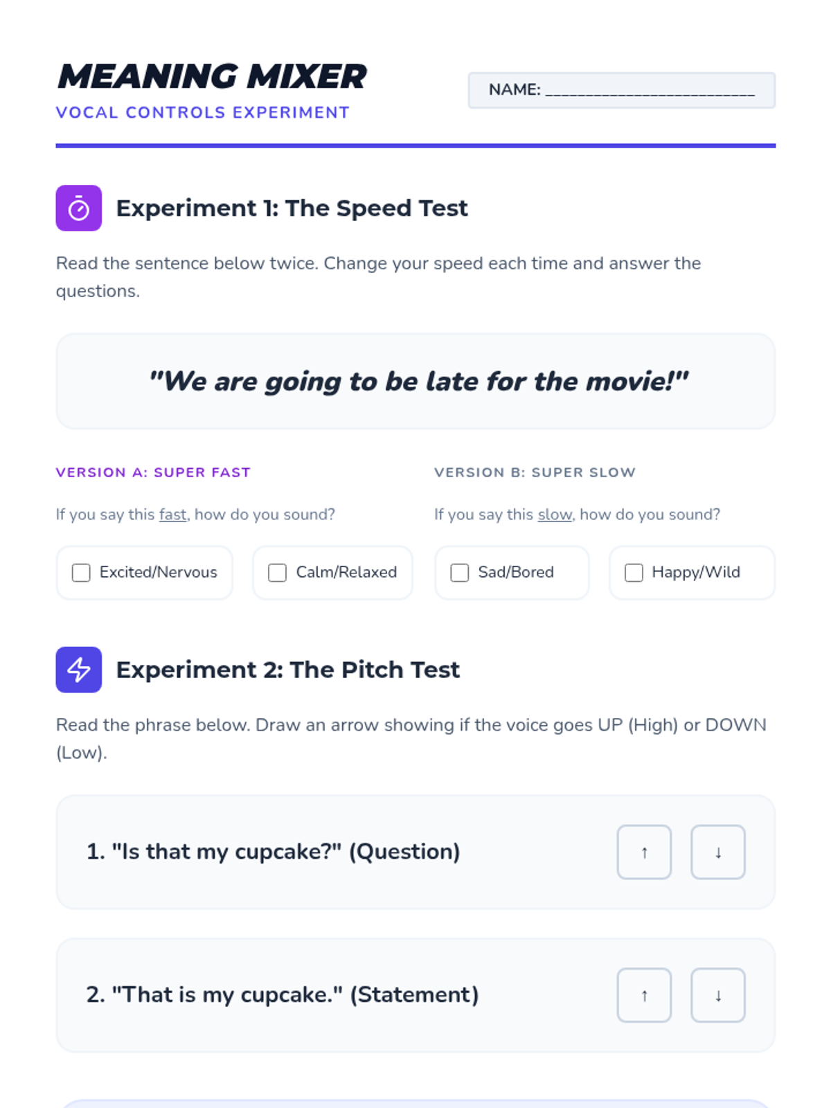 This sequence explores the nuances of tone and inflection, moving beyond volume to how emotion is carried in the voice. Students use simulation and role-play to investigate how pitch, speed, and volume alter meaning, culminating in the ability to align their vocal delivery with their social intent.