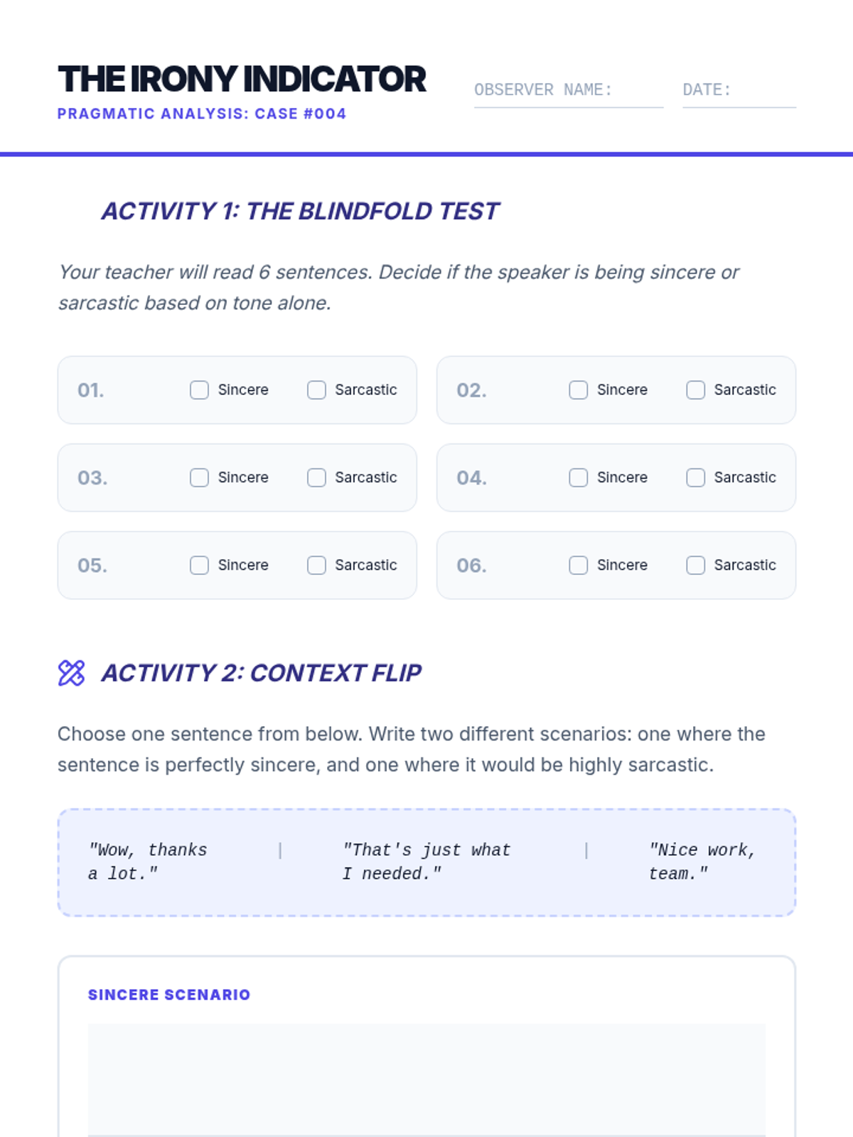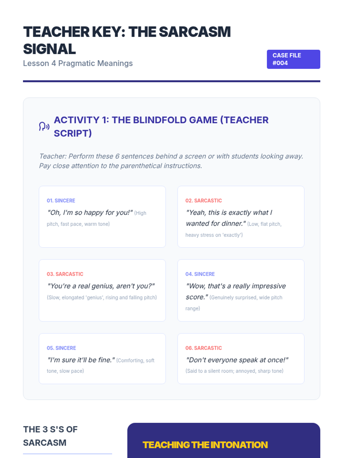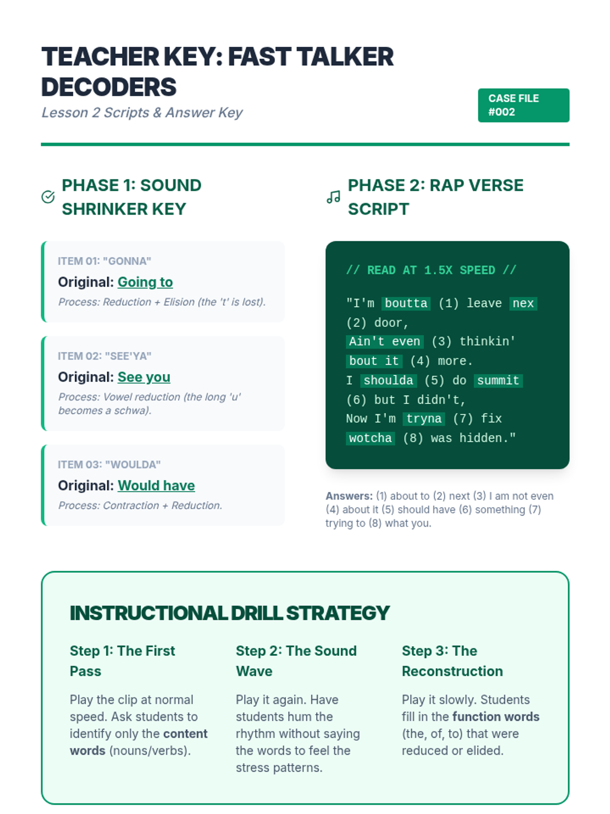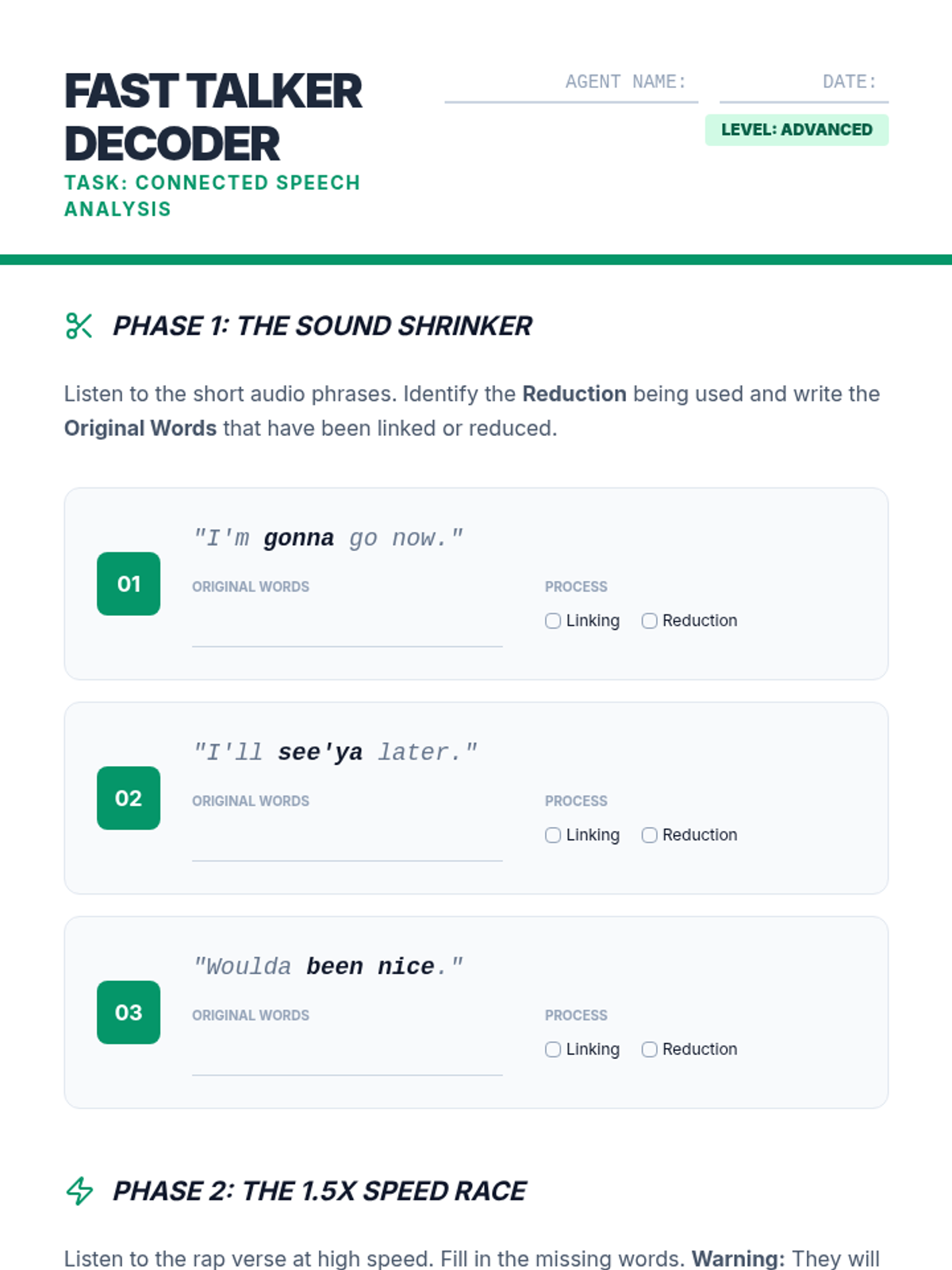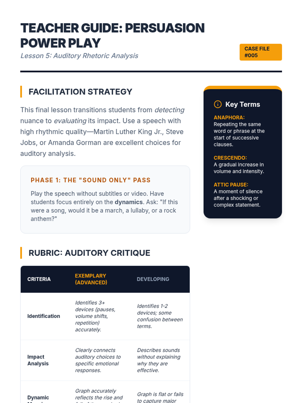 An advanced 8th Grade ESL listening sequence that teaches students to move beyond literal comprehension. Students learn to decode global accents, connected speech, speaker bias, sarcasm, and rhetorical devices through authentic-style audio analysis and investigative tasks.