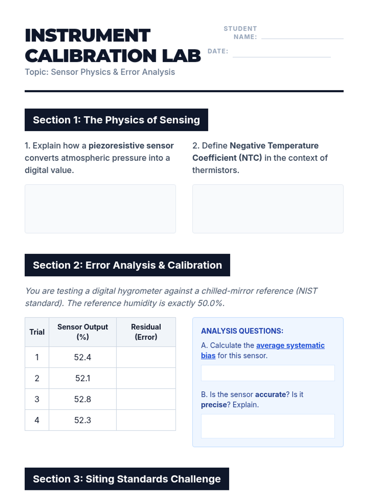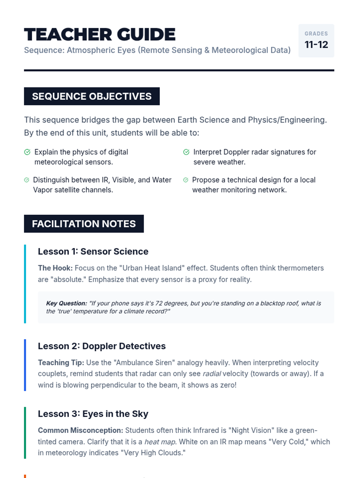 A technical Earth Science sequence for 12th-grade students focusing on the engineering and physics of meteorological observation, including sensor technology, radar principles, satellite imagery, and network design.