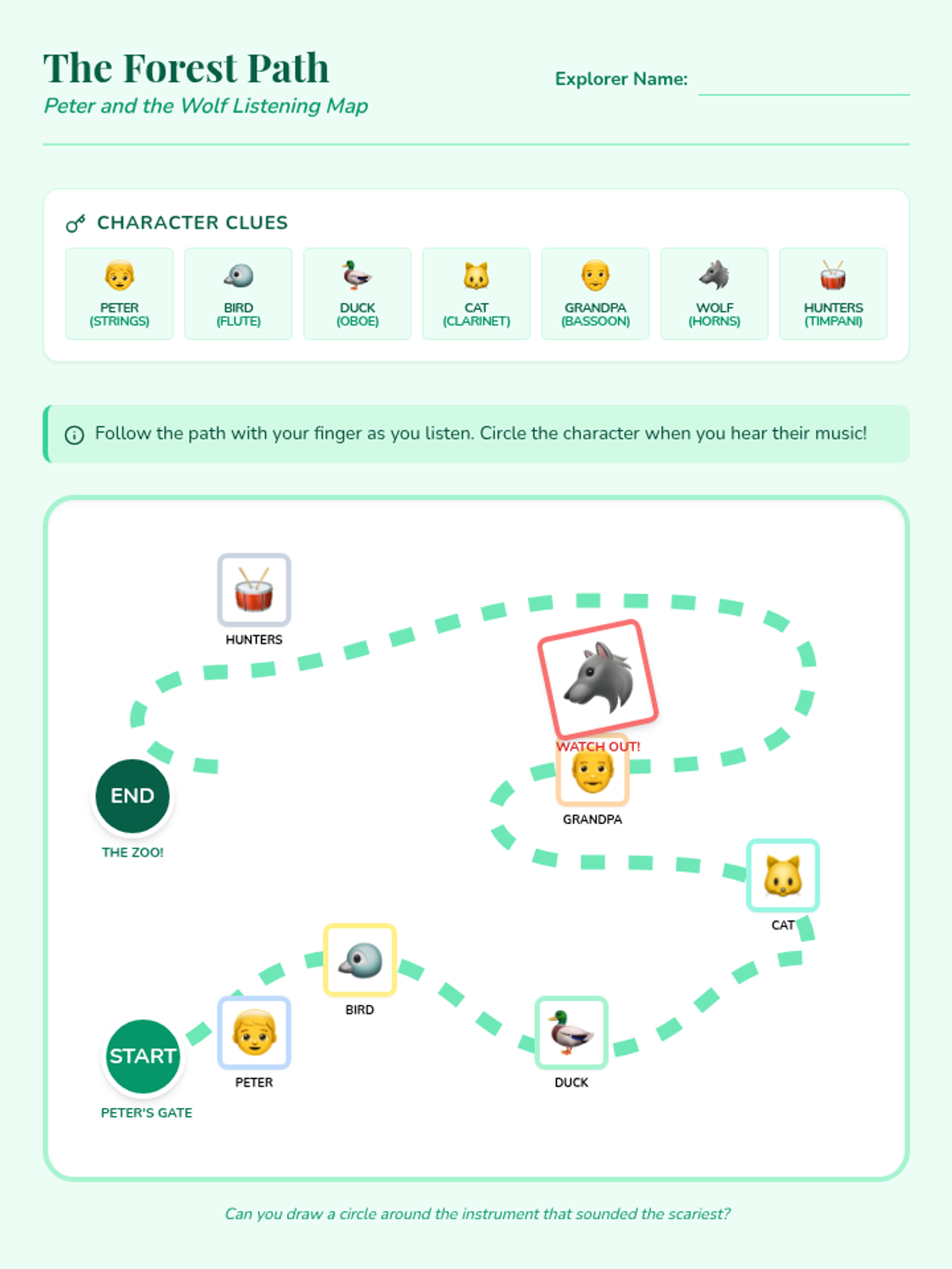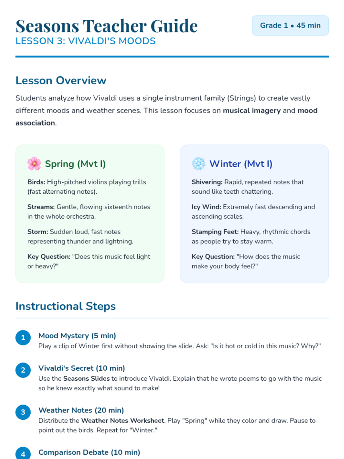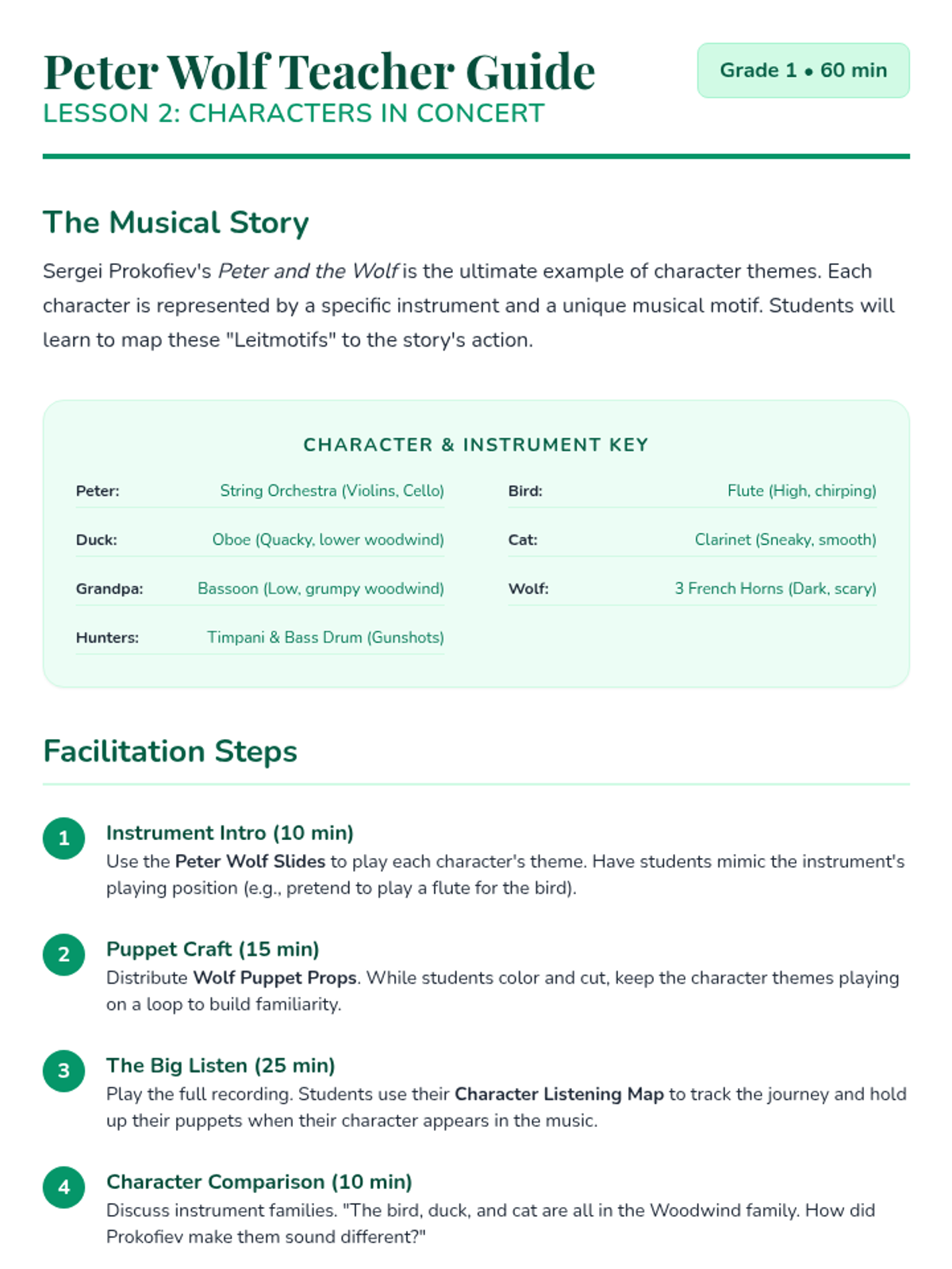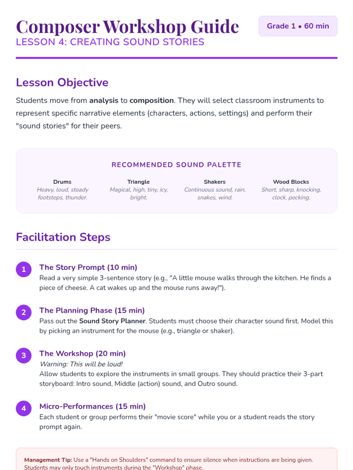 A 1st Grade music sequence focused on programmatic music, teaching students how composers use instruments, tempo, and pitch to tell stories without words. Students explore famous works like Saint-Saëns' Carnival of the Animals, Prokofiev's Peter and the Wolf, and Vivaldi's Four Seasons before creating their own sound stories.