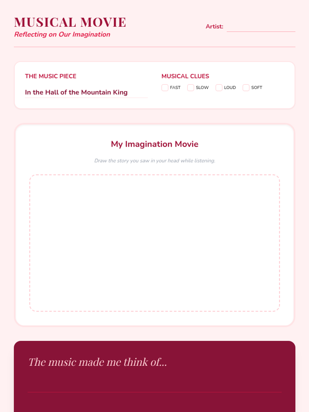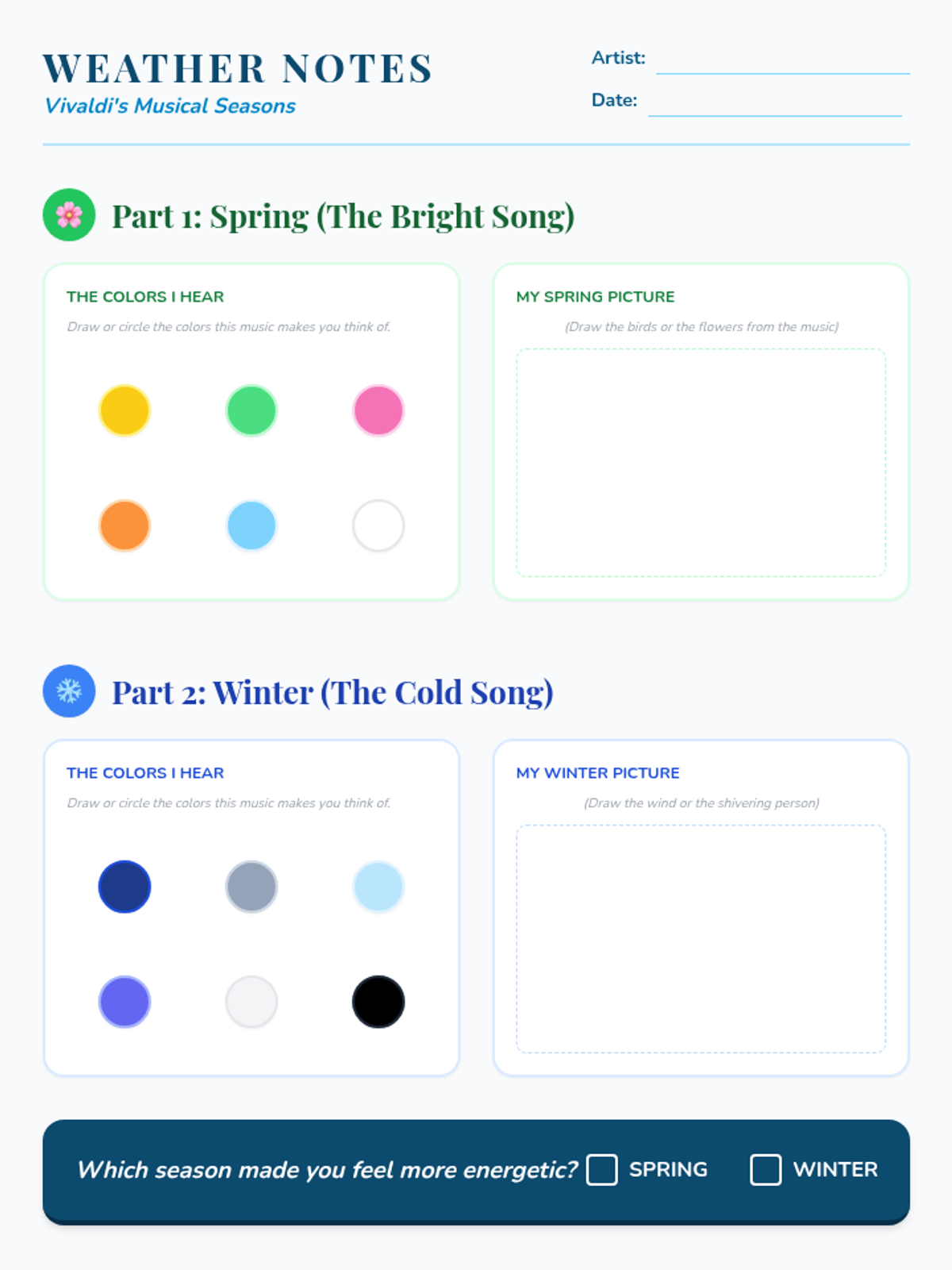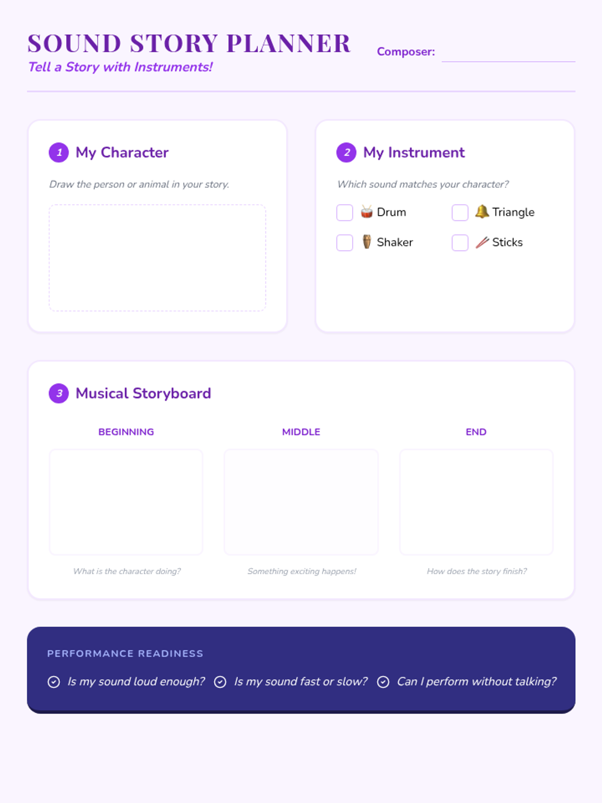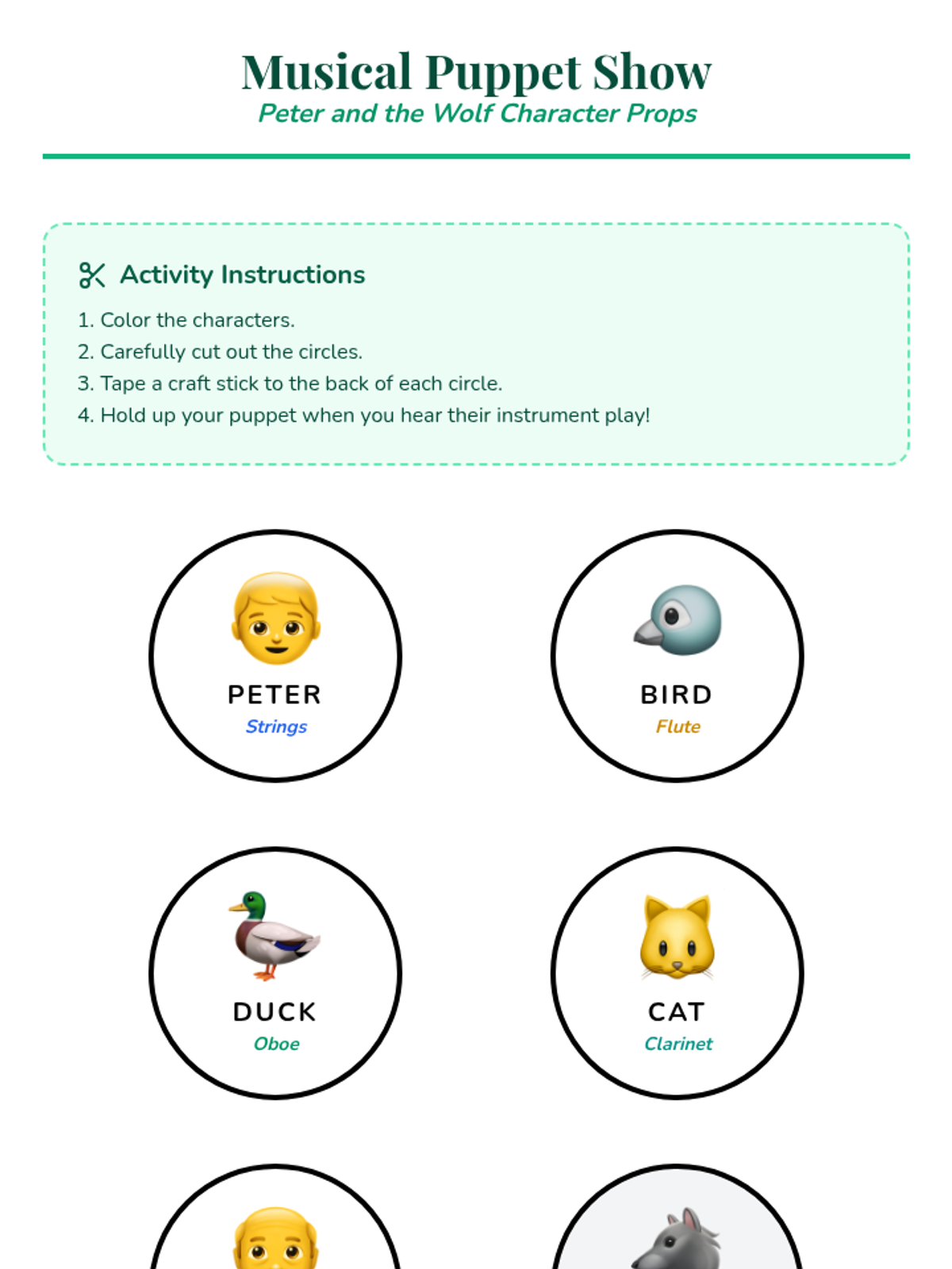 A 1st Grade music sequence focused on programmatic music, teaching students how composers use instruments, tempo, and pitch to tell stories without words. Students explore famous works like Saint-Saëns' Carnival of the Animals, Prokofiev's Peter and the Wolf, and Vivaldi's Four Seasons before creating their own sound stories.