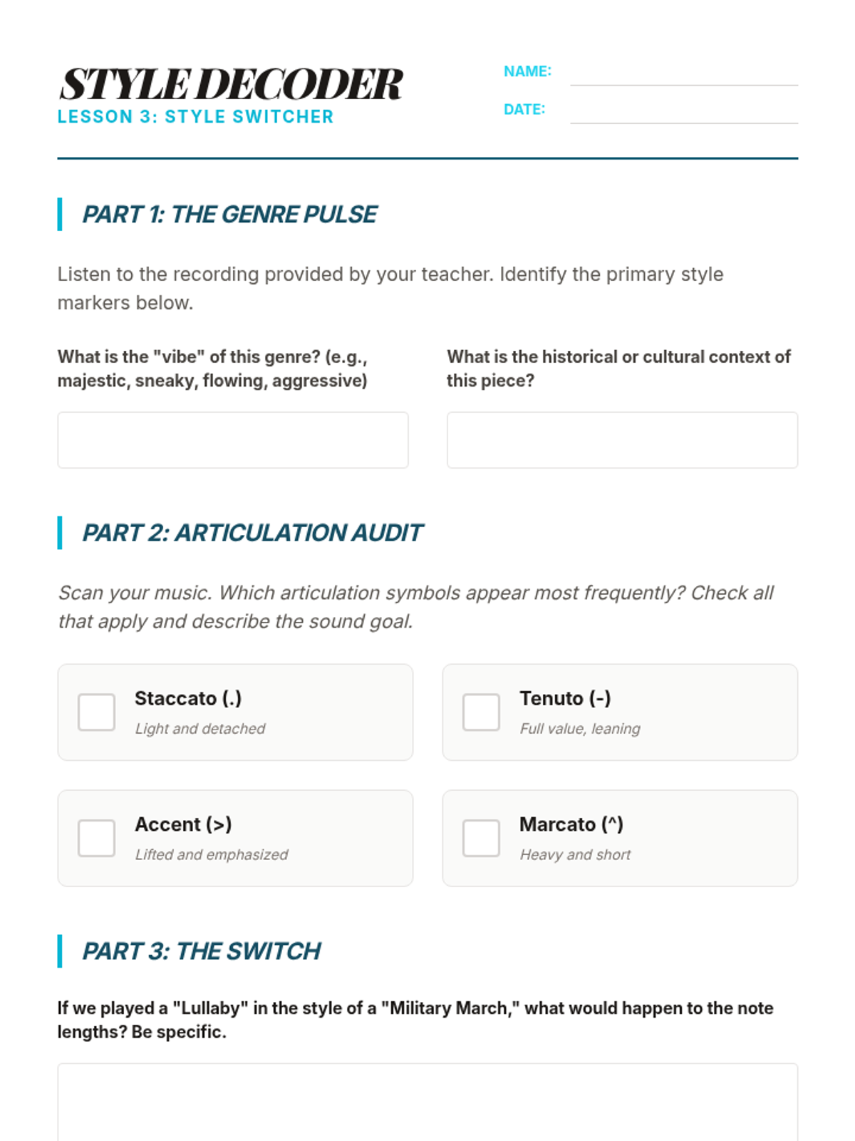 A comprehensive score analysis framework for middle school band and choir ensembles that integrates music literacy with text-based evidence and academic rigor. Students learn to 'read' a musical score as a primary source document, identifying technical elements and structural patterns while providing specific citations for their findings.