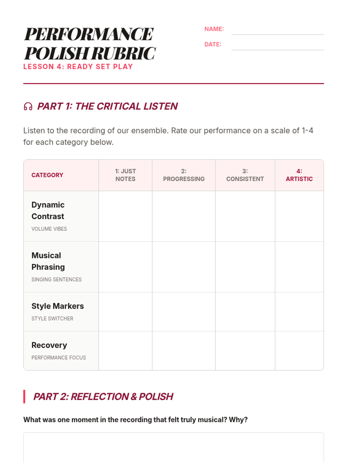 This sequence guides 6th-grade instrumentalists through the transition from technical accuracy to artistic expression, focusing on dynamics, phrasing, style, and performance readiness.