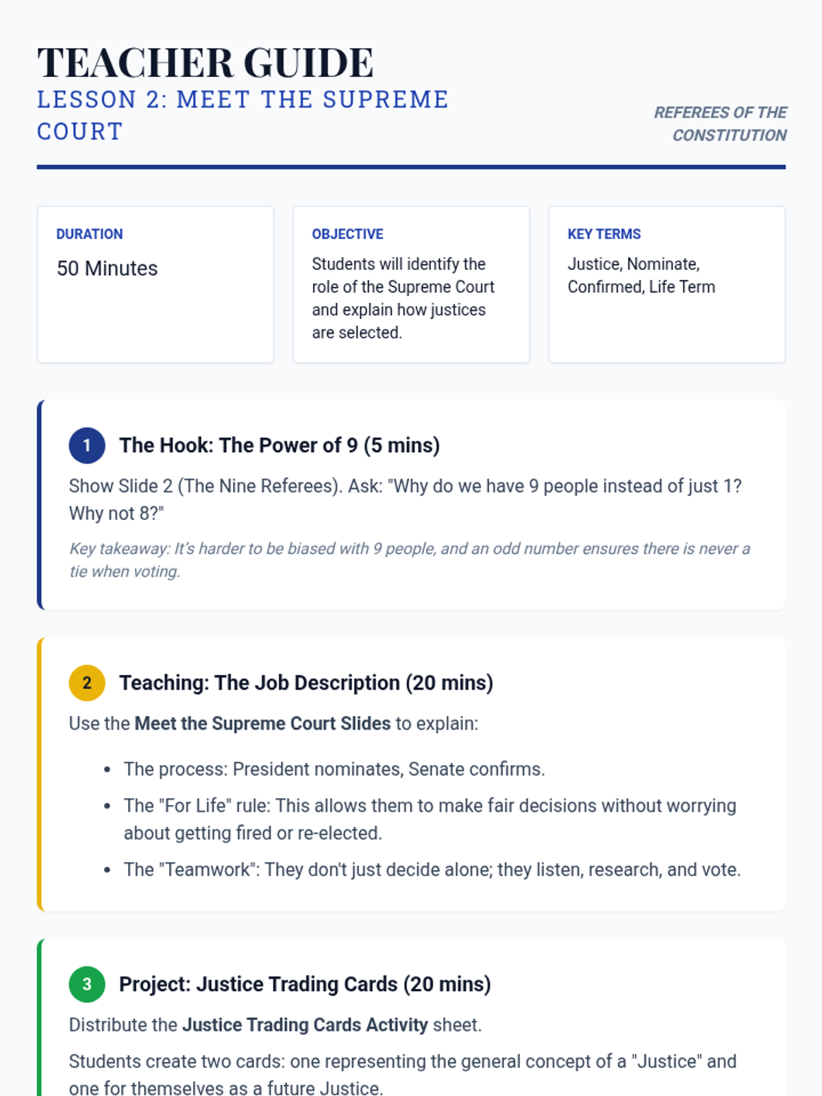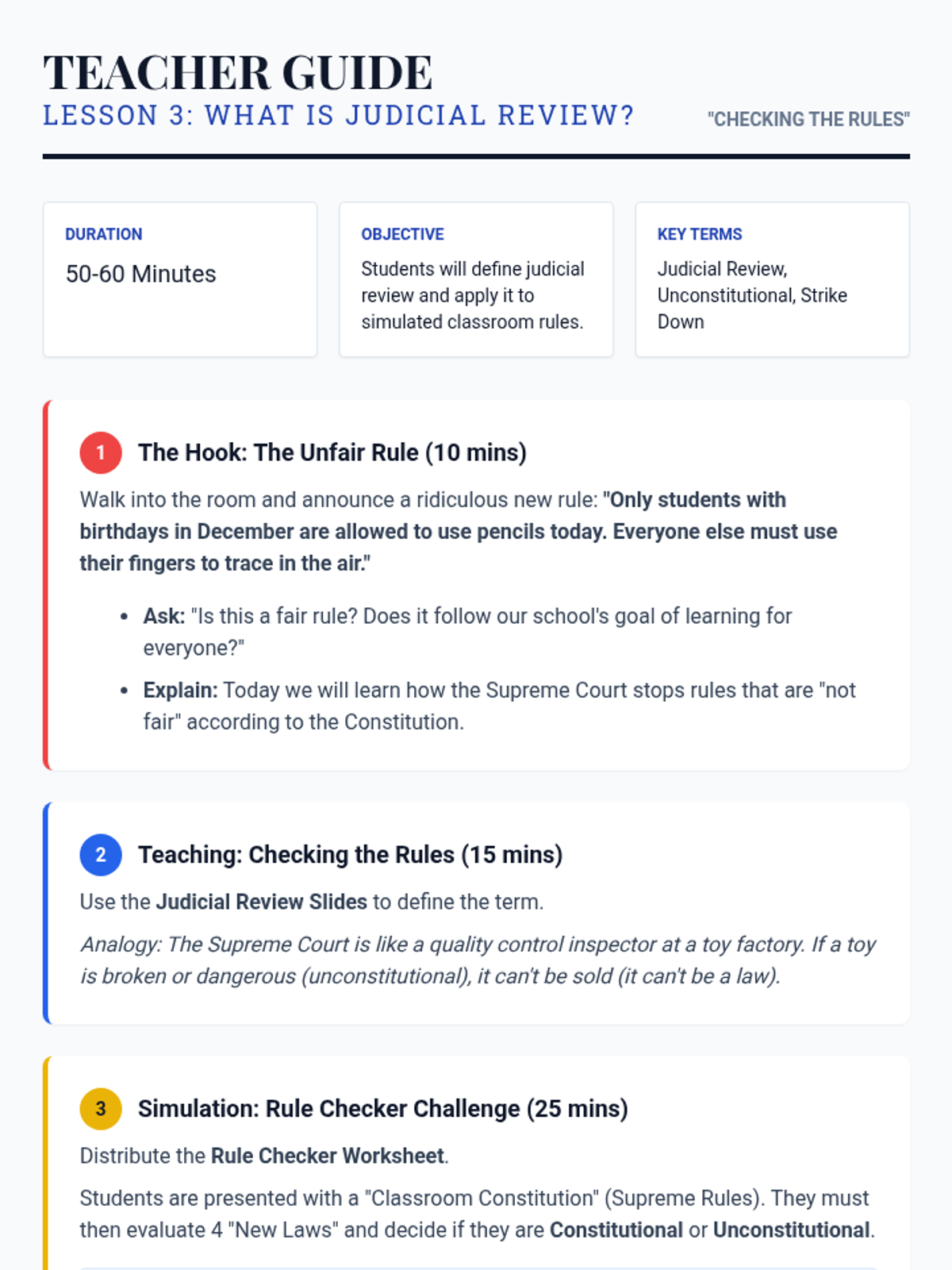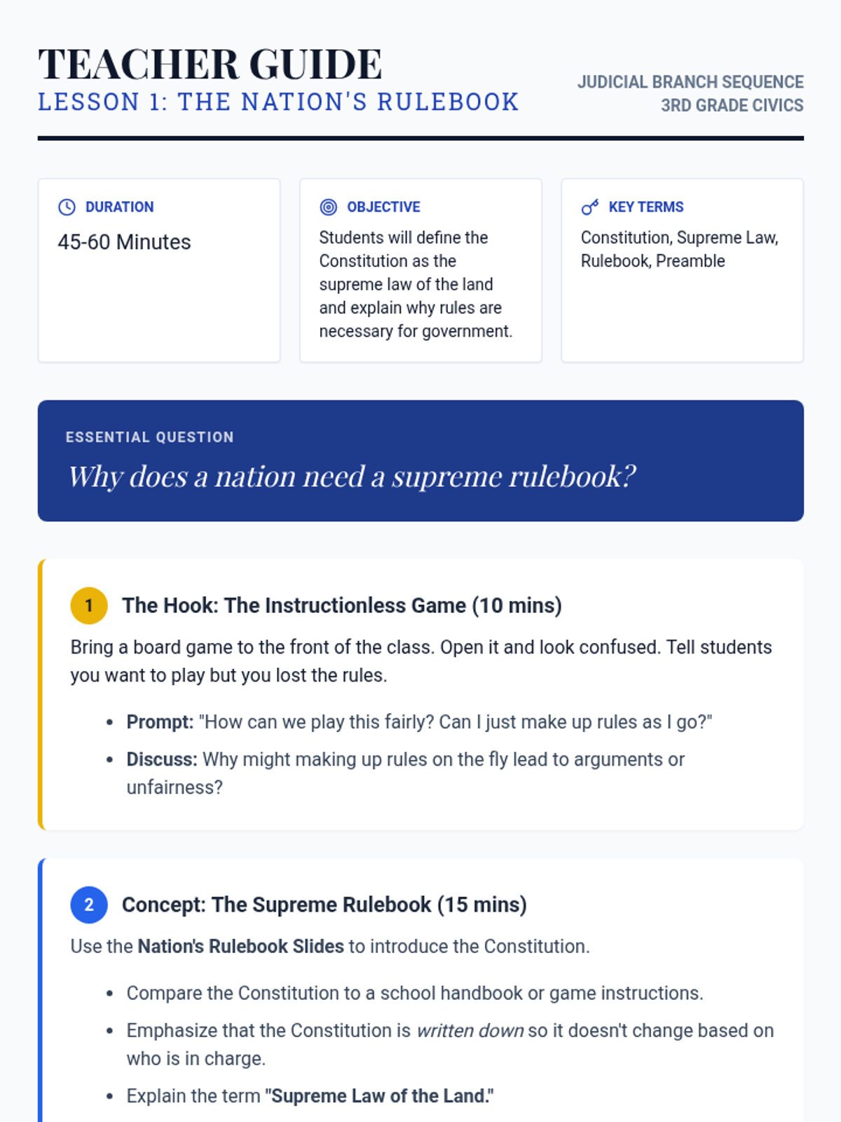 A 5-lesson sequence for 3rd-grade students exploring the Judicial Branch, the Constitution as the supreme rulebook, and the role of Supreme Court Justices through storytelling and relatable case studies.