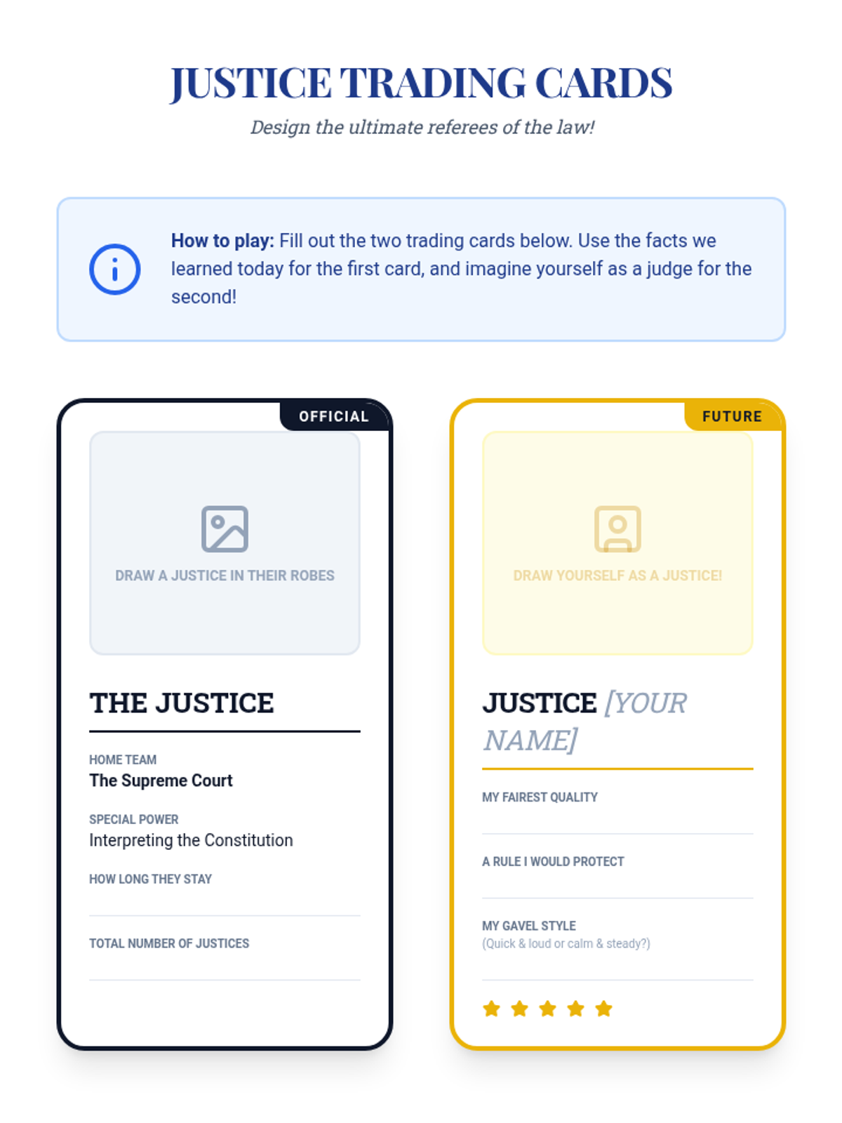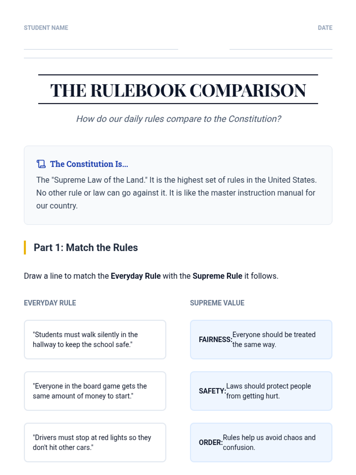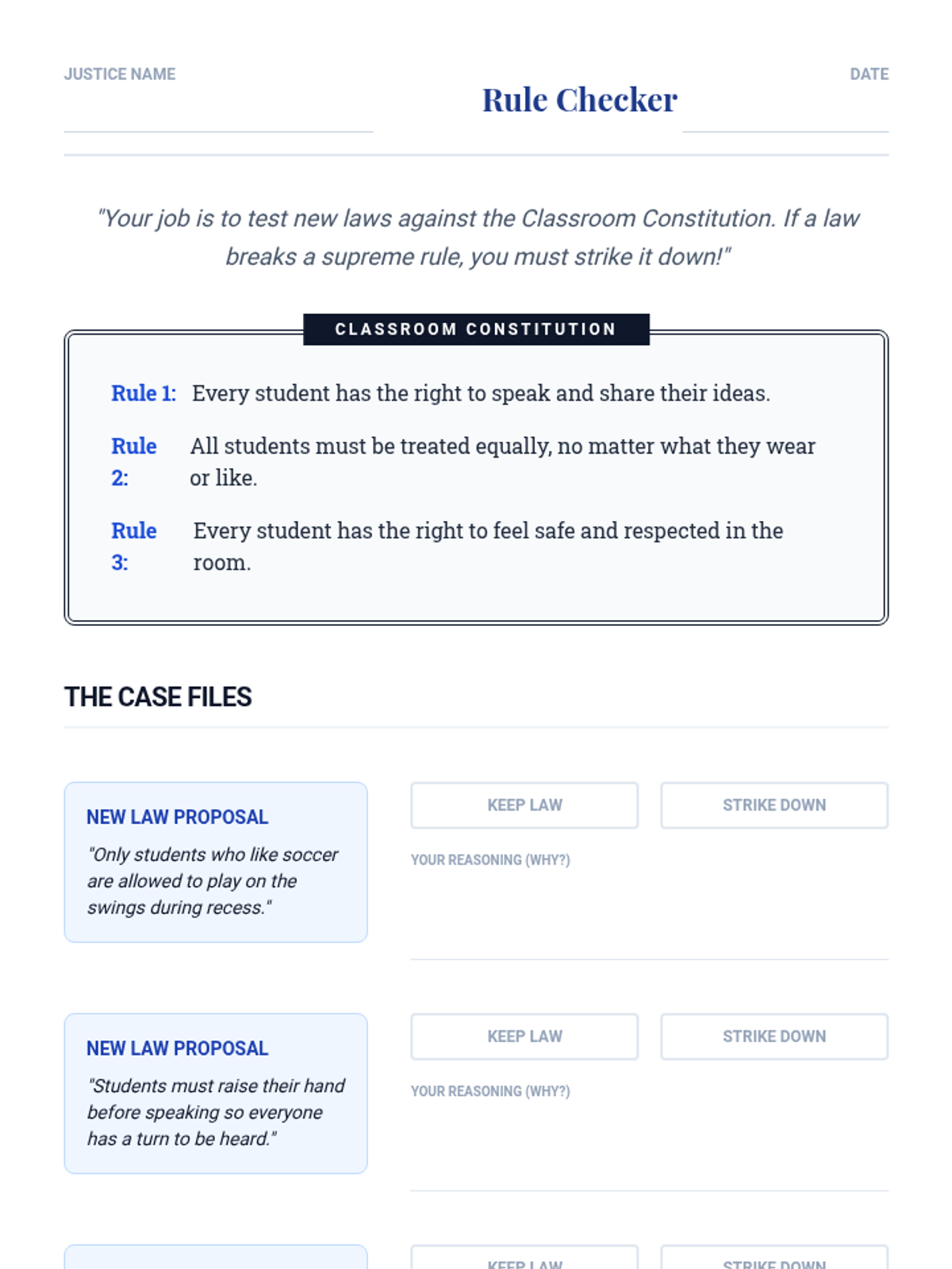 A 5-lesson sequence for 3rd-grade students exploring the Judicial Branch, the Constitution as the supreme rulebook, and the role of Supreme Court Justices through storytelling and relatable case studies.