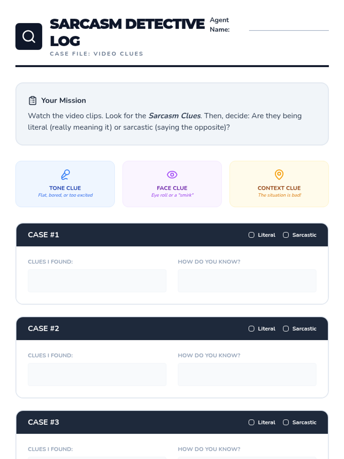 A 5-lesson sequence designed for 3rd-grade students in special education to develop social communication skills. Students learn to interpret tone of voice, recognize sarcasm as the 'opposite' of literal meaning, and understand the social nuances of when sarcasm is appropriate.