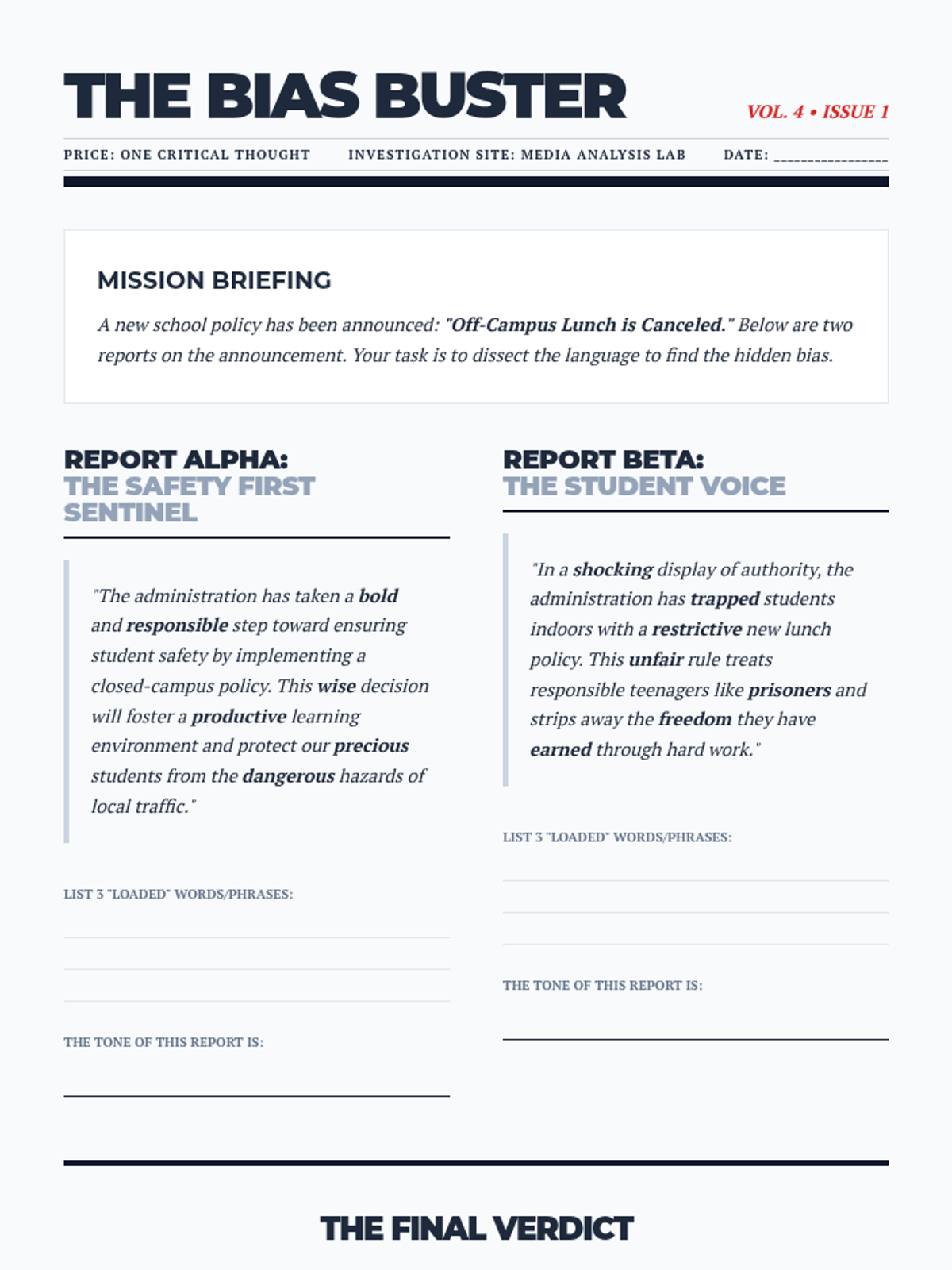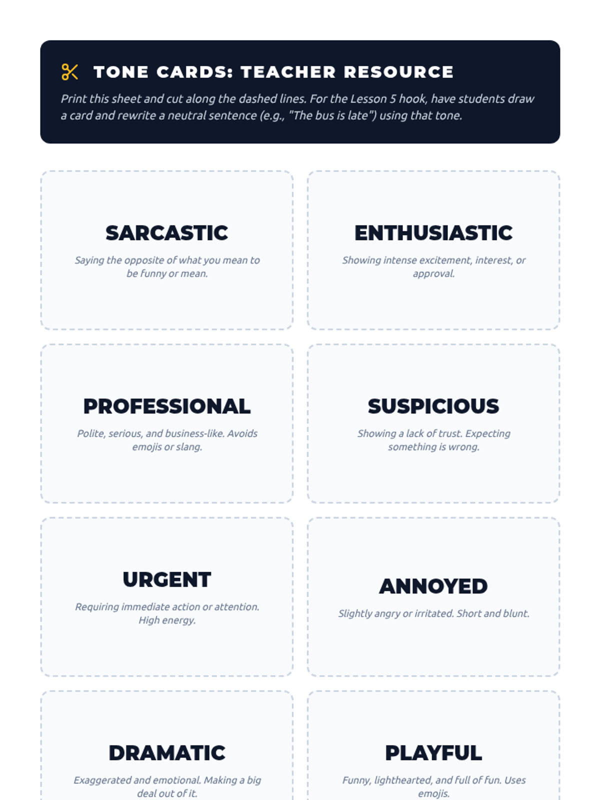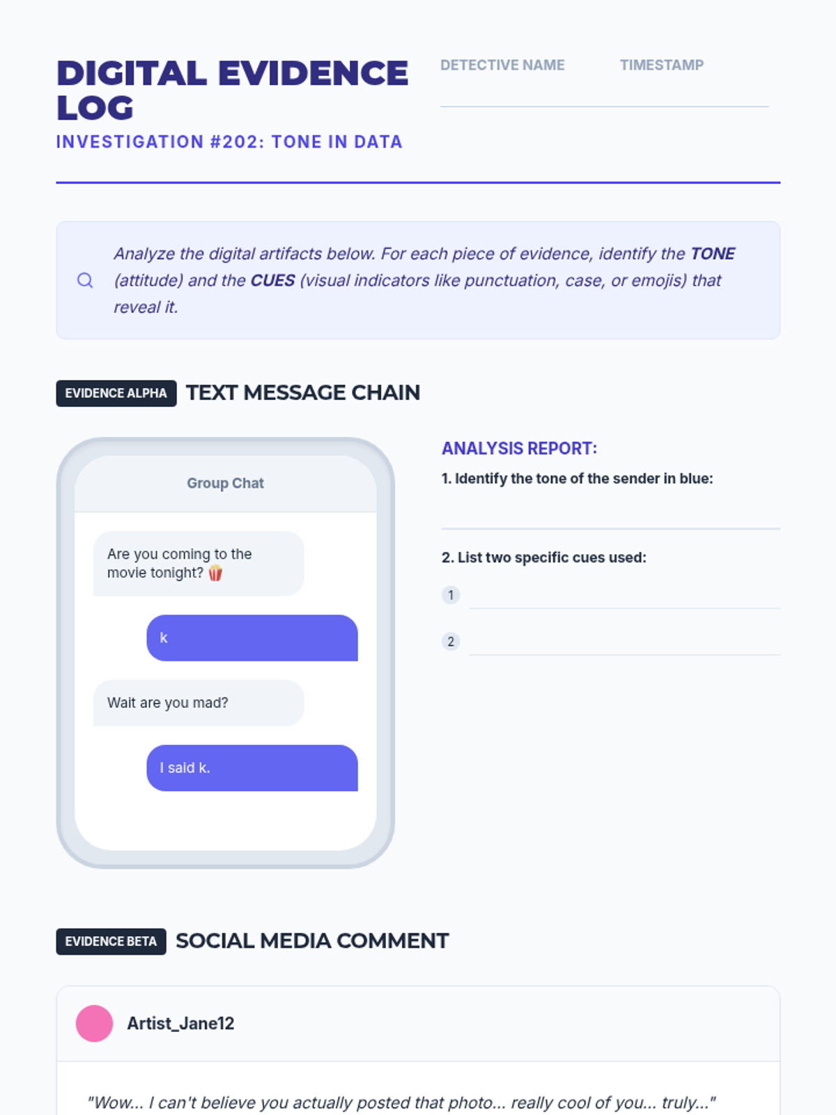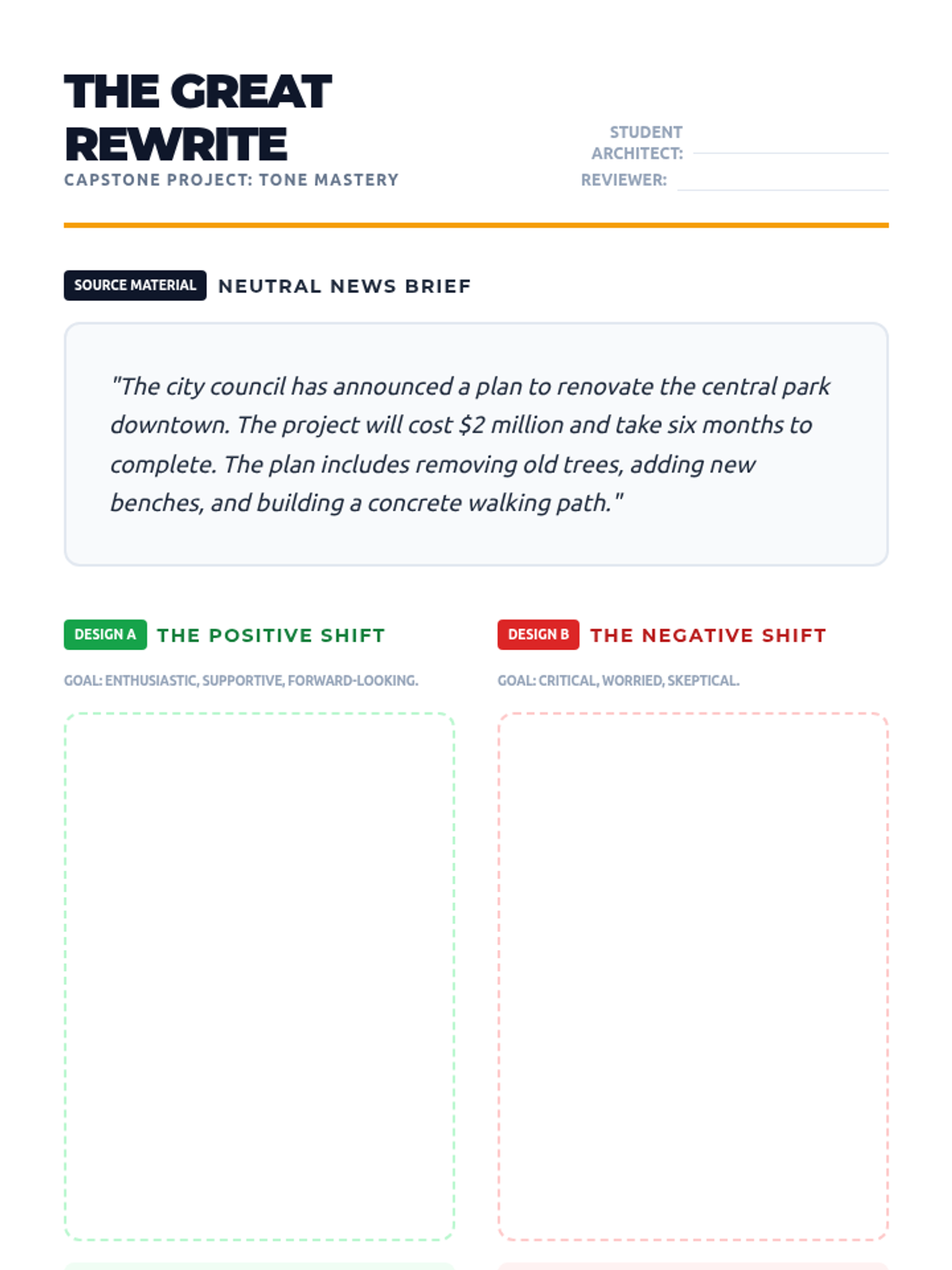 This sequence explores how word choice affects meaning, focusing on connotation, tone, and mood in both literary and digital media. Students investigate how changing a single word can shift a sentence from positive to negative or from formal to informal, concluding with a workshop where they revise texts for specific audiences.