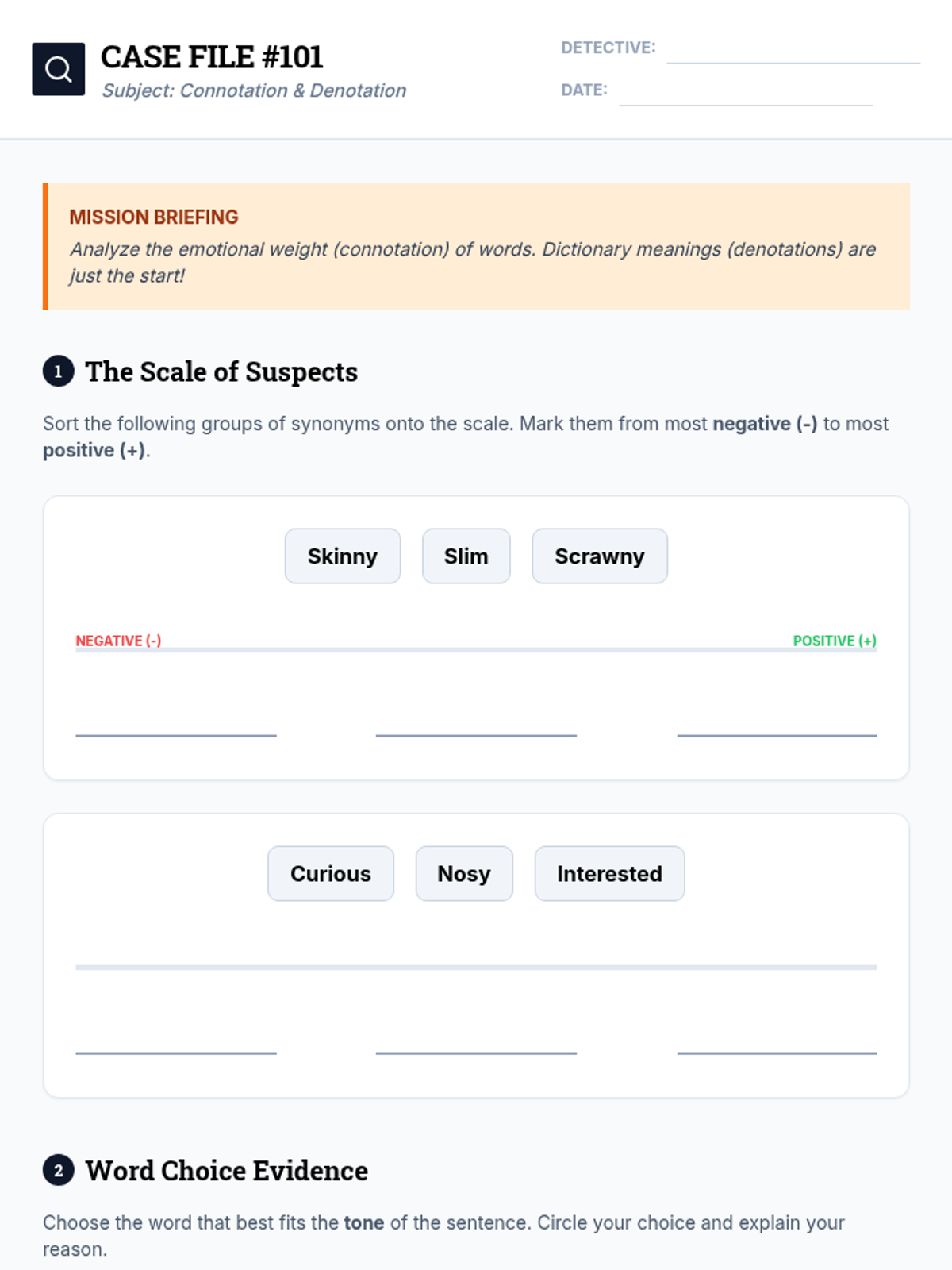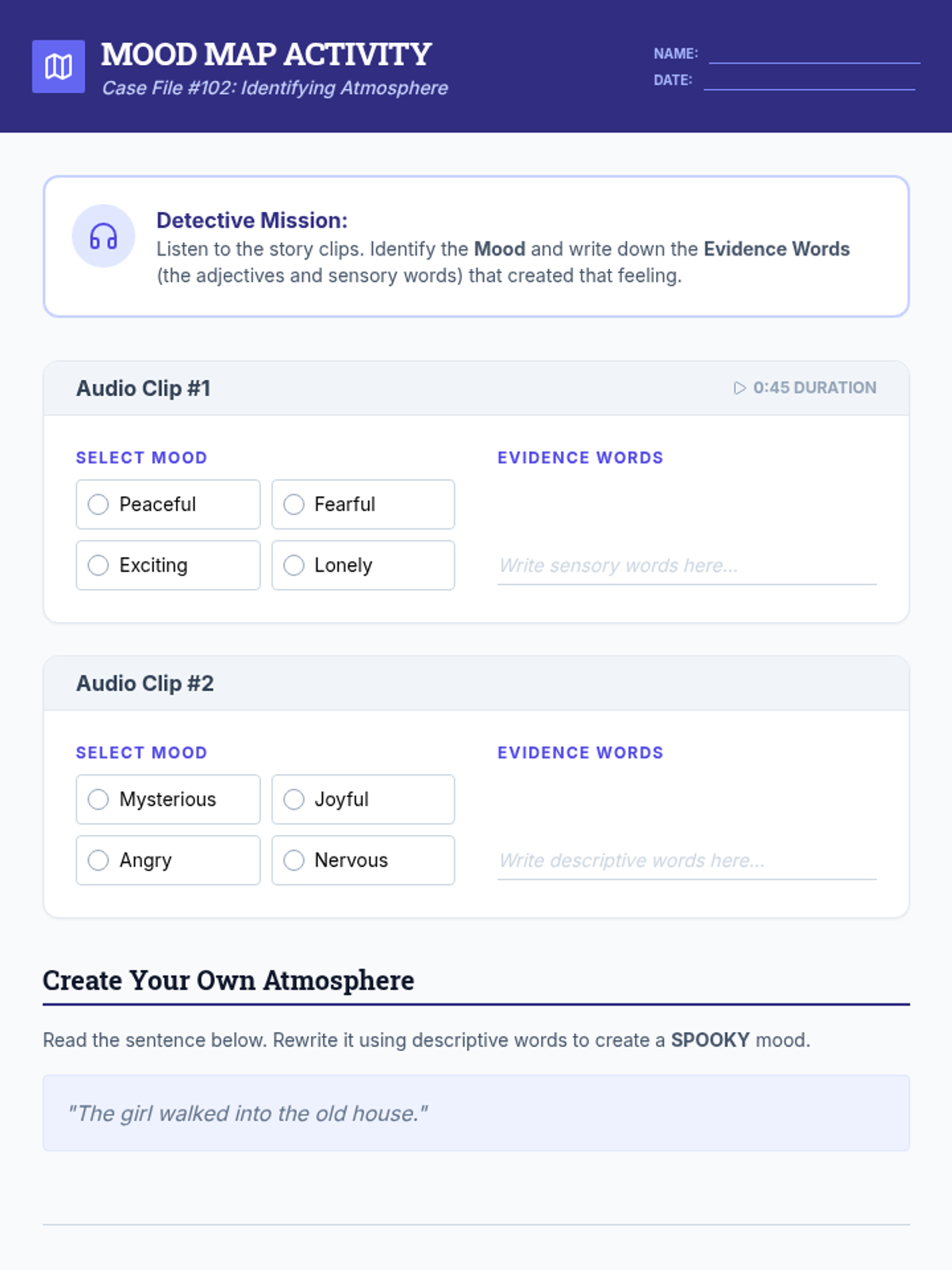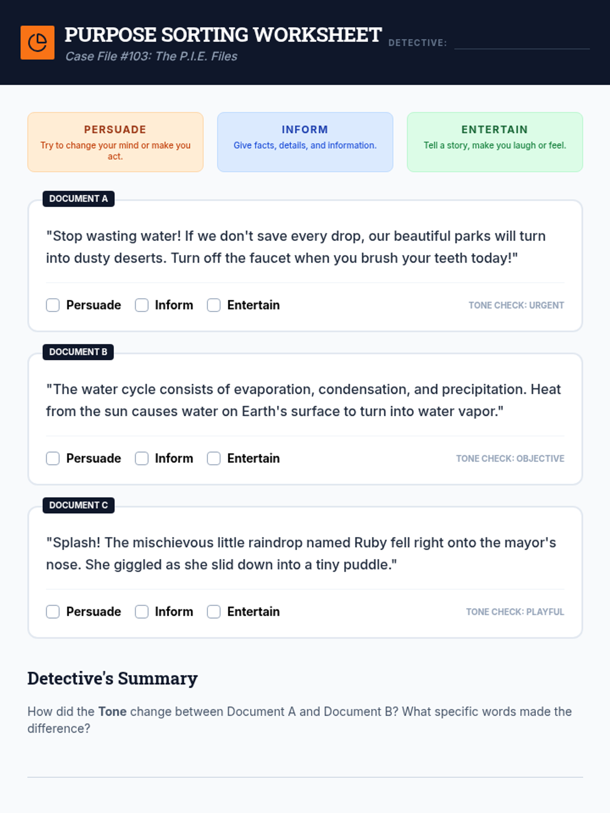 A 4th-grade sequence focused on interpreting tone, mood, and perspective through the lens of a detective agency. Students learn to analyze word choice, identify literary atmosphere, determine author's purpose, and recognize bias across various texts.