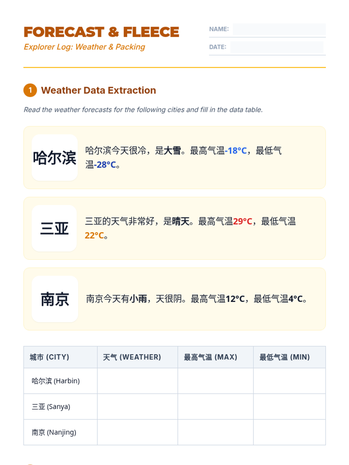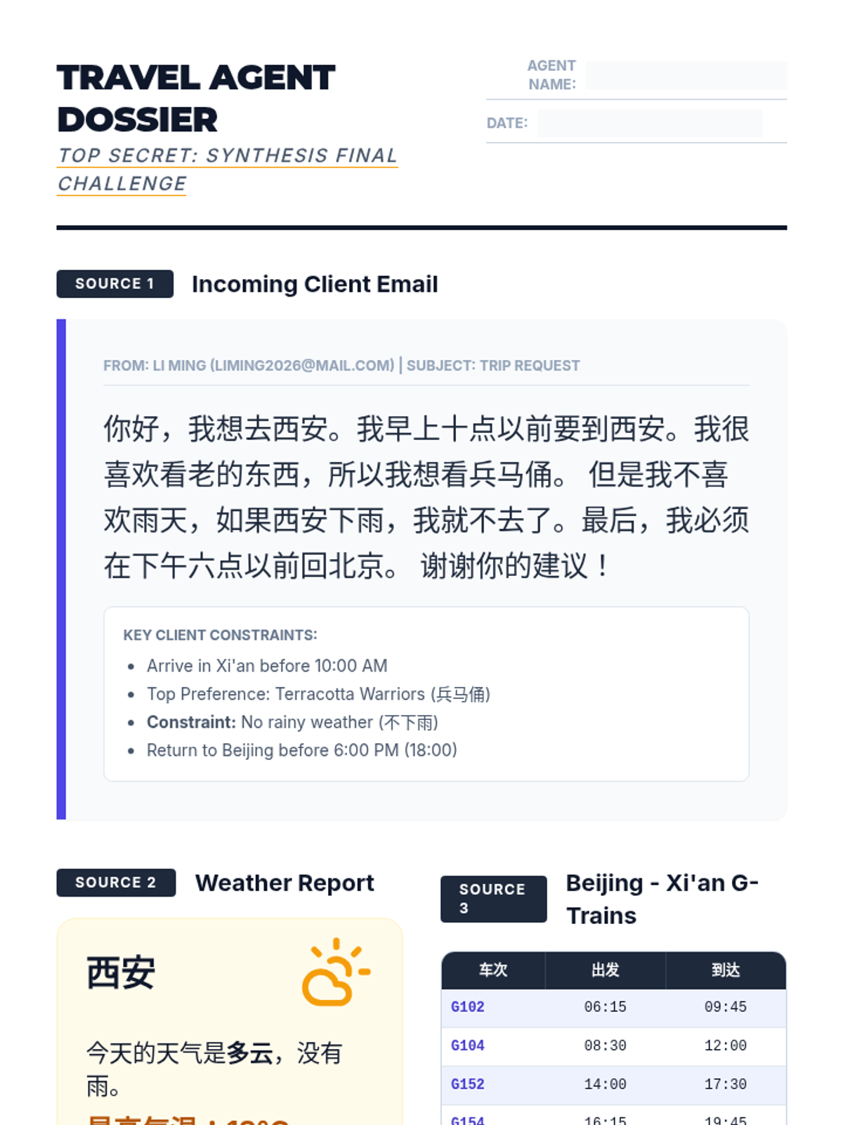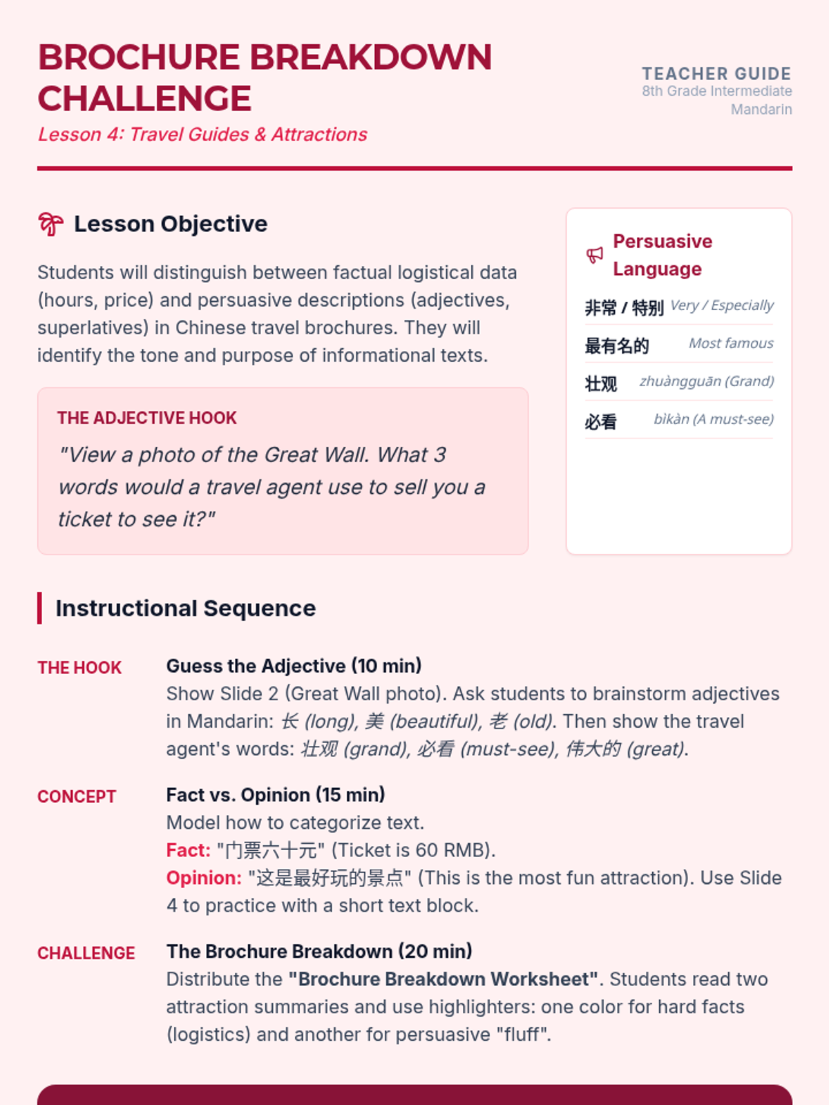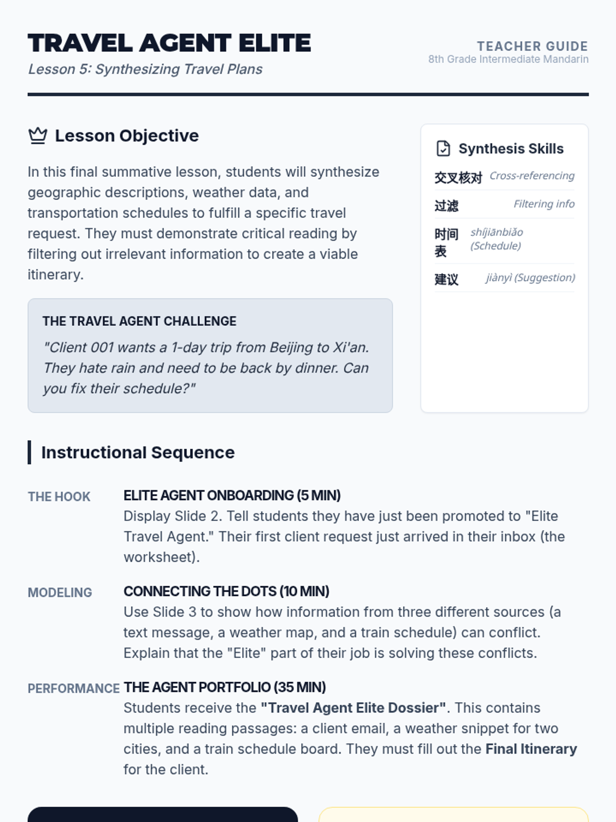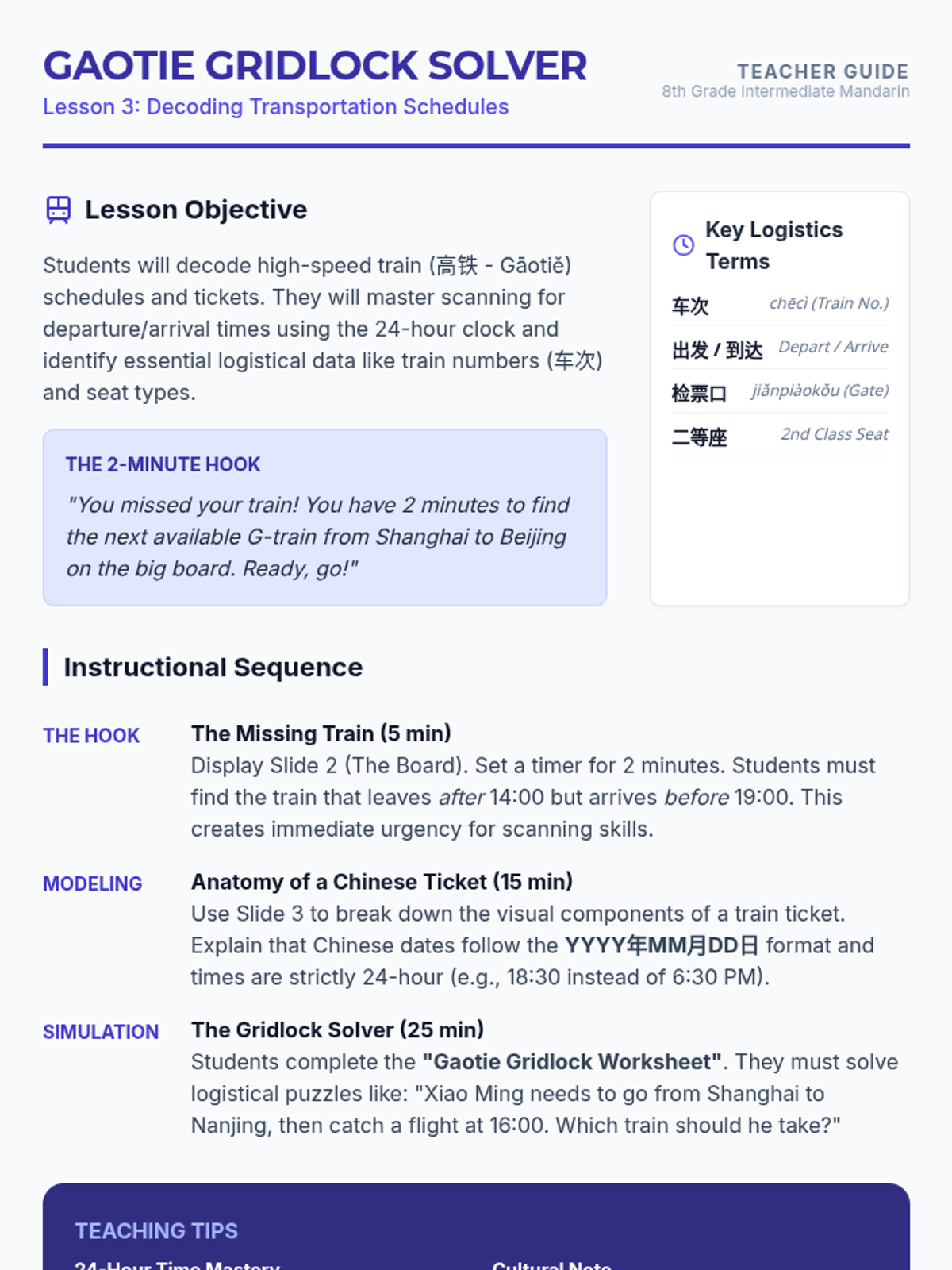 This 8th-grade Intermediate Mandarin sequence focuses on reading and interpreting practical travel information, from geographic descriptions and weather forecasts to train schedules and attraction brochures. Students develop functional literacy skills to navigate real-world logistical documents in a Chinese-speaking environment.