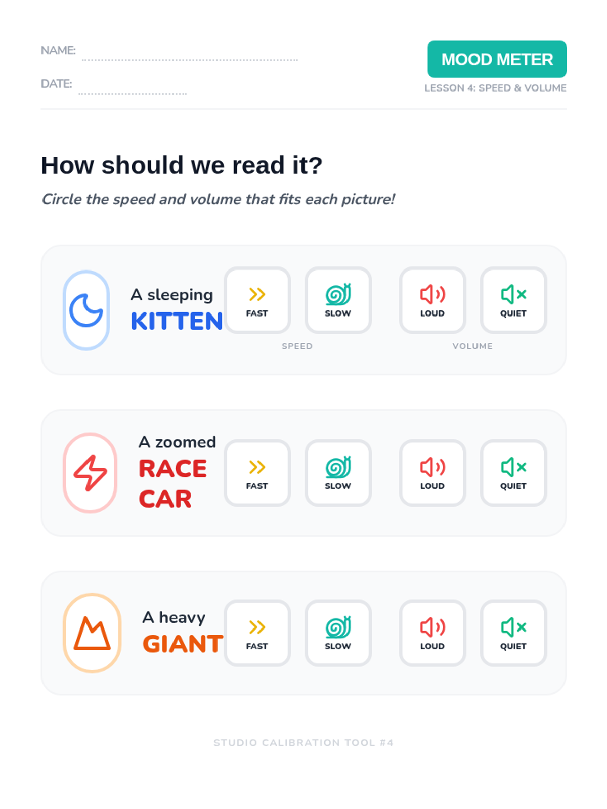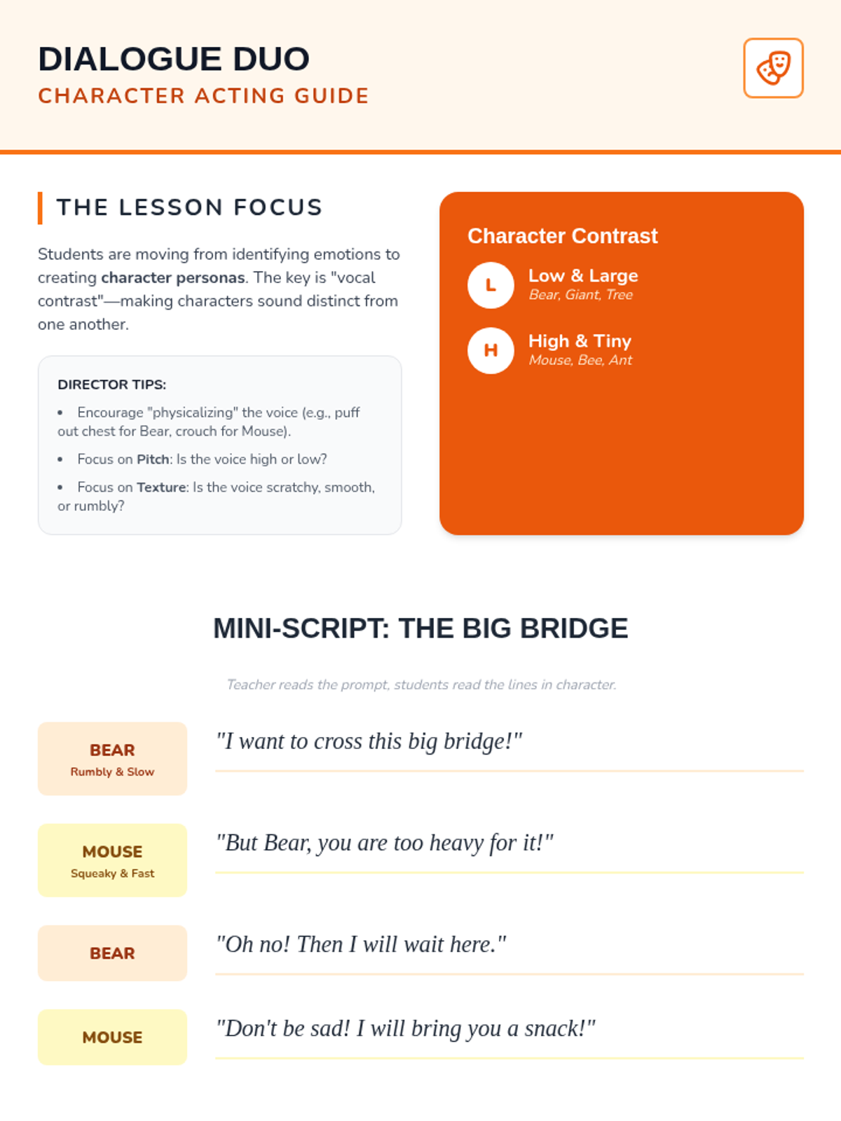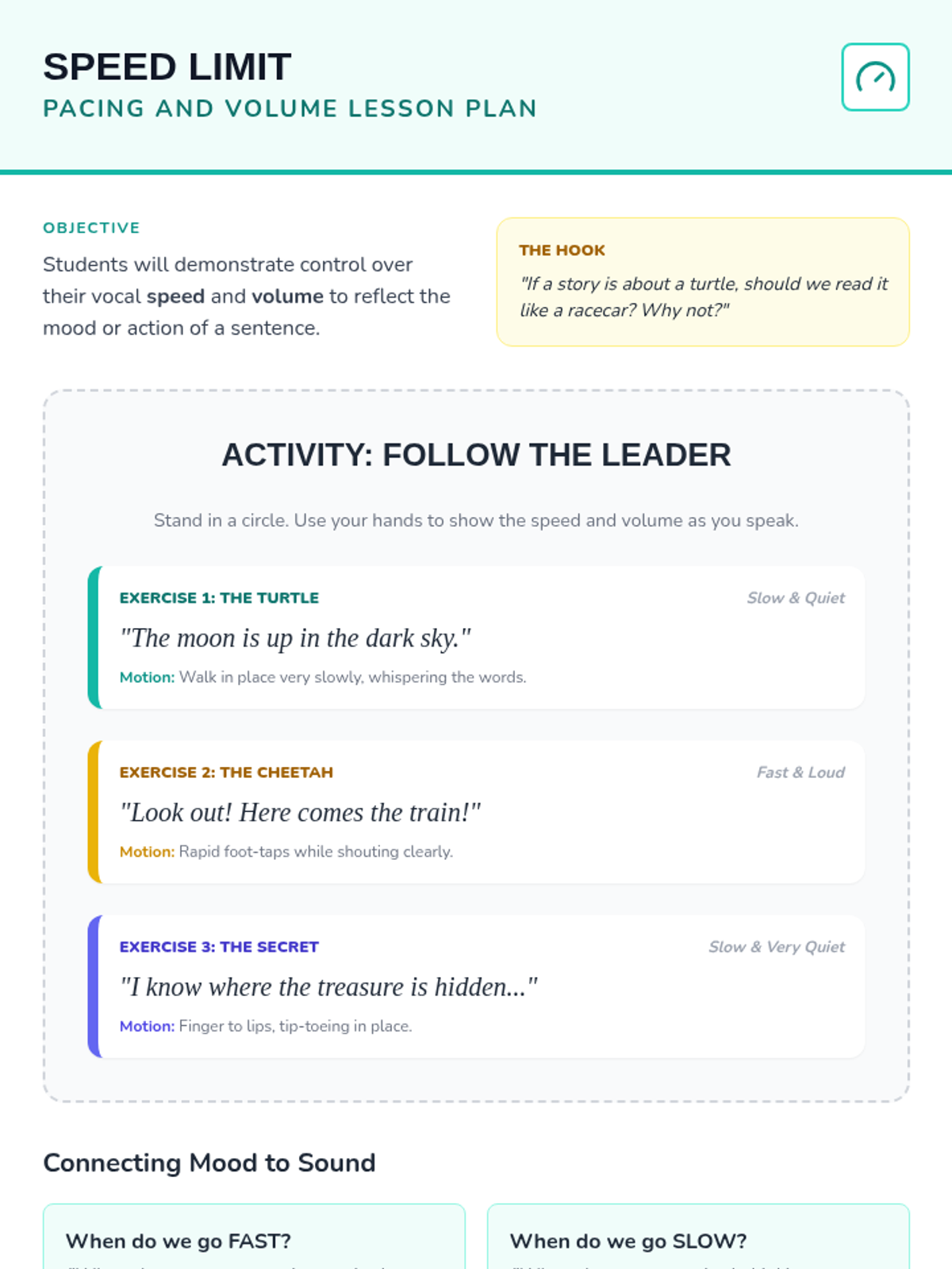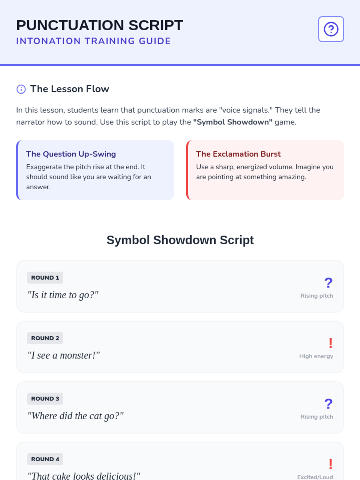 This Kindergarten ELA sequence focuses on developing oral fluency and prosody by exploring how voice modulation (pitch, volume, speed) conveys emotion and meaning in read-aloud literary texts. Students progress from identifying emotions in tone to practicing character voices and punctuation-based intonation, culminating in their own expressive reading performances.
