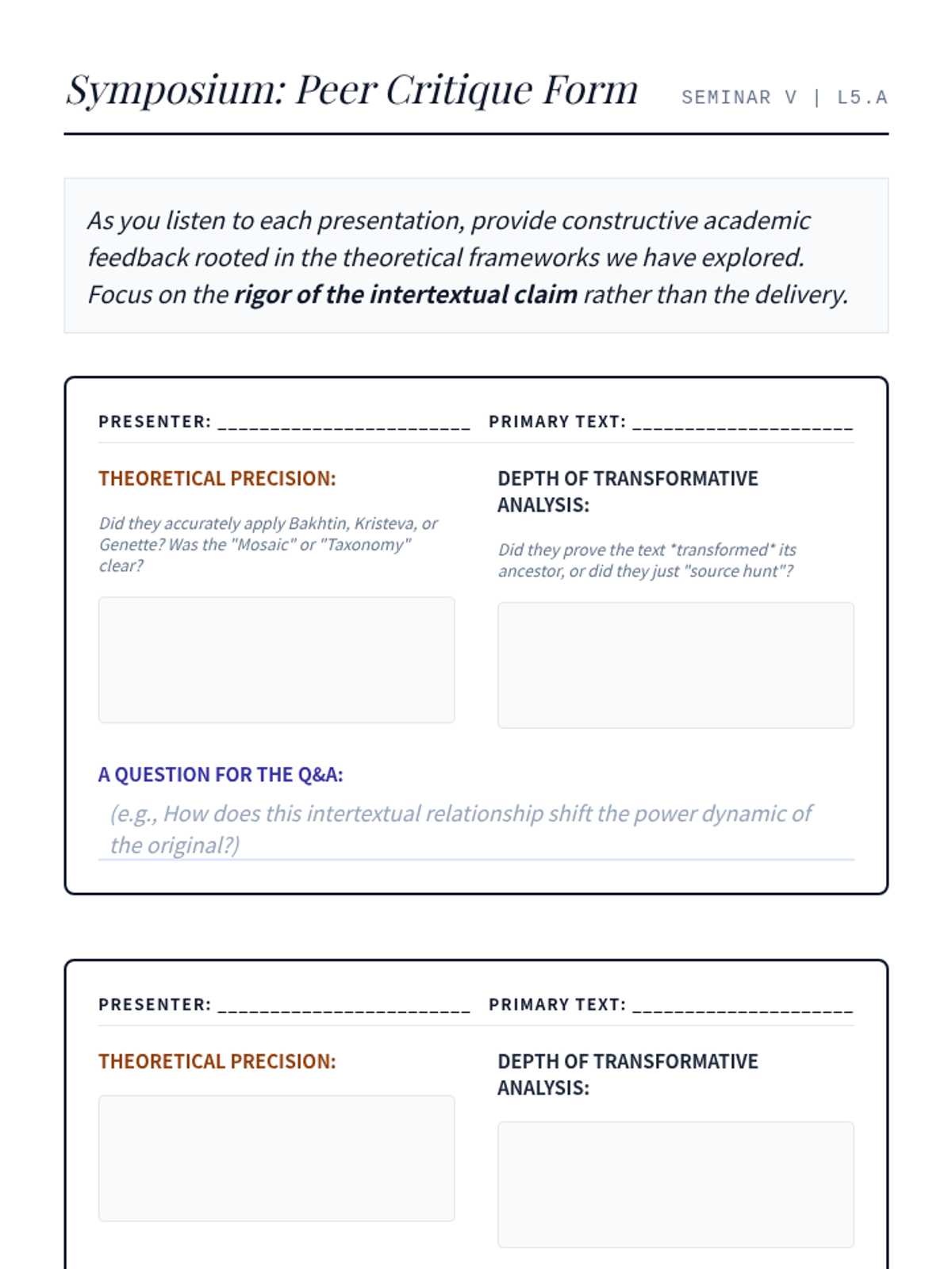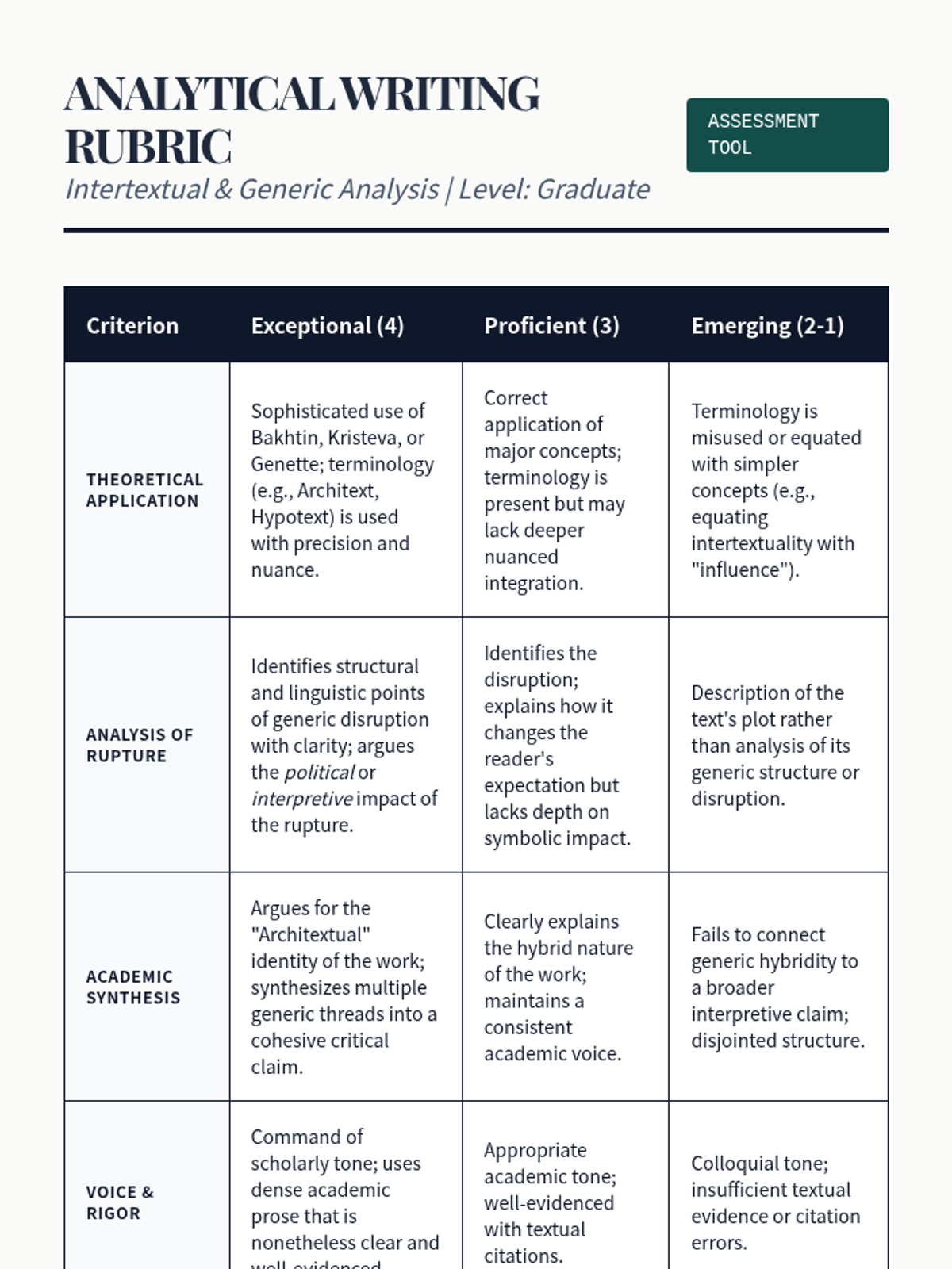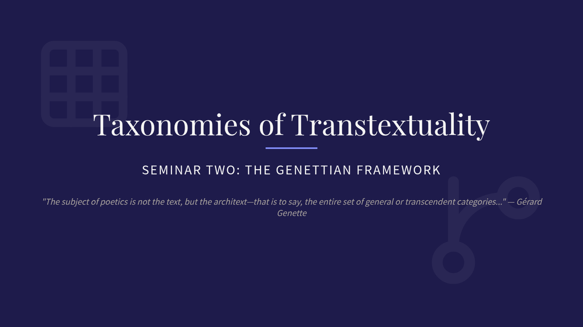 This graduate-level sequence explores the theoretical foundations of intertextuality, from Bakhtin and Kristeva to Genette and post-colonial responses. Students will analyze how texts dialogue with one another, dismantling the notion of the autonomous work through critical theory and comparative analysis.