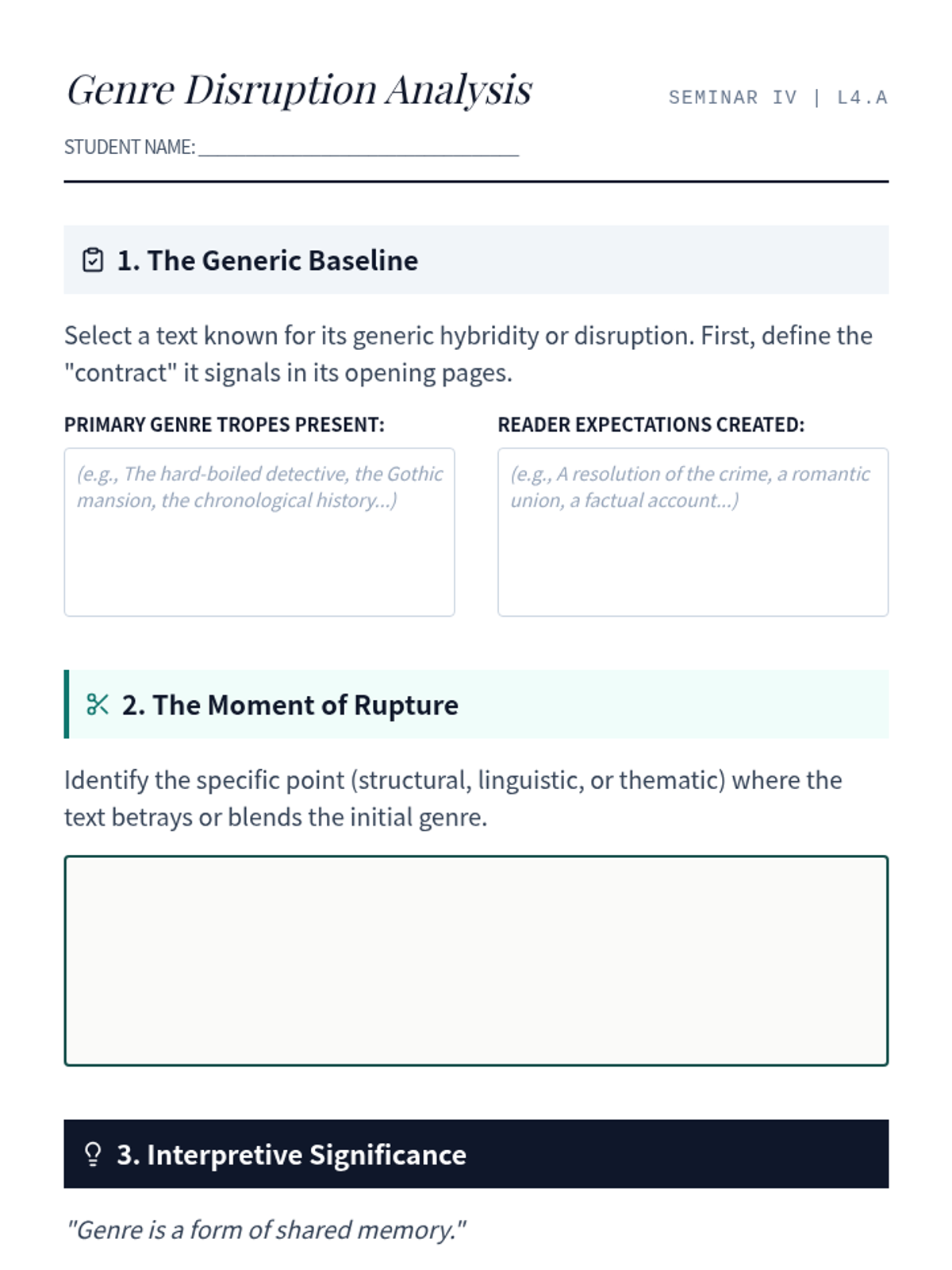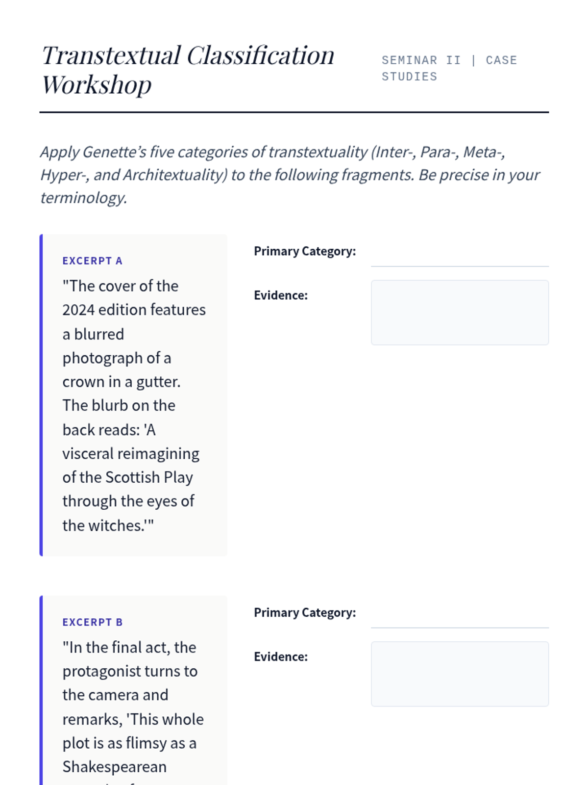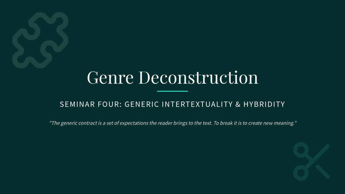 This graduate-level sequence explores the theoretical foundations of intertextuality, from Bakhtin and Kristeva to Genette and post-colonial responses. Students will analyze how texts dialogue with one another, dismantling the notion of the autonomous work through critical theory and comparative analysis.