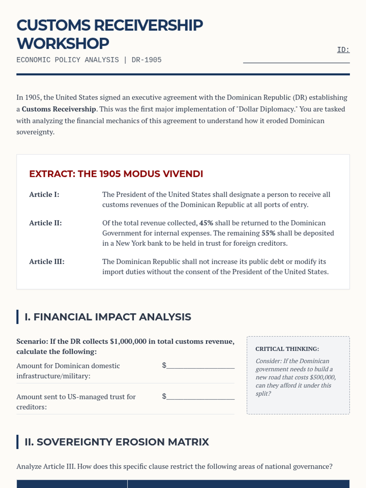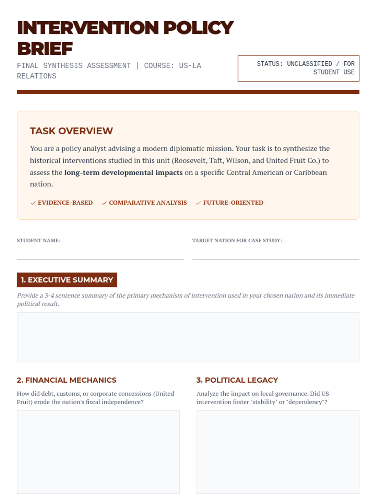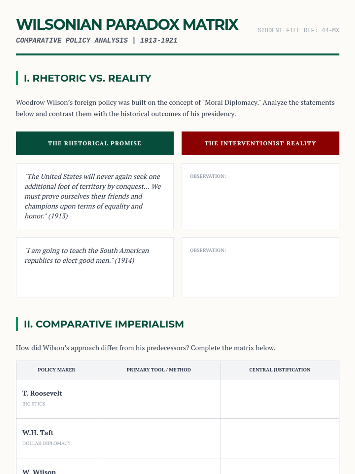 This sequence investigates the mechanisms of US hegemony in Latin America and the Caribbean, focusing on the transition from military conquest to economic stewardship. Students analyze the Roosevelt Corollary, Dollar Diplomacy, and Wilsonian Idealism through specific case studies in Panama, the Dominican Republic, and Mexico.