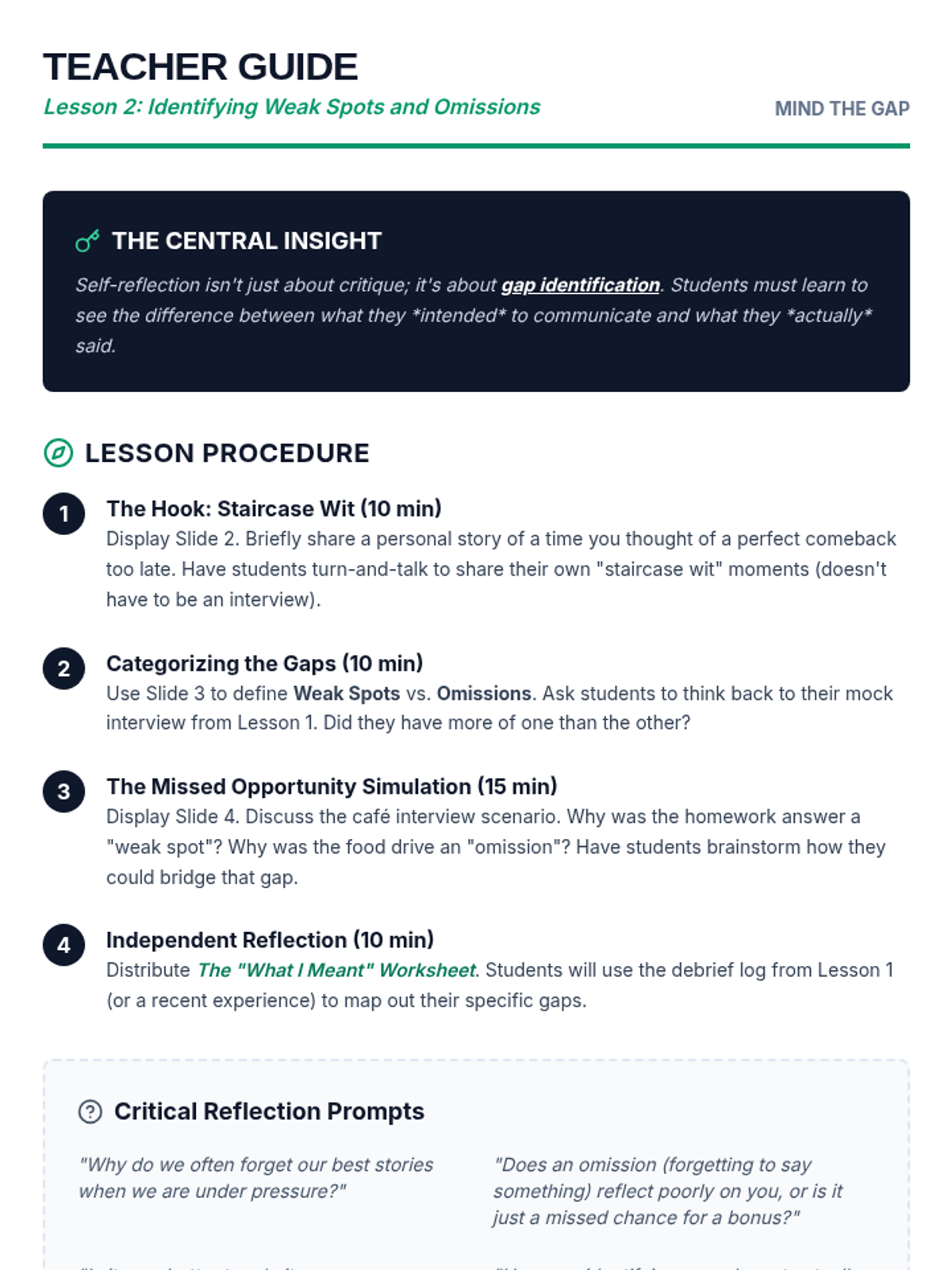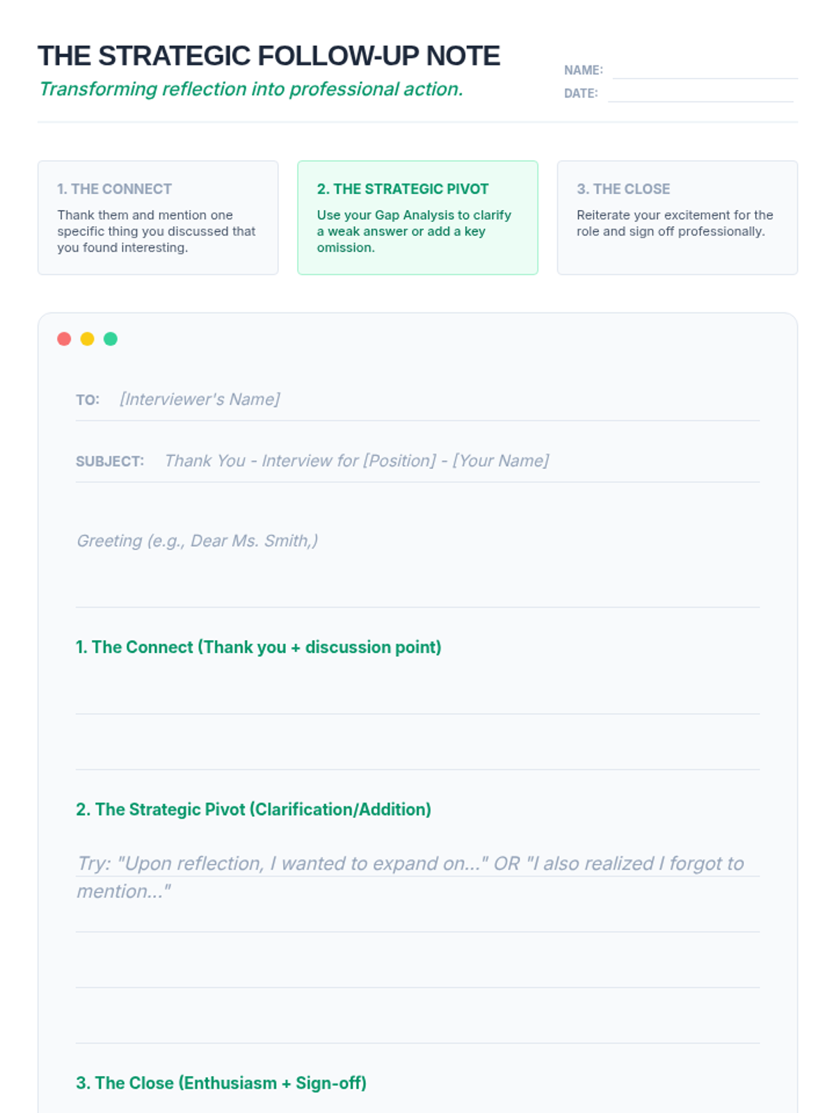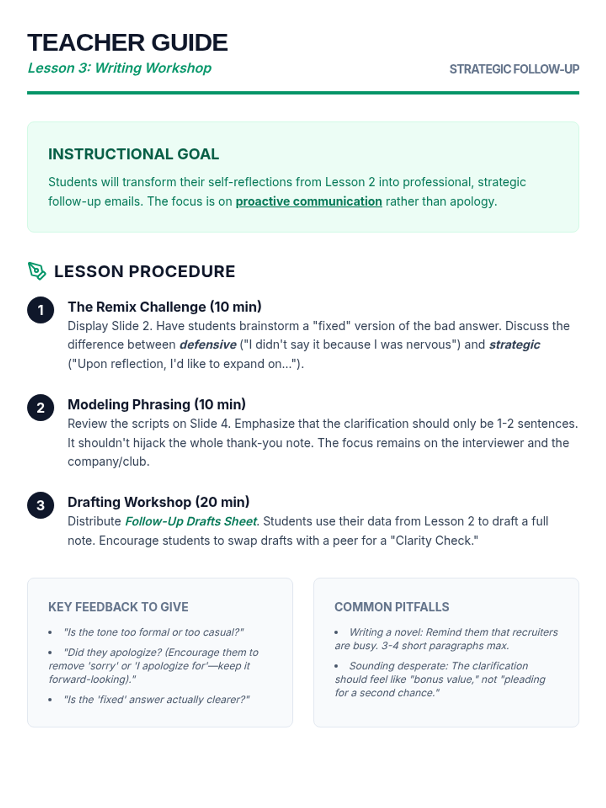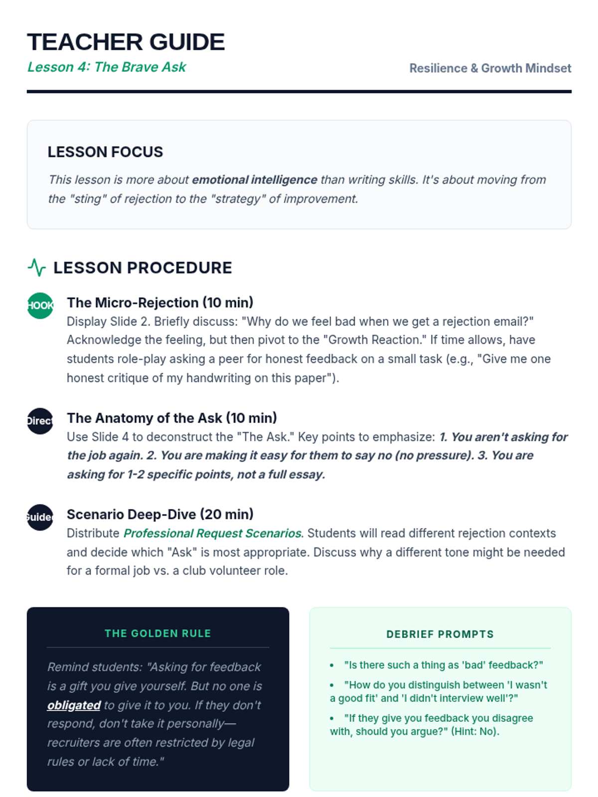 A 9th-grade sequence focused on the post-interview process, teaching students how to self-reflect, clarify communication, and professionally request and integrate feedback. Students develop a growth mindset by treating every interview as a learning opportunity.