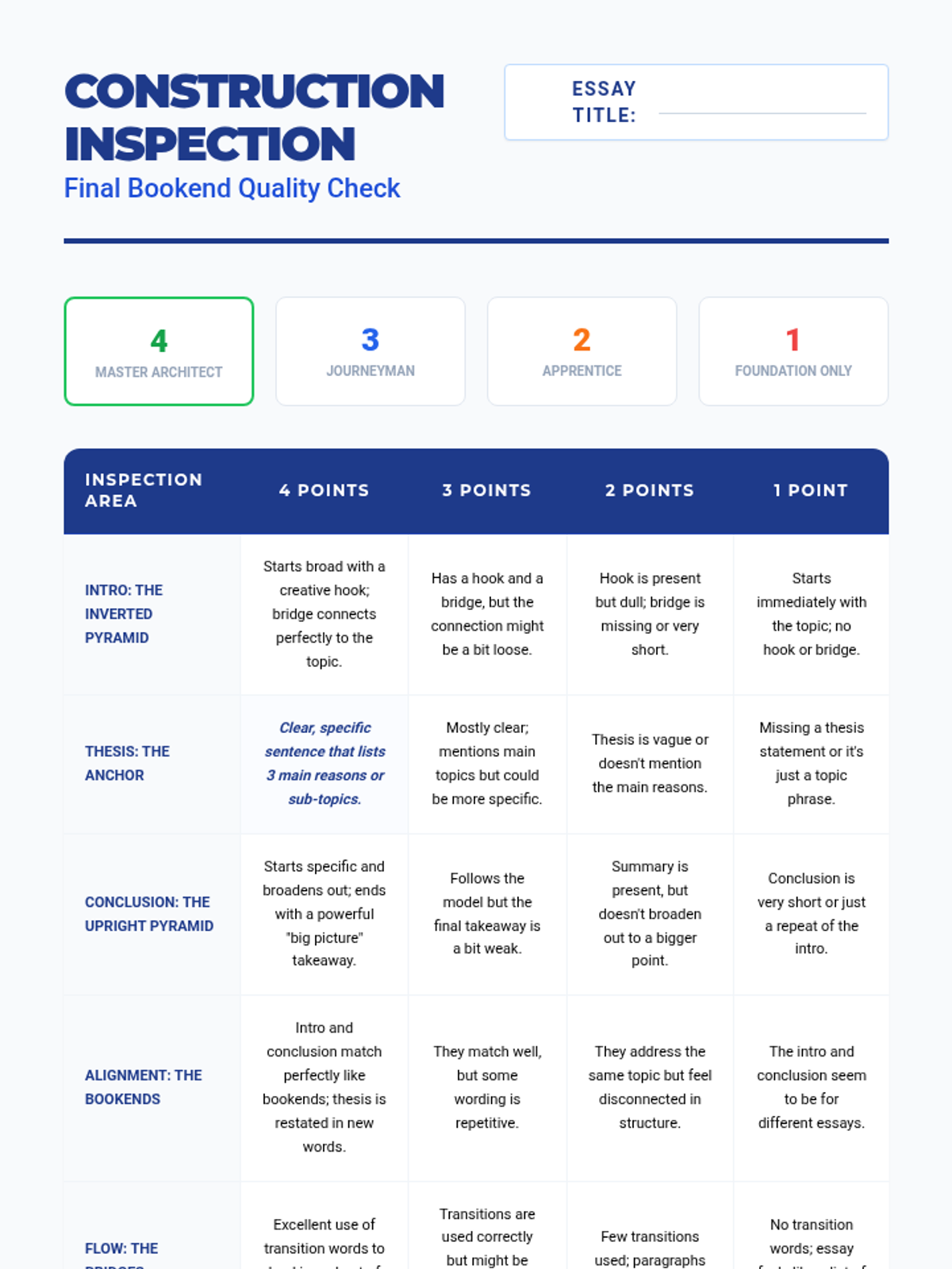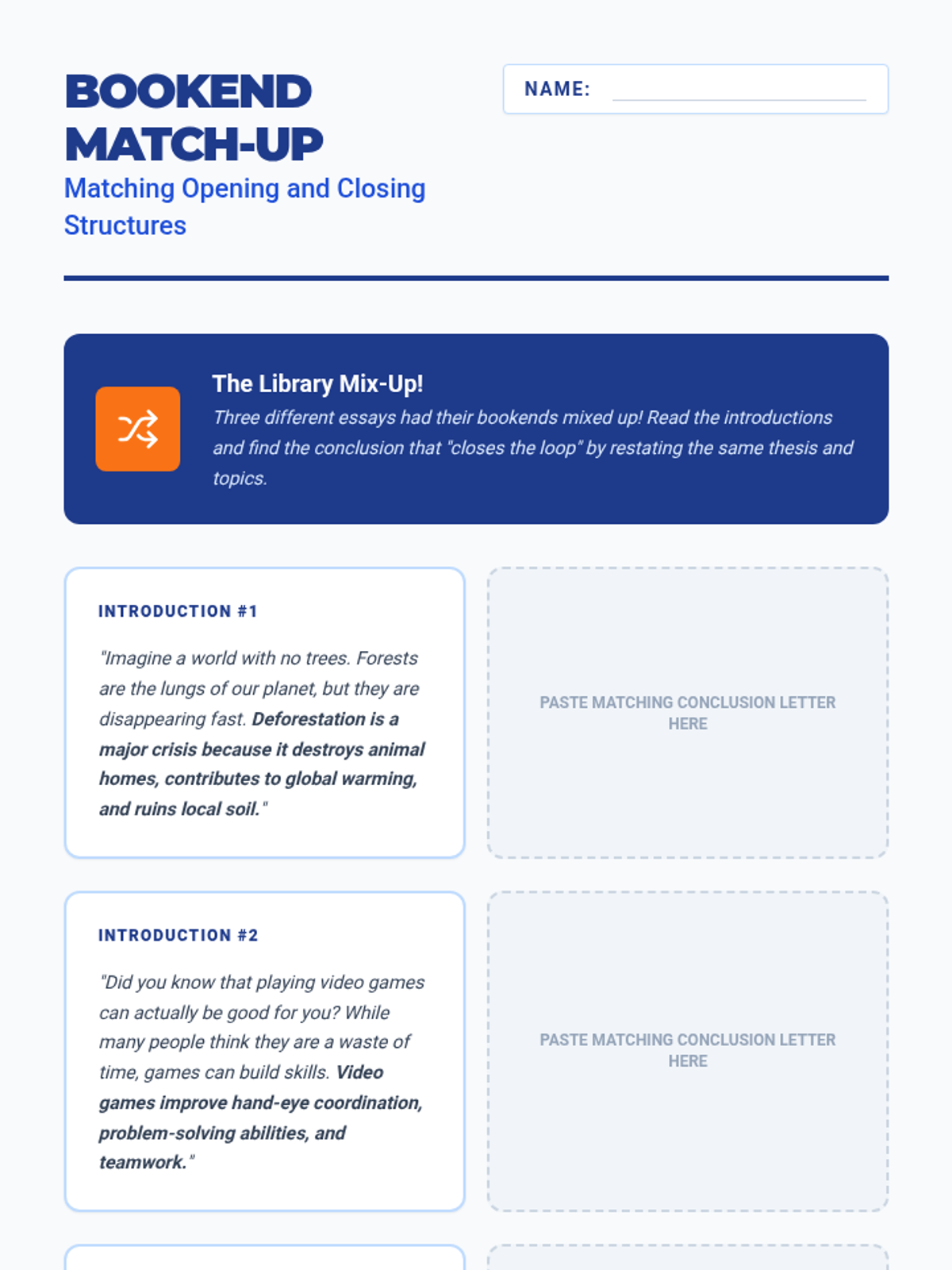 A comprehensive writing workshop sequence focused on the structural mechanics of essay 'bookends'. Students master the inverted pyramid for introductions and the upright pyramid for conclusions, ensuring their essays are effectively framed and cohesive.