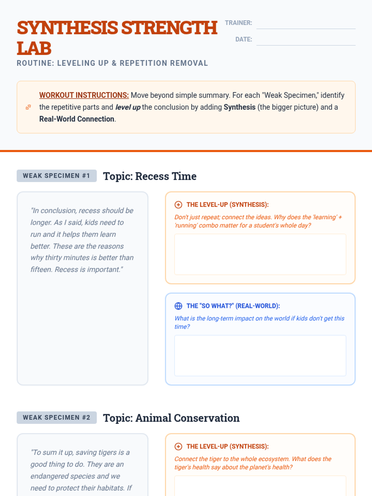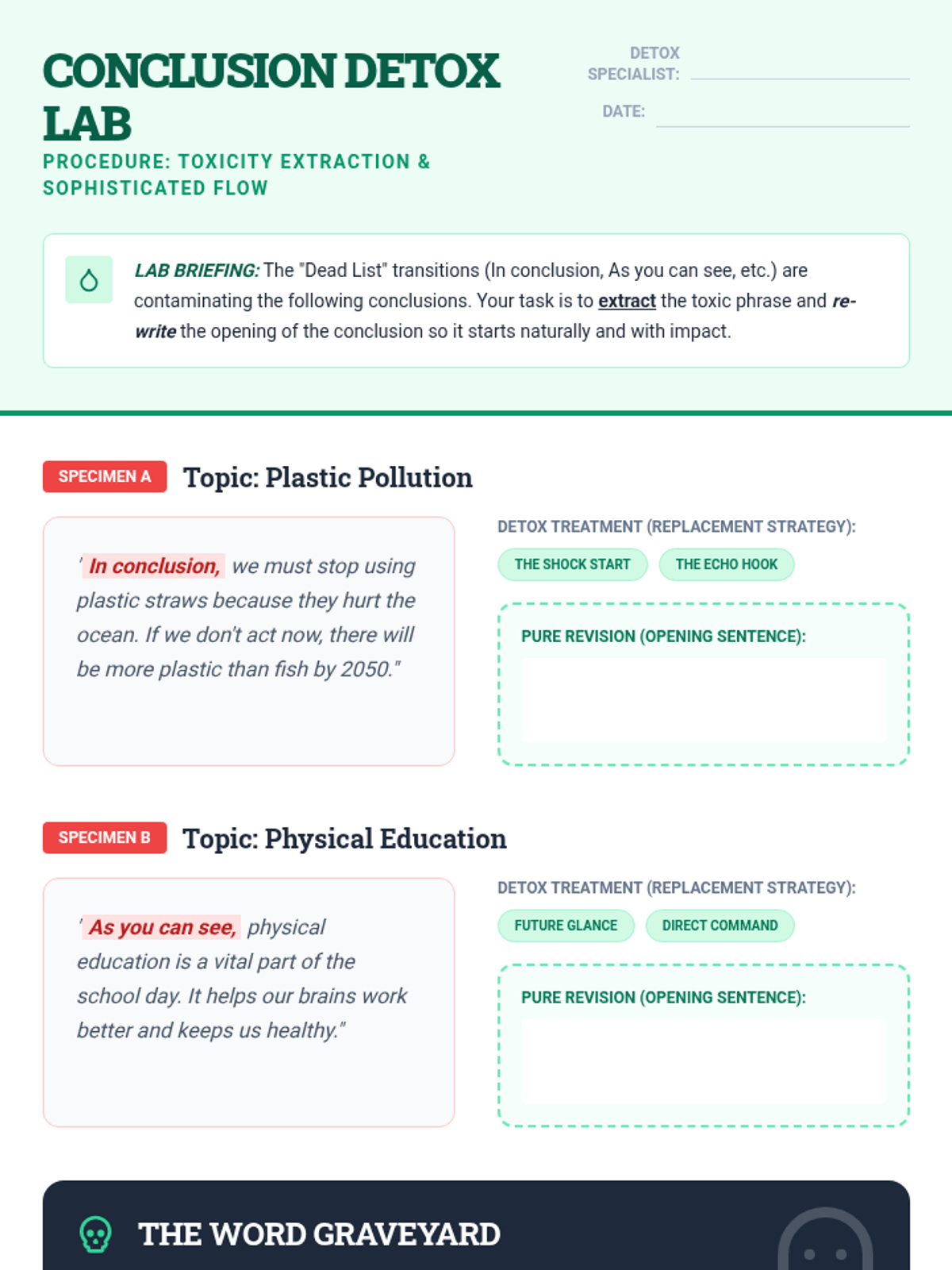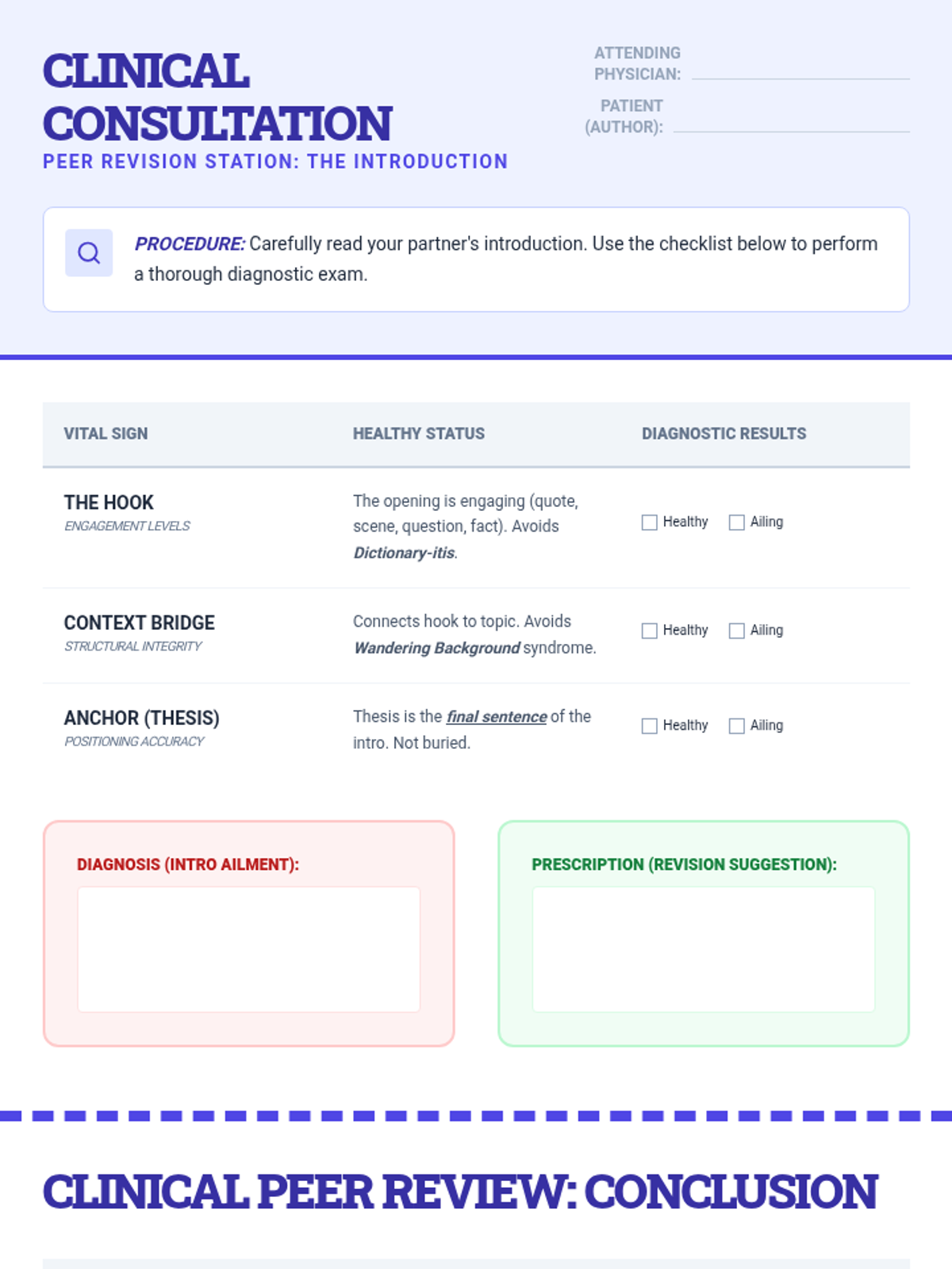 Students act as writing clinicians to diagnose and treat common ailments in essay introductions and conclusions, moving from identification of weak writing to active revision.