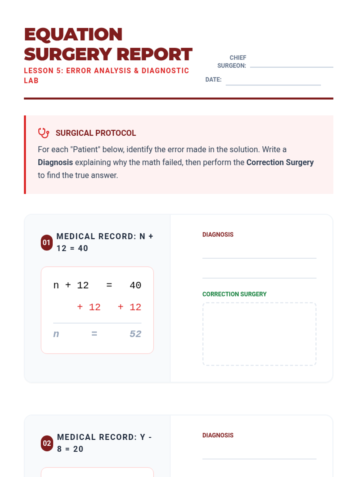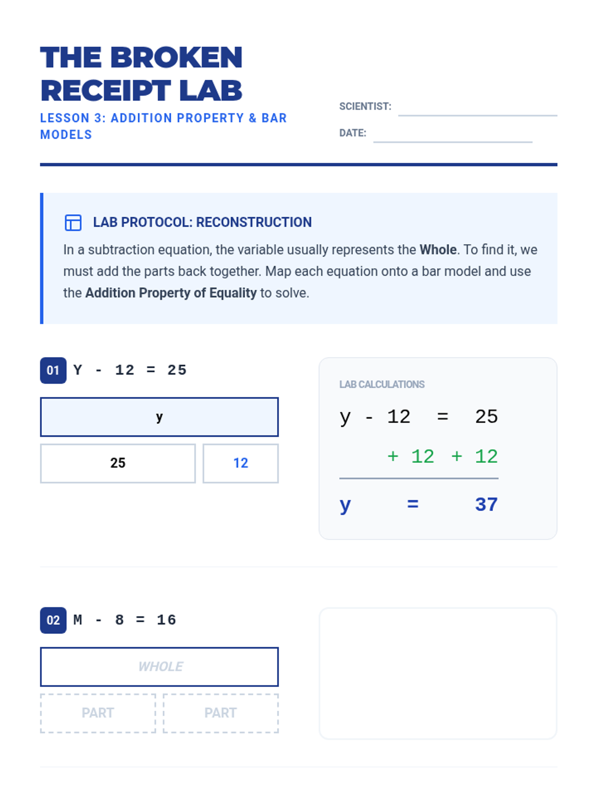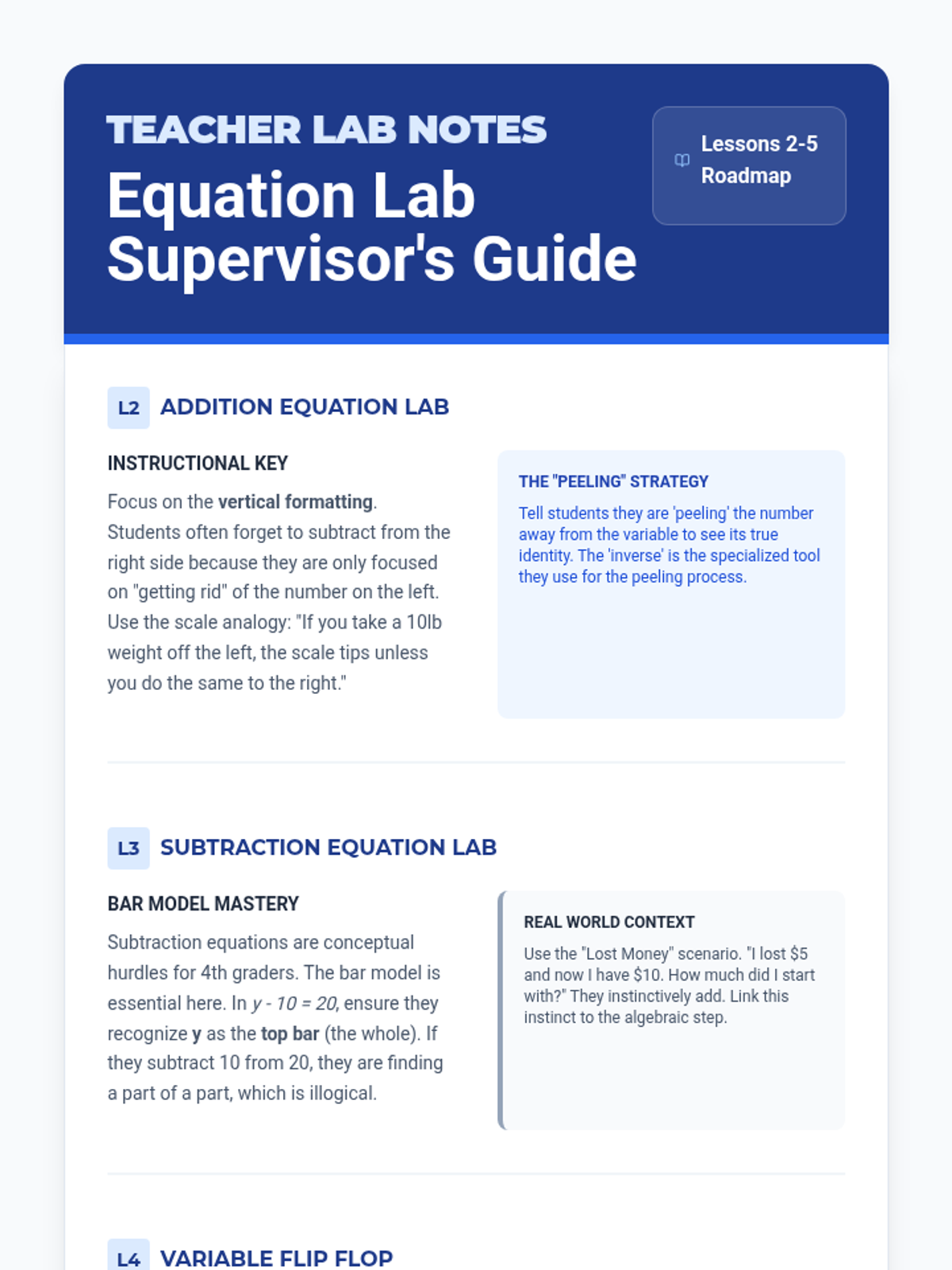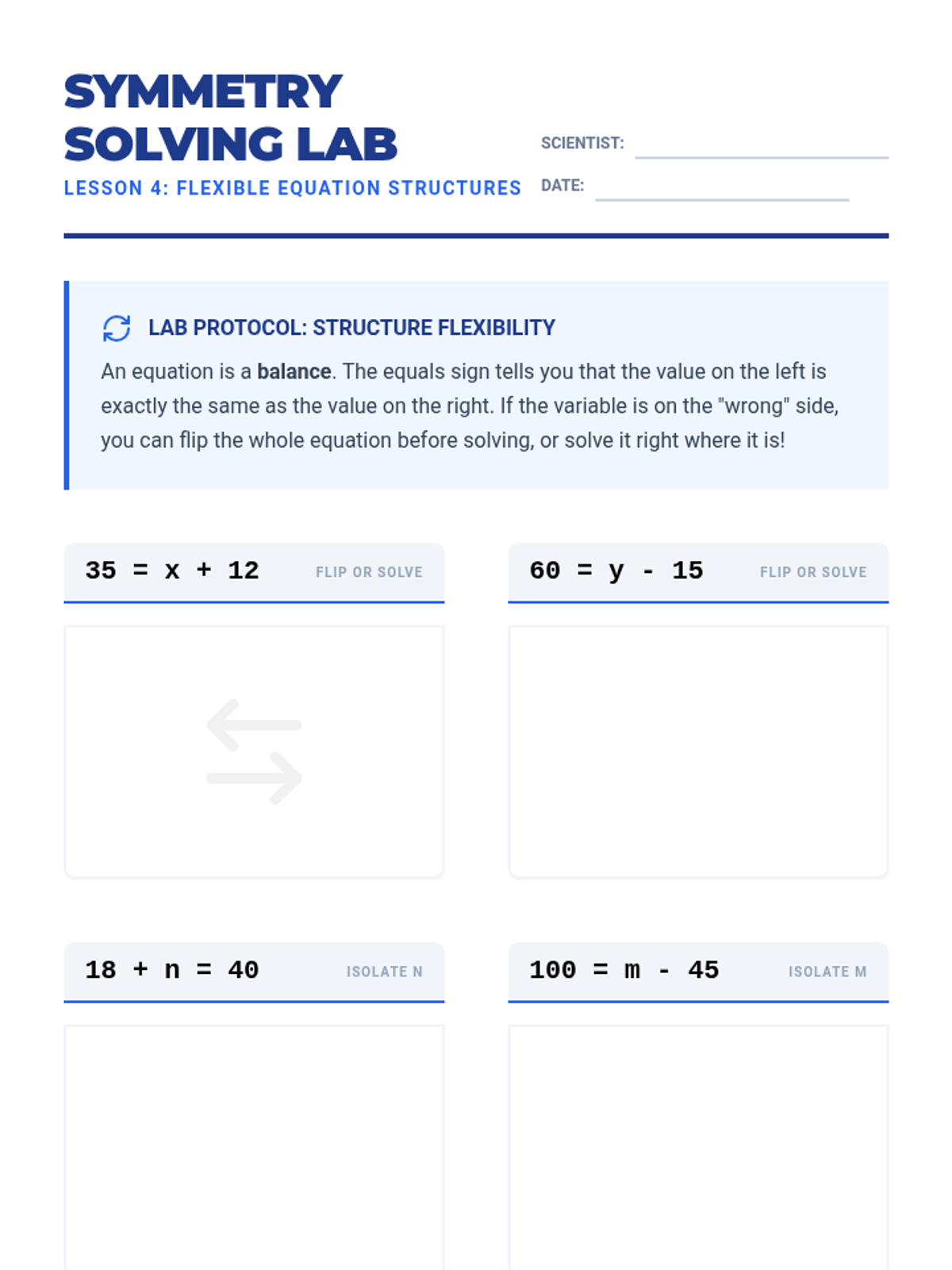 A workshop-style sequence for 4th graders focusing on solving one-step addition and subtraction equations using inverse operations and algebraic formatting.