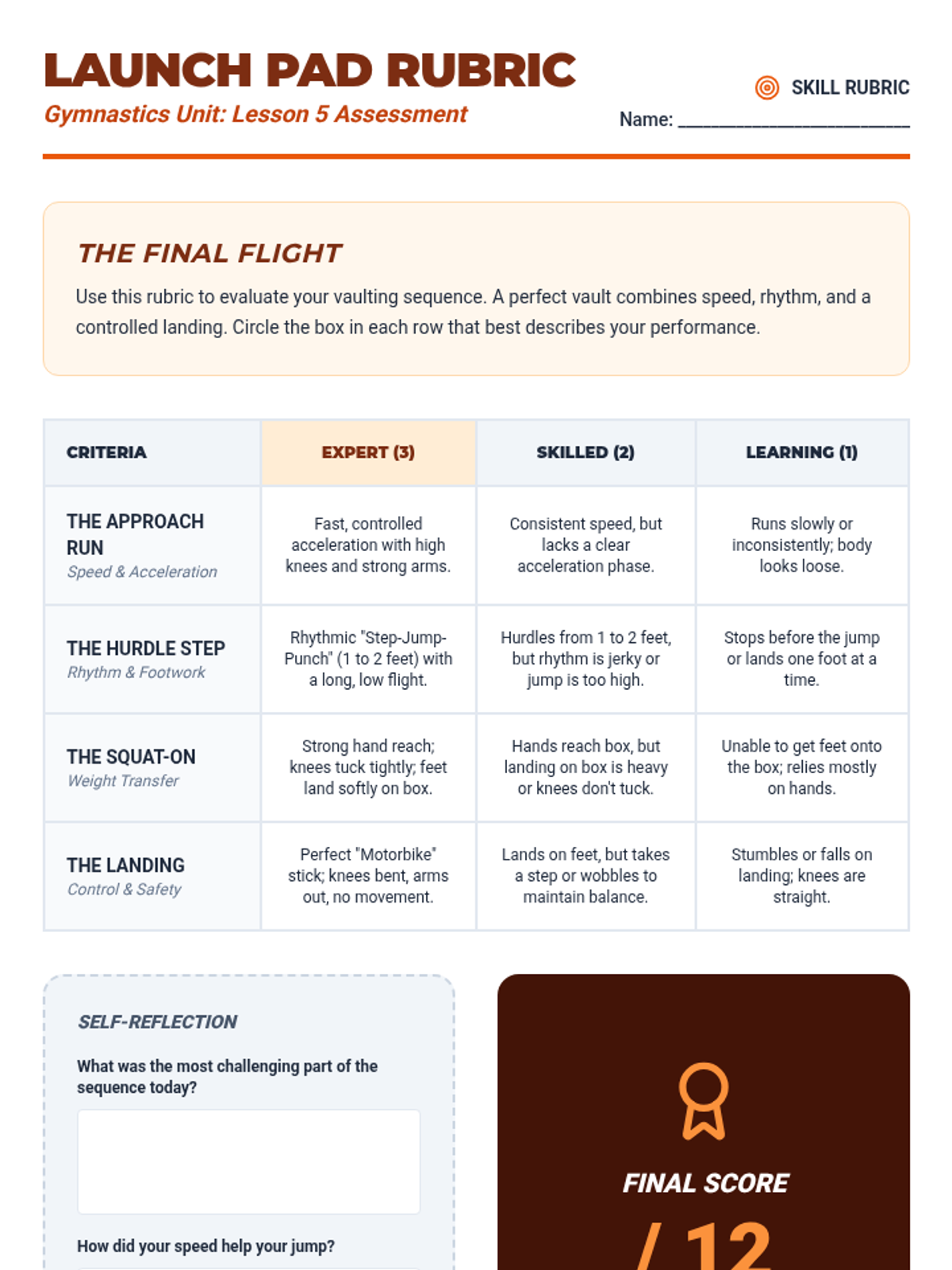 A comprehensive 5th Grade physical education unit focused on the mechanics, safety, and competition of horizontal jumping events. Students progress from safe landing techniques to the complex coordination of the long jump and triple jump, concluding with a student-led competition.