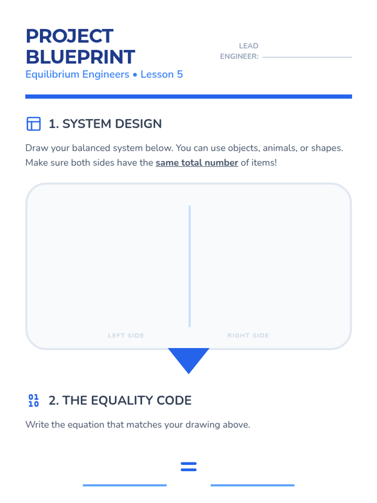 A foundational sequence for 2nd-grade students exploring the concepts of equality, equilibrium, and balancing equations using physical scales and numerical equivalents. Students progress from physical balance to symbolic representation using the equal sign.
