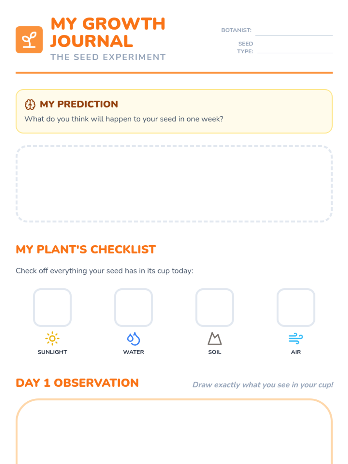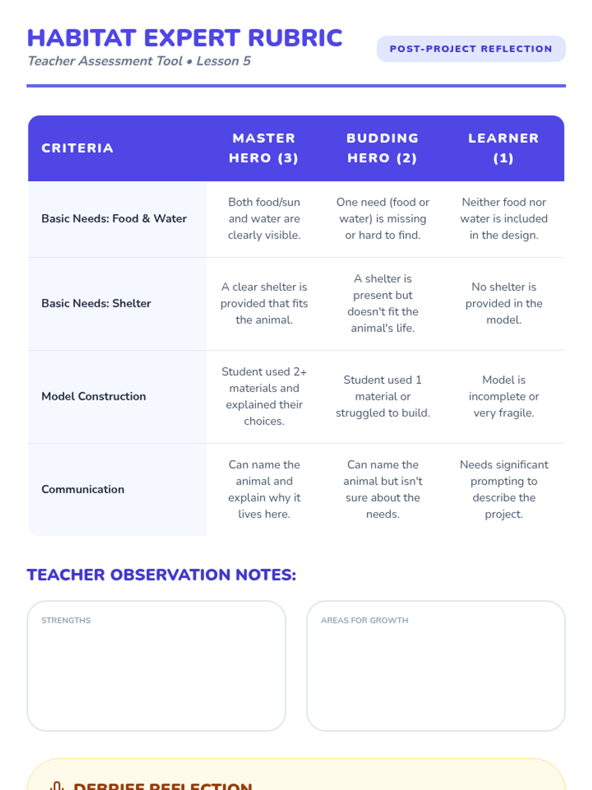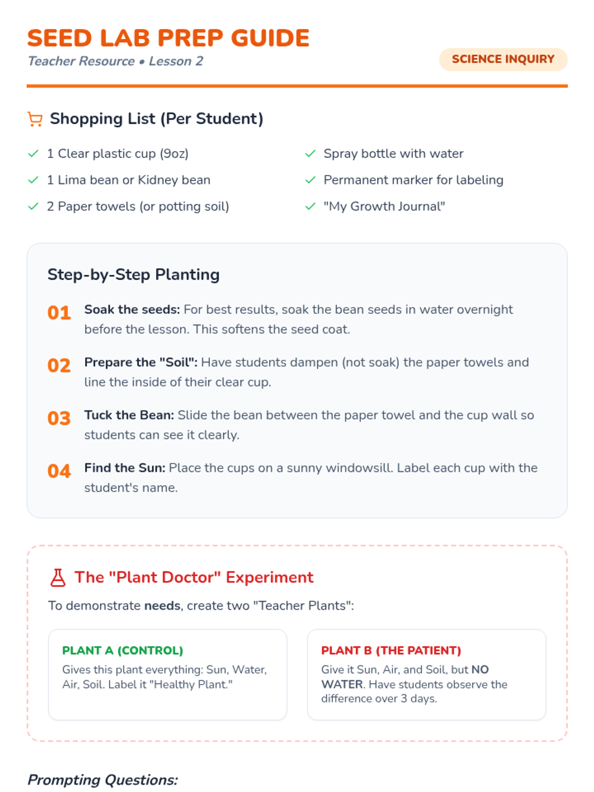 A Kindergarten science sequence exploring the basic survival needs of plants and animals through hands-on planting, animal observation, and a habitat design challenge. Students learn to distinguish between needs and wants while discovering how different organisms obtain energy and find shelter.