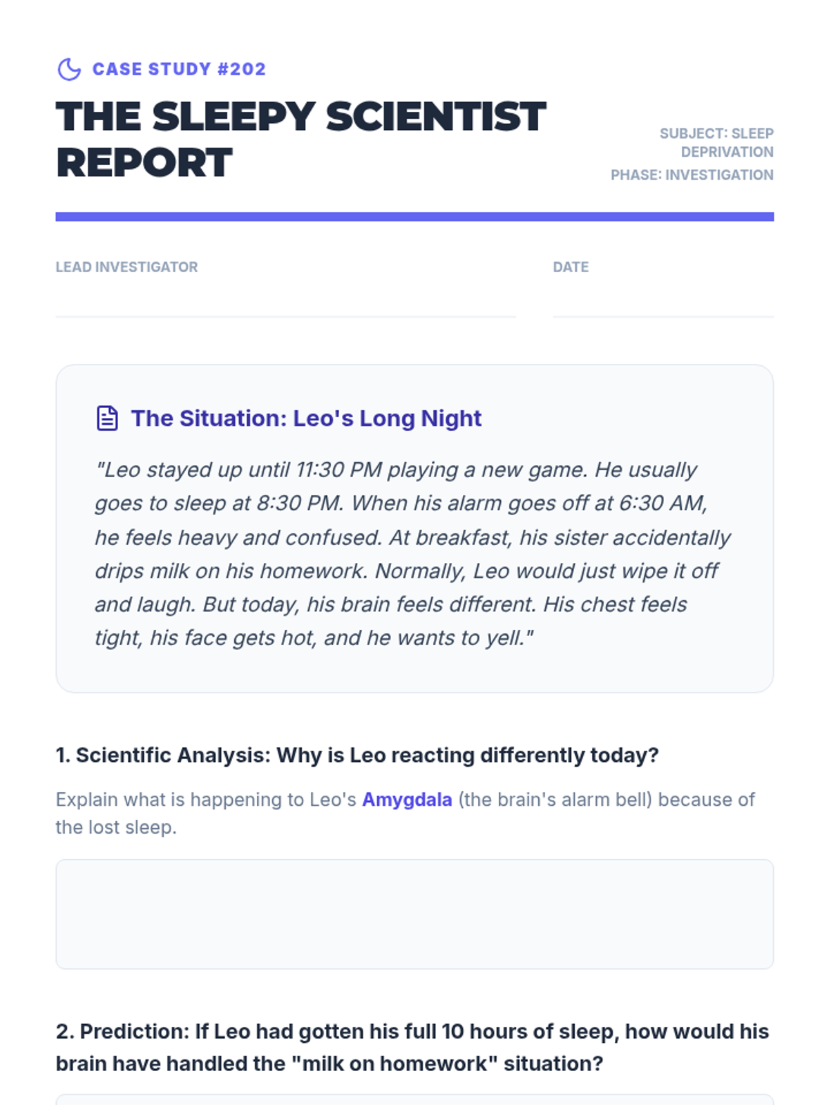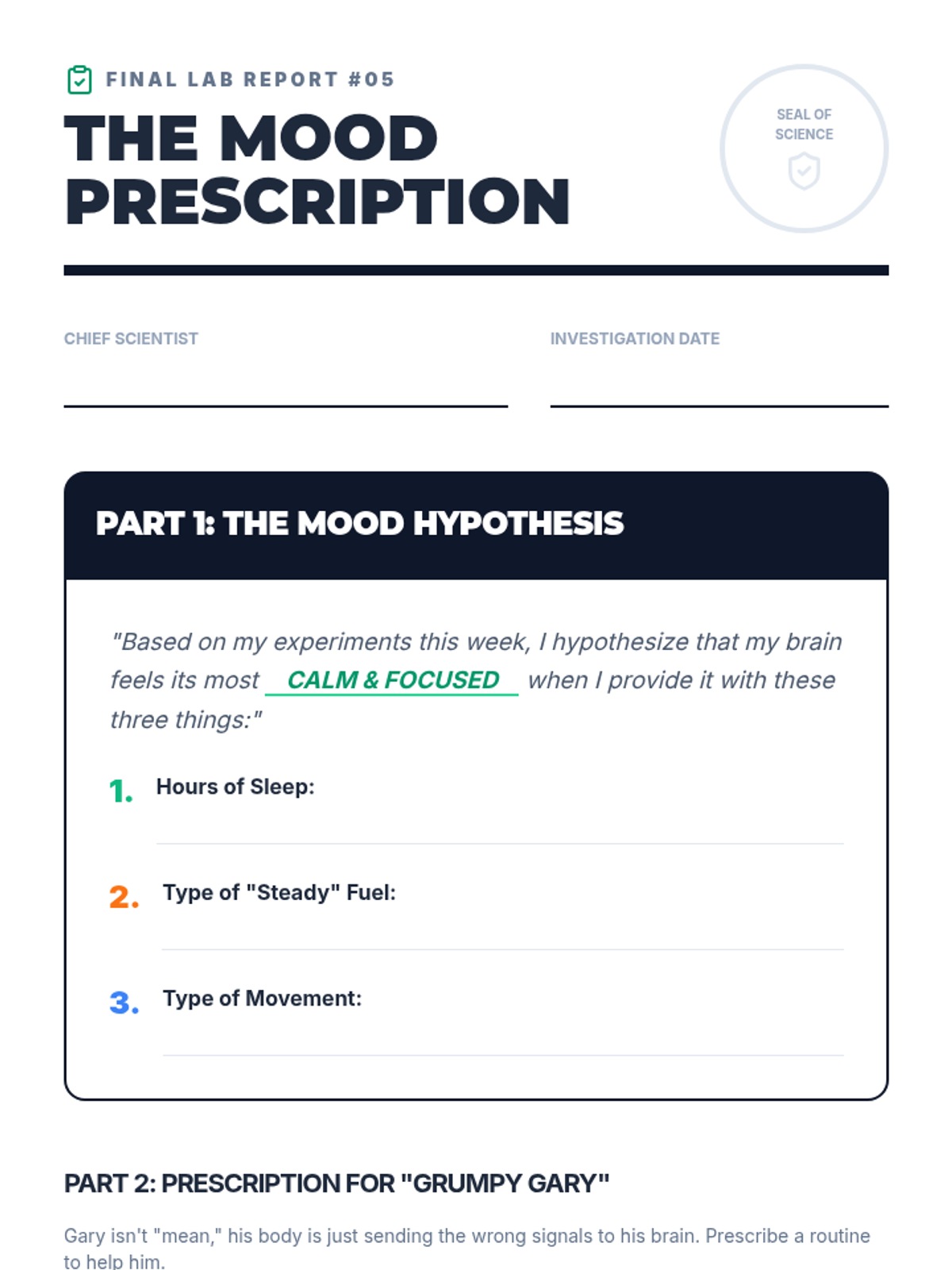 A 4th-grade inquiry-based unit where students act as scientists to investigate how sleep, nutrition, and movement directly influence their brain's emotional output and focus.