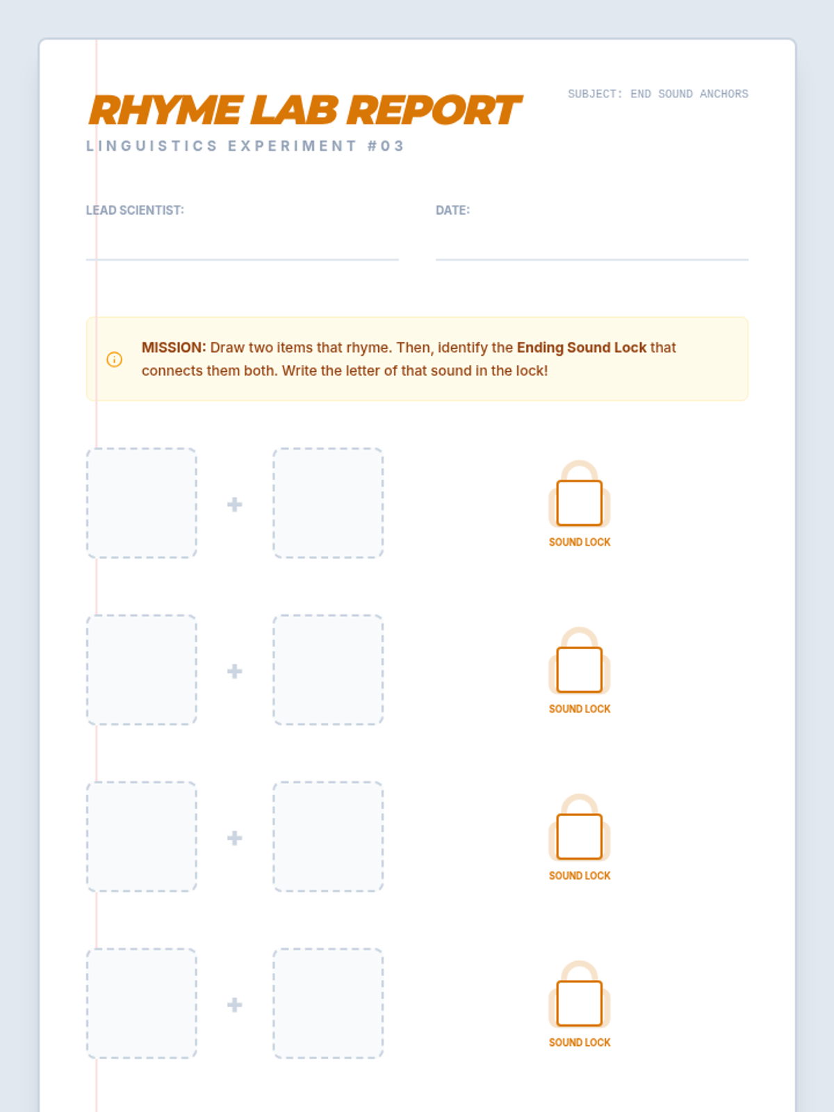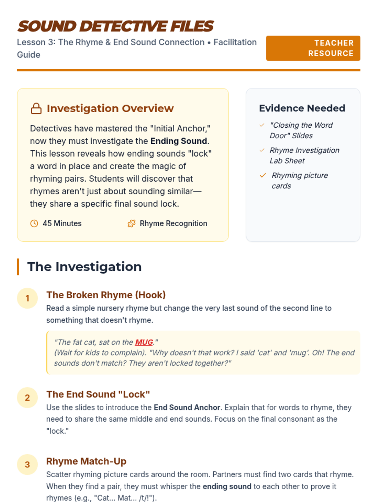 An inquiry-based phonics sequence where 1st graders act as sound detectives. They explore beginning and ending sounds in picture books, classroom objects, and rhymes, culminating in a Classroom Sound Museum.