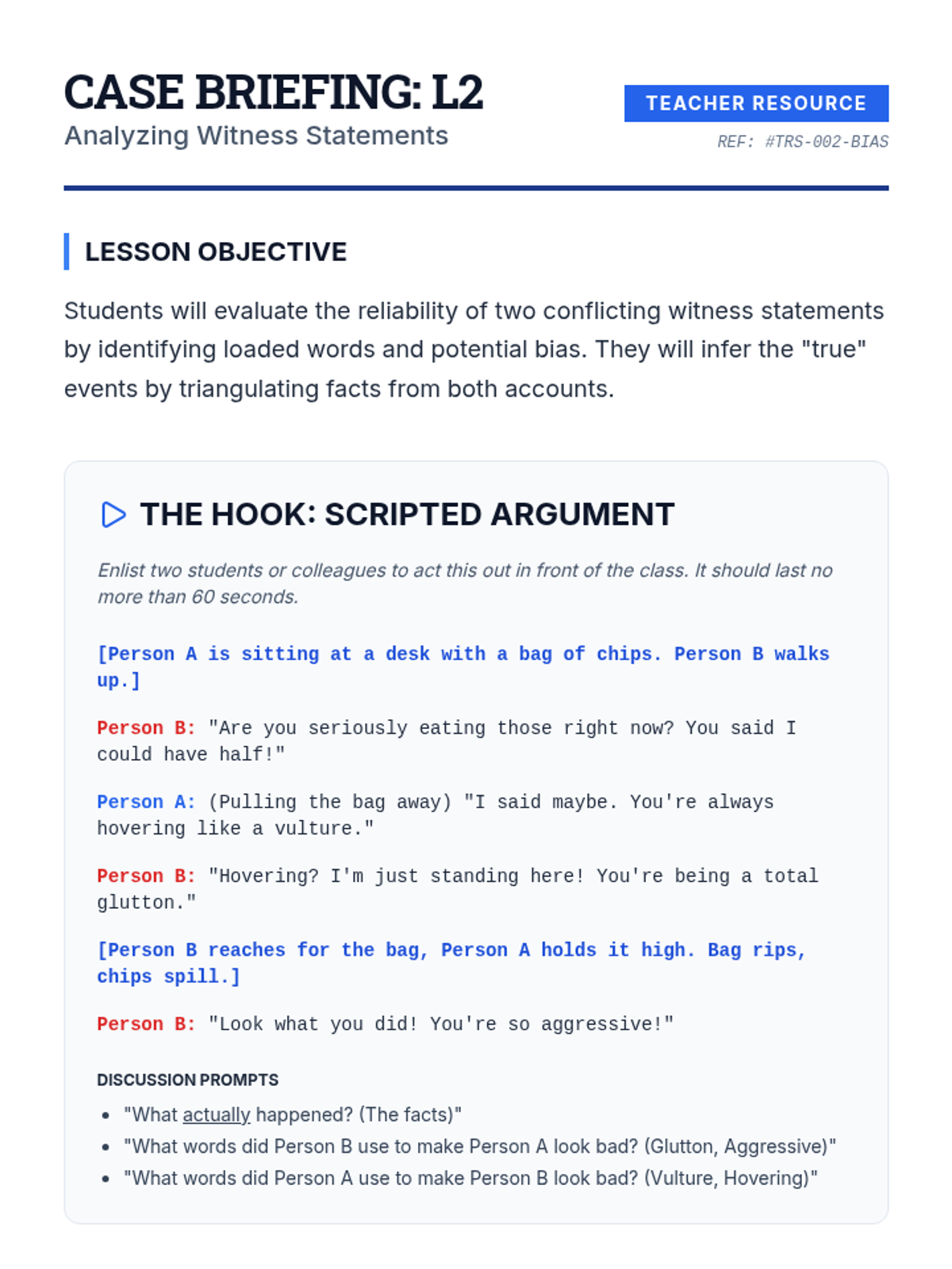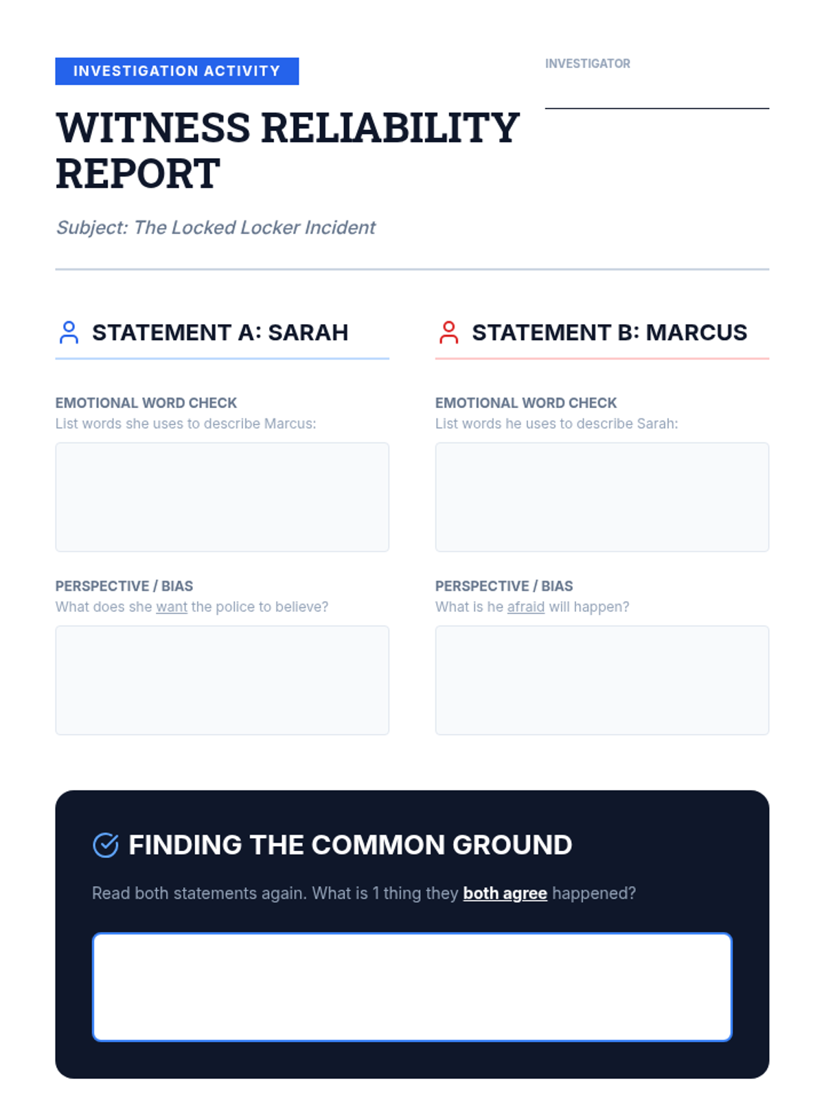 This 9th-grade Special Education sequence uses a 'detective' theme to teach inference and prediction. Students move from concrete observations of a 'crime scene' to analyzing witness bias, synthesizing multiple data points, and constructing evidence-based arguments (CER) to solve a fictional mystery.