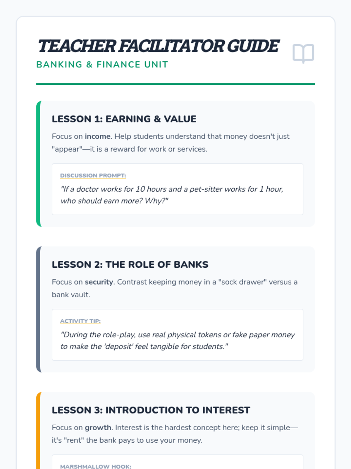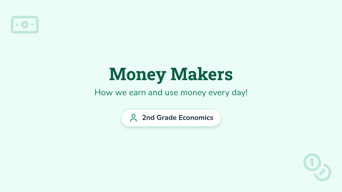 A 5-lesson sequence for 2nd-grade students exploring the basics of earning, banking, interest, and setting personal savings goals. Students transition from physical currency to understanding financial institutions and long-term planning.