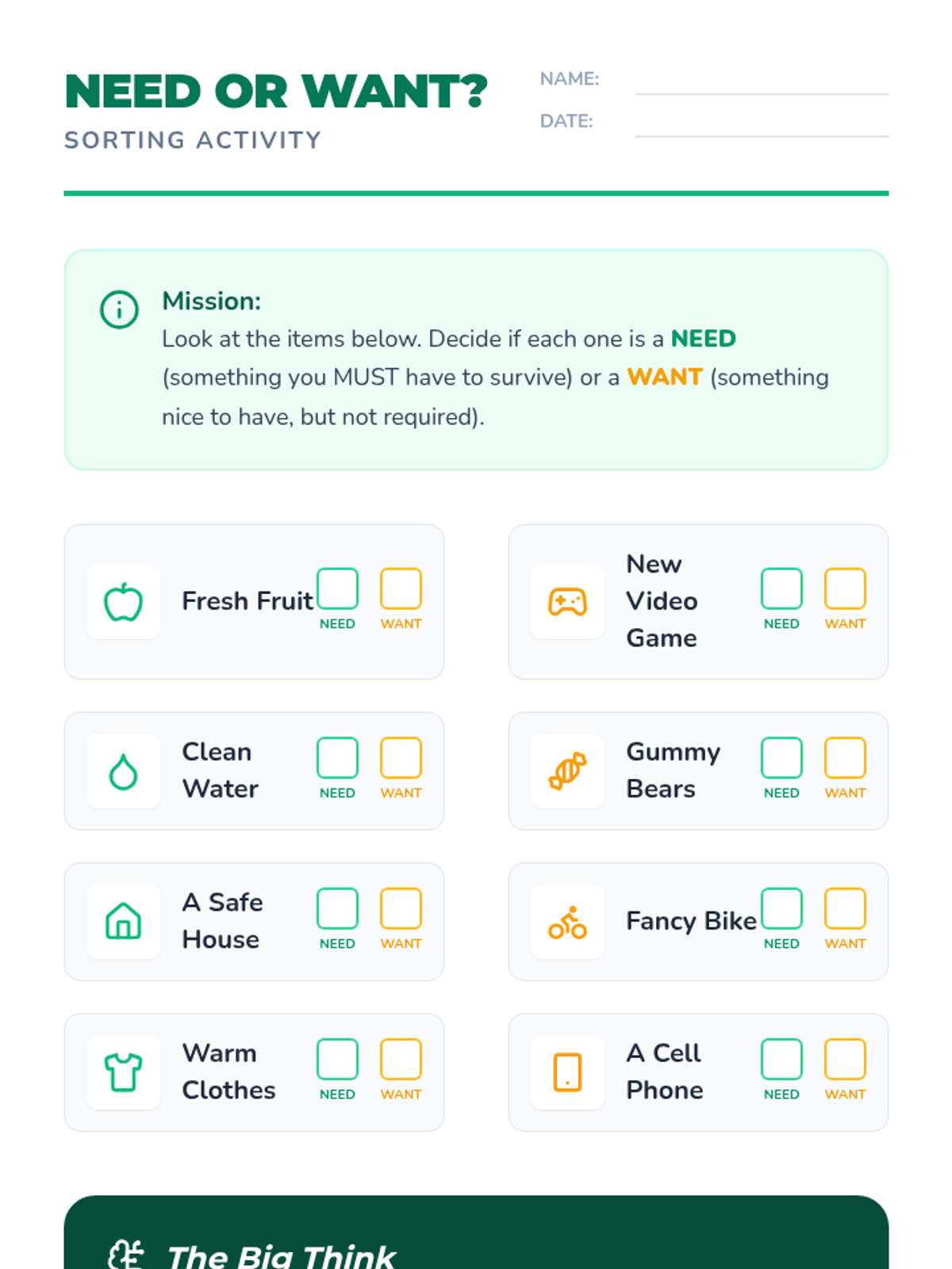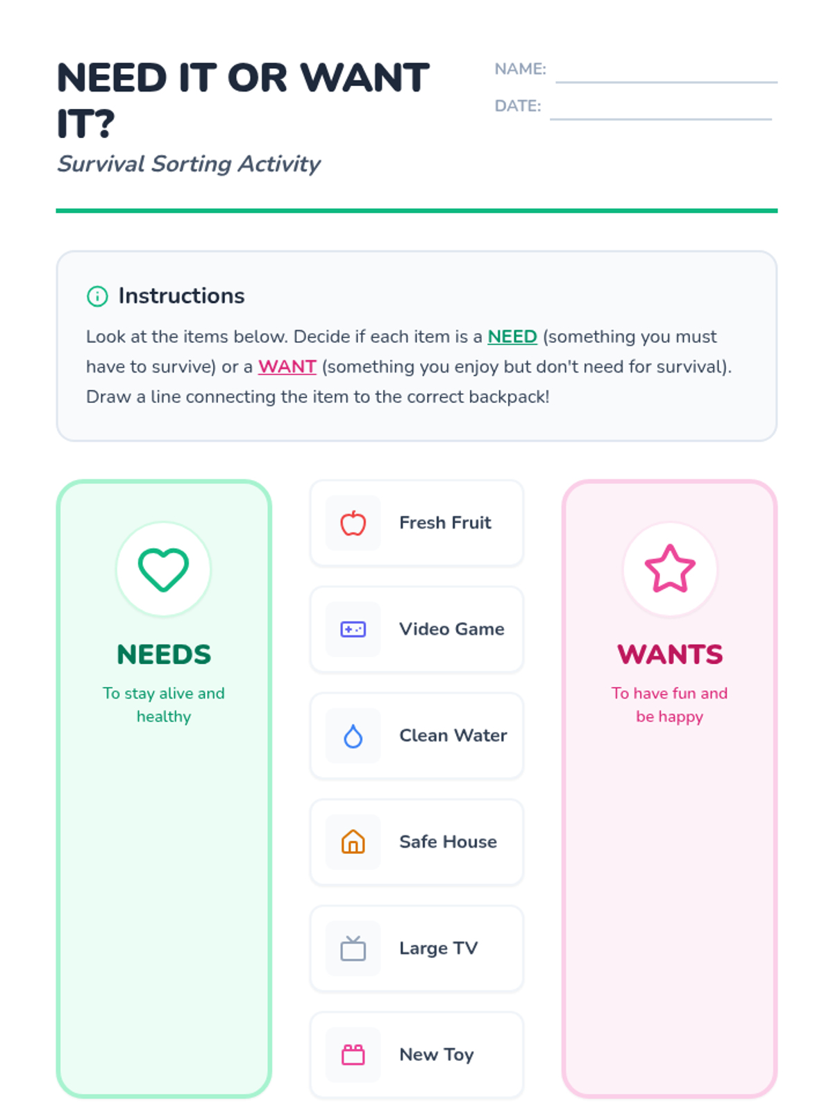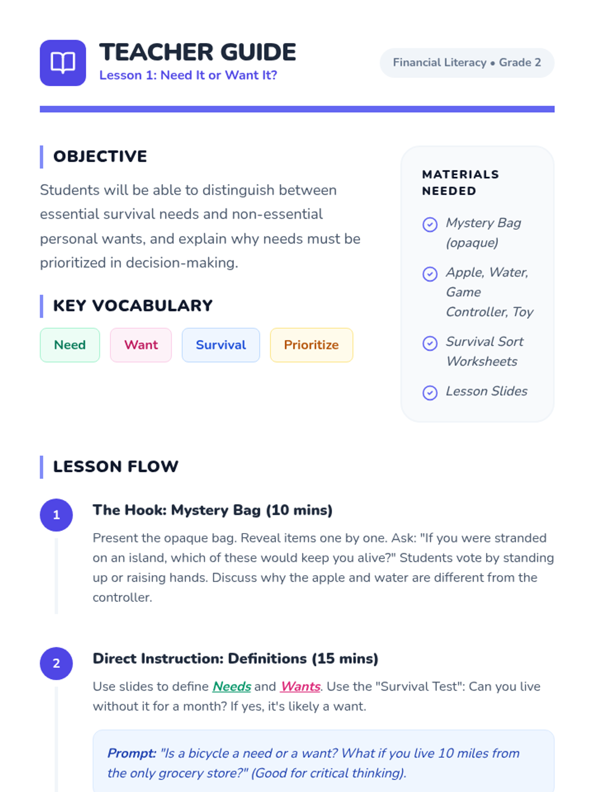 An introductory sequence for 2nd-grade students on economic concepts, focusing on the difference between needs and wants, the reality of scarcity, and the concept of opportunity cost through hands-on simulations and creative projects.