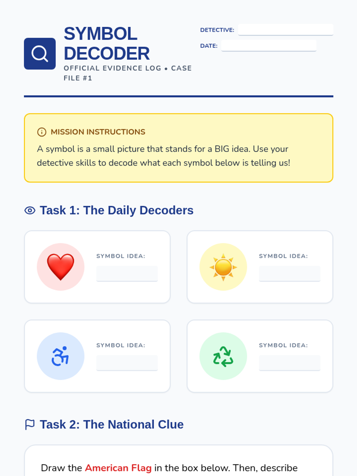 An inquiry-based journey for 2nd graders to investigate the meanings behind America's famous symbols and landmarks through a detective-themed lens.