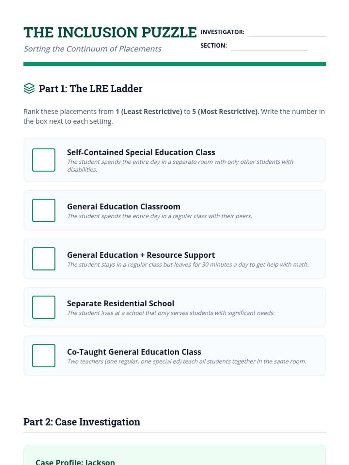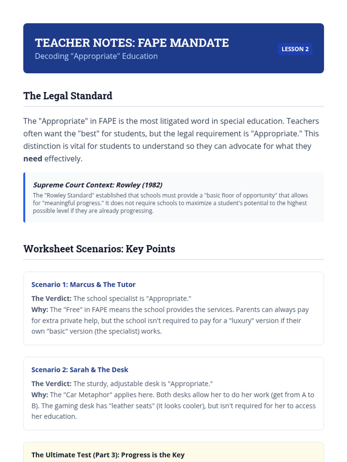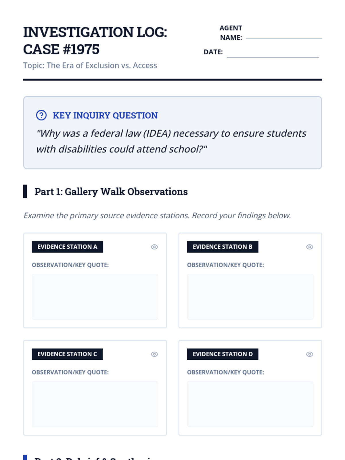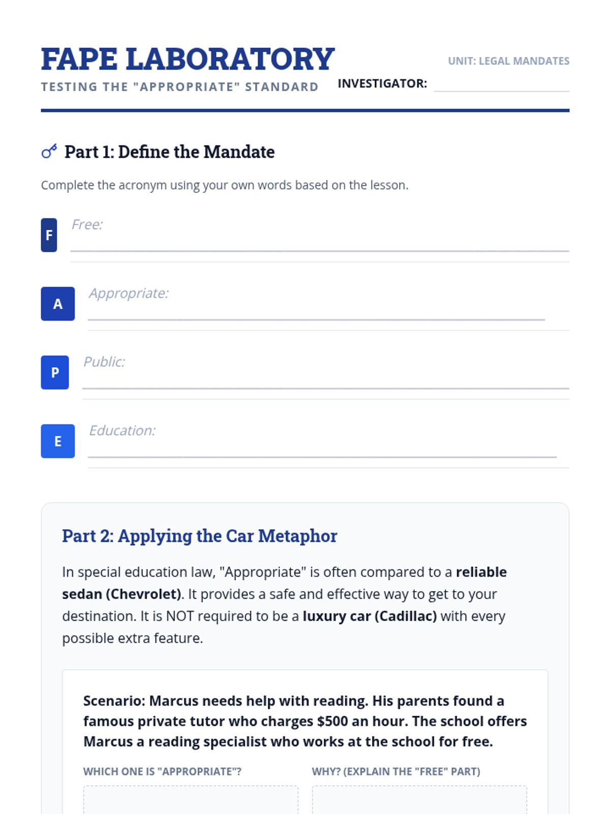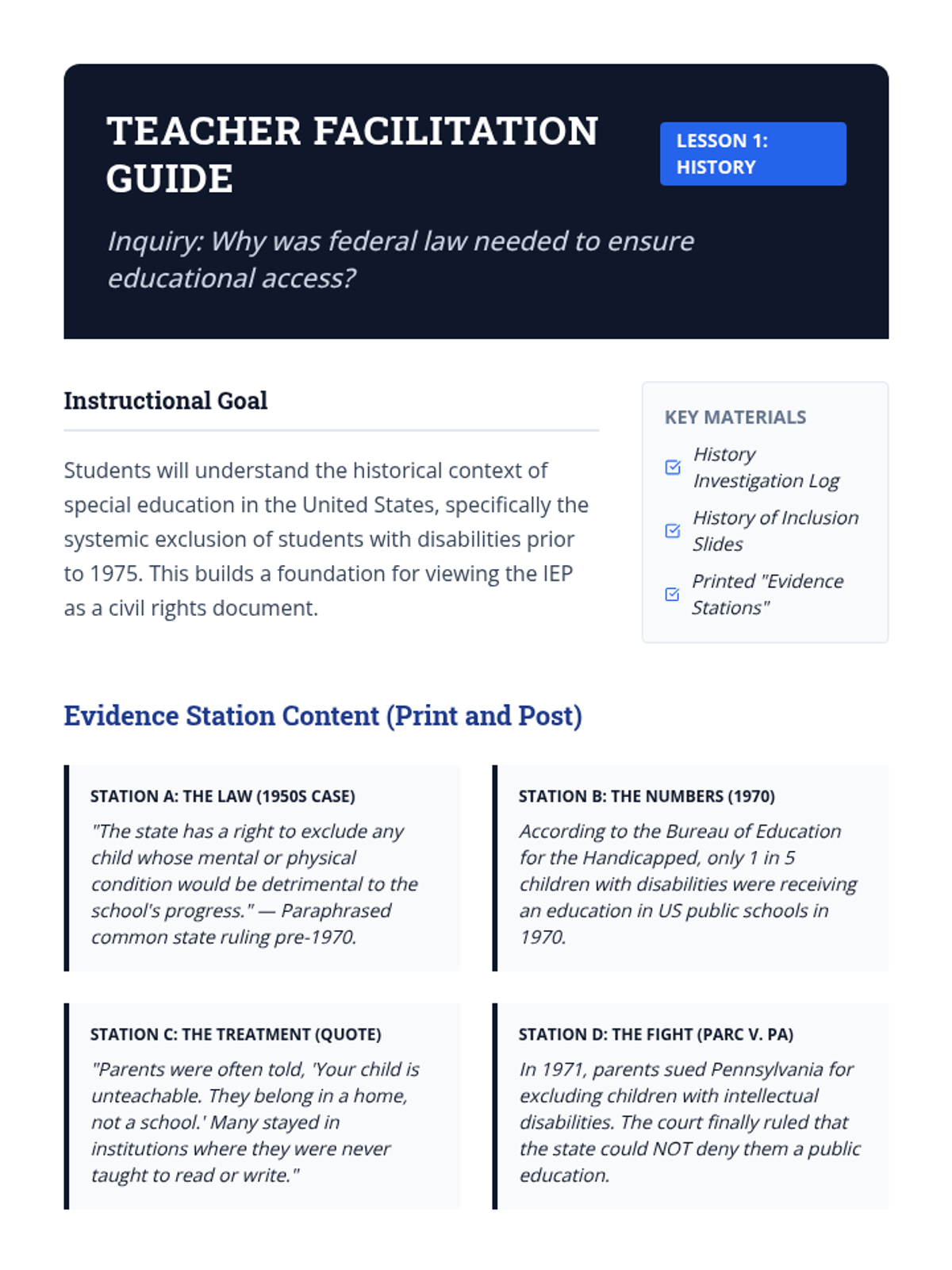 An inquiry-based exploration of the Individuals with Disabilities Education Act (IDEA), focusing on the historical context, civil rights framework, and core mandates like FAPE and LRE. Students investigate education as a civil right and the legal protections afforded to them.