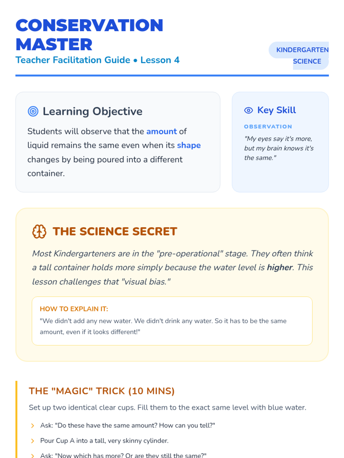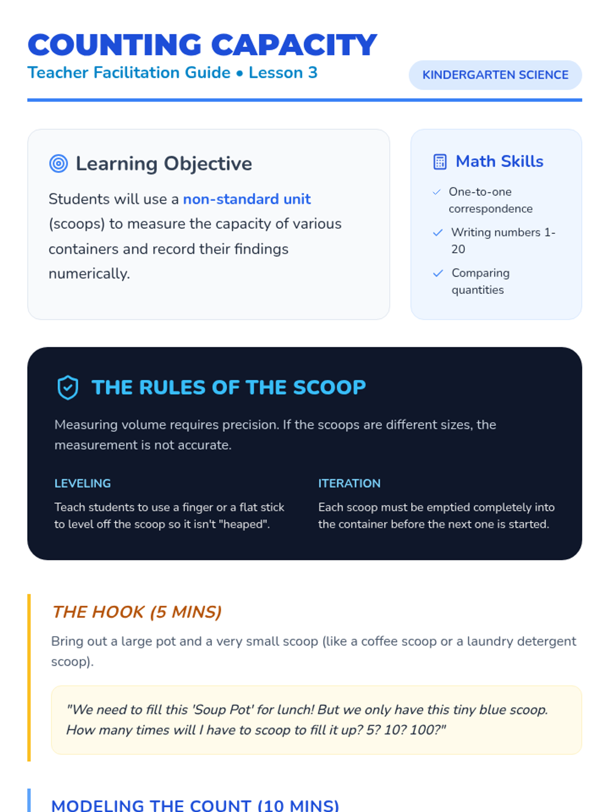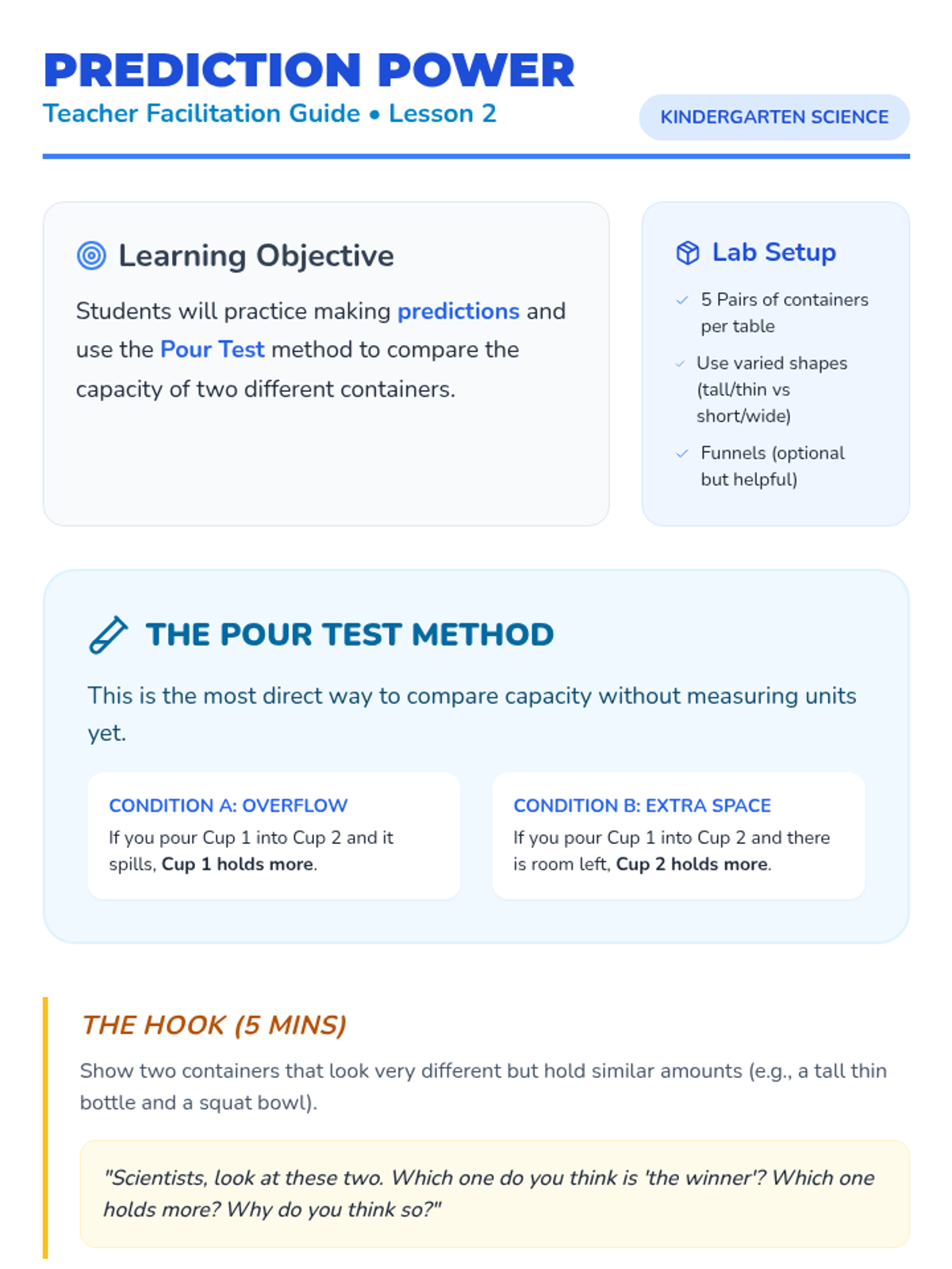 This Kindergarten sequence explores liquid volume and capacity through hands-on water play, estimation games, and direct comparison. Students develop vocabulary for capacity and move from free exploration to structured measuring using non-standard units (scoops).