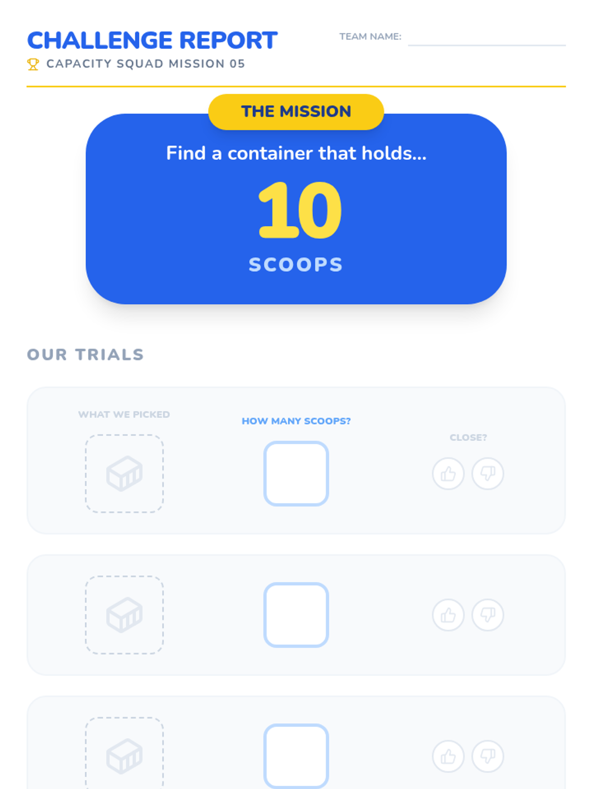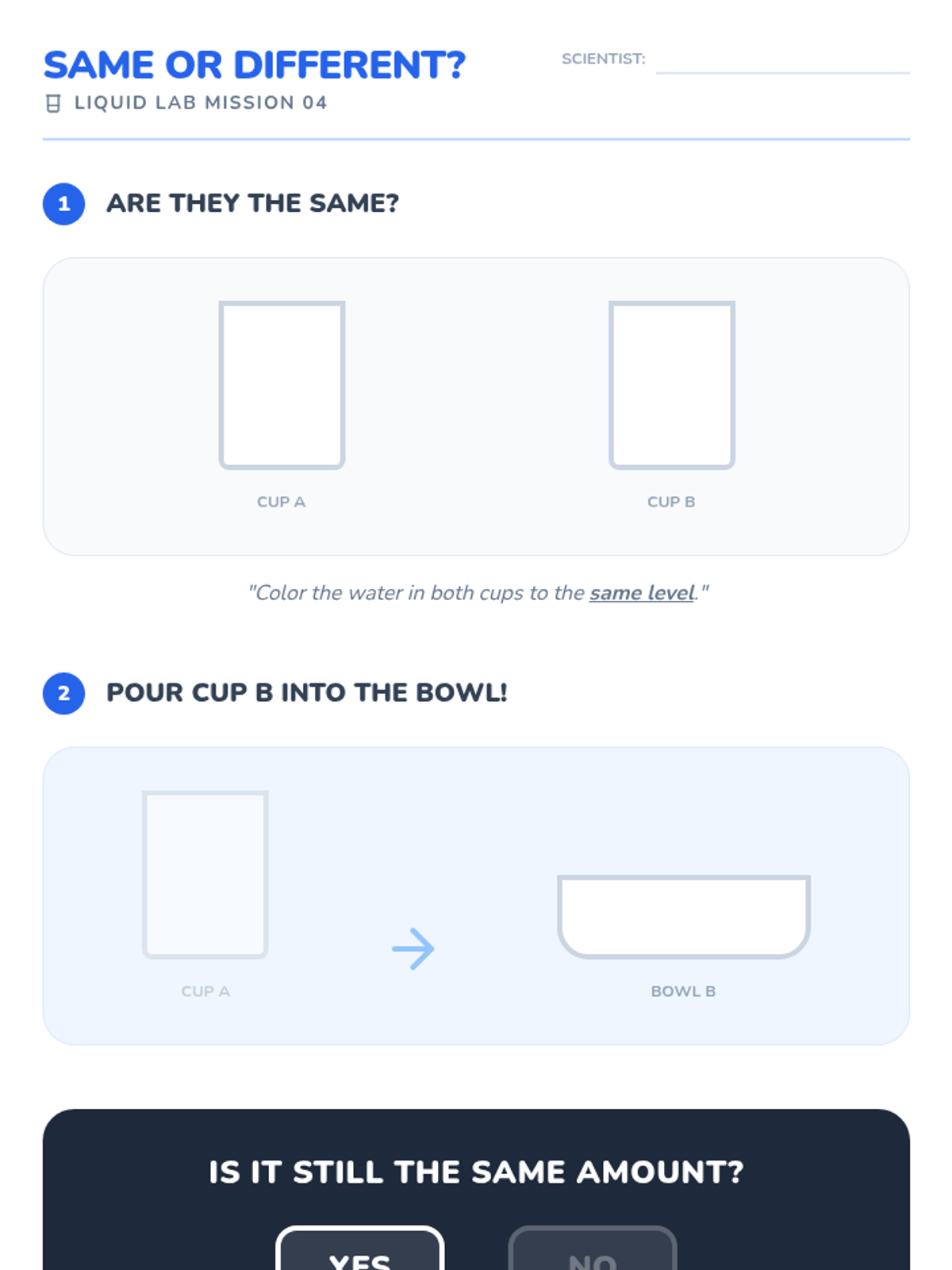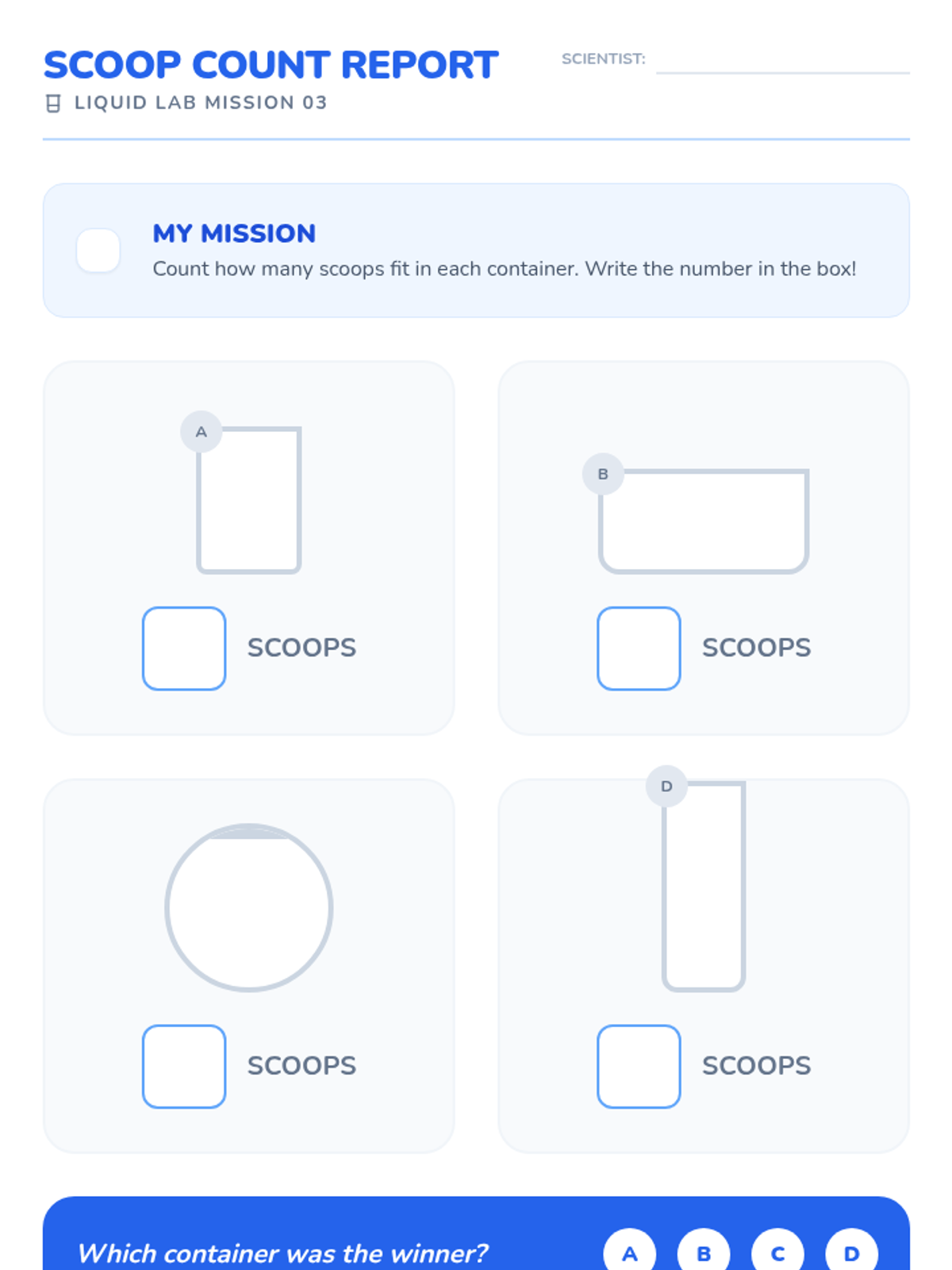 This Kindergarten sequence explores liquid volume and capacity through hands-on water play, estimation games, and direct comparison. Students develop vocabulary for capacity and move from free exploration to structured measuring using non-standard units (scoops).