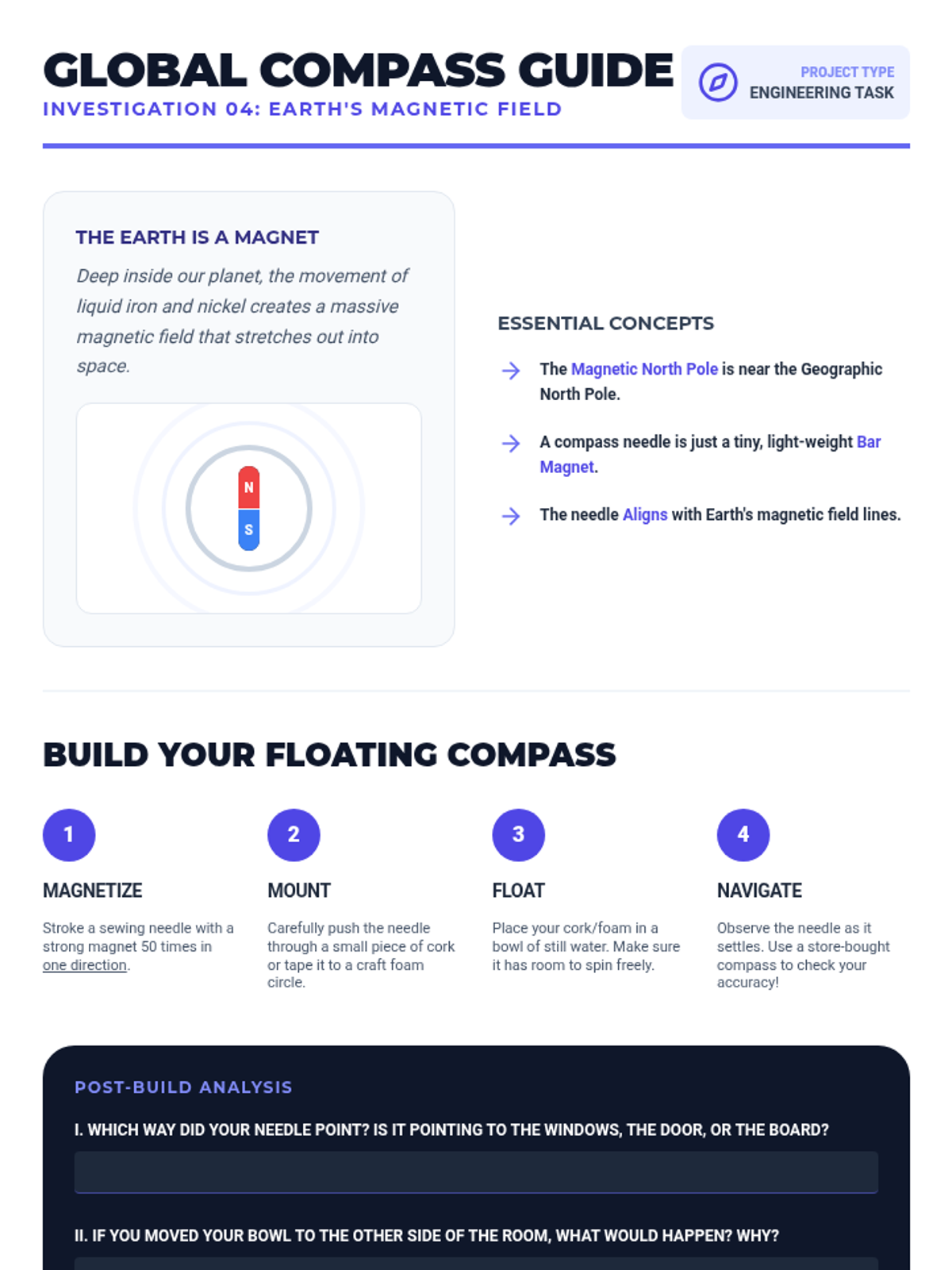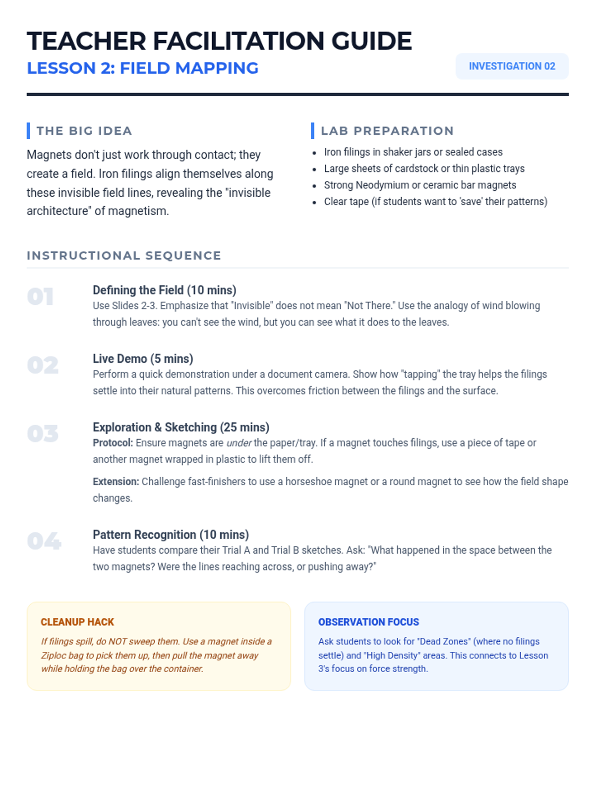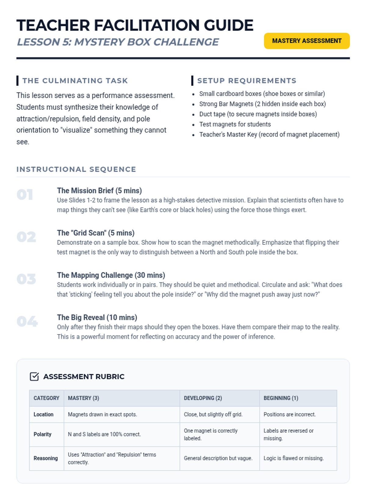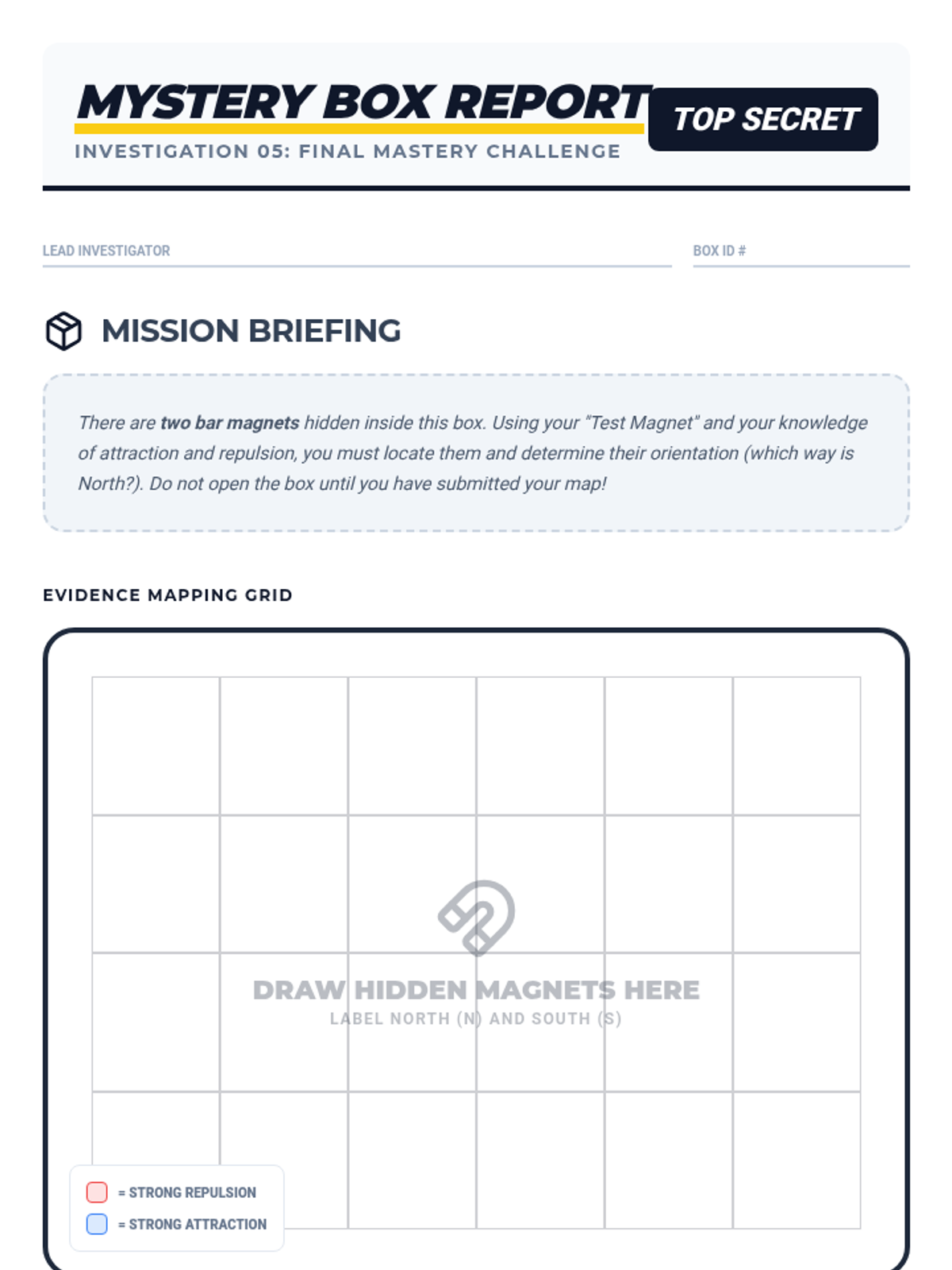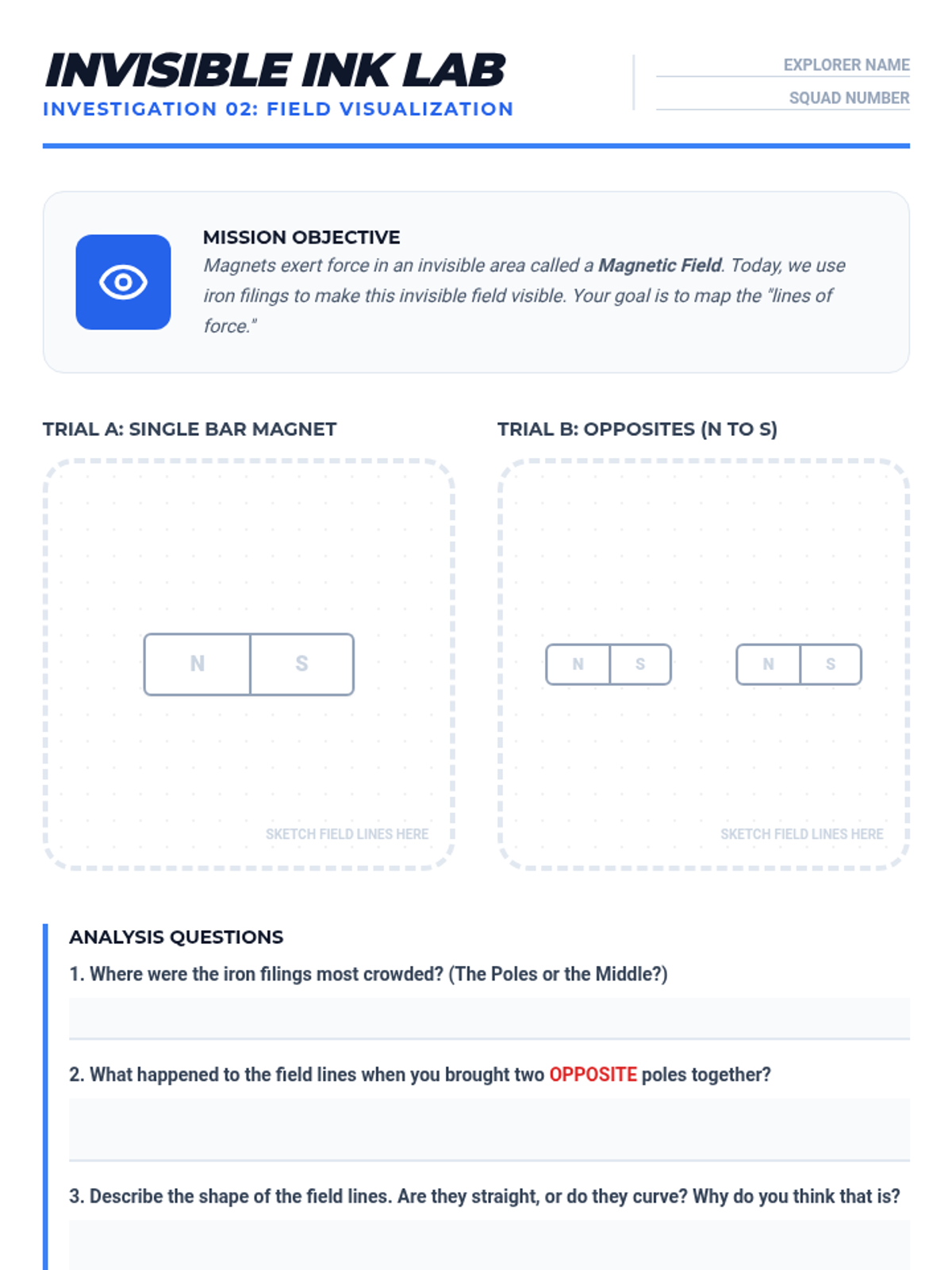 An inquiry-driven 5th-grade physics sequence exploring magnetism through hands-on labs, field mapping, and planetary science. Students move from identifying materials to predicting invisible forces.
